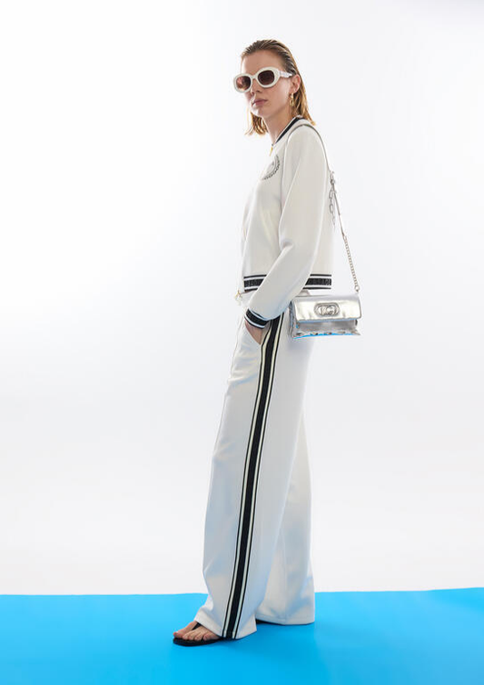 CALÇAS JOGGER BEGE COM RISCA VERTICAL BRANCA - LOLA CASADEMUNT