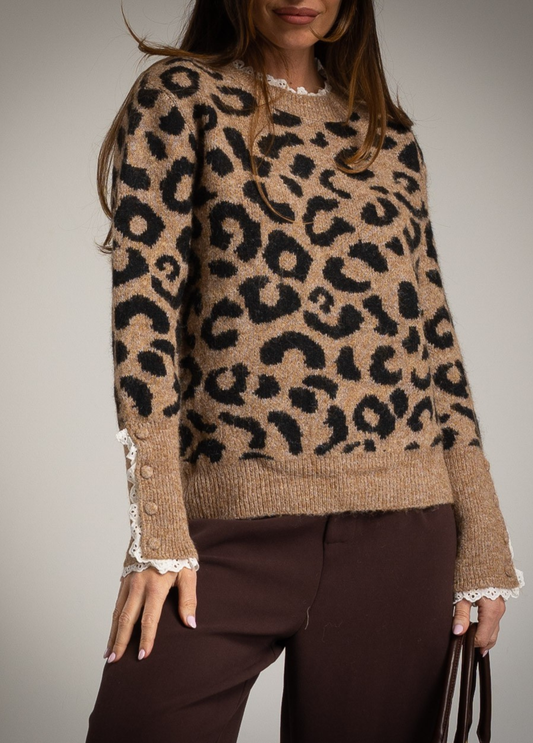 CAMISOLA MALHA ANIMAL PRINT COM PUNHOS EM RENDA E BOTÕES - ALBANOS
