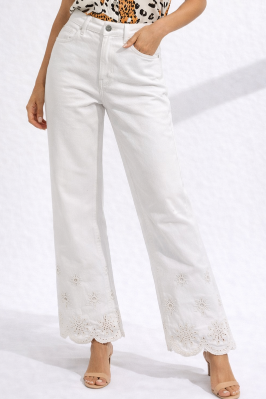 CALÇAS DE GANGA BRANCAS COM BORDADO NA BAINHA - ALIBY