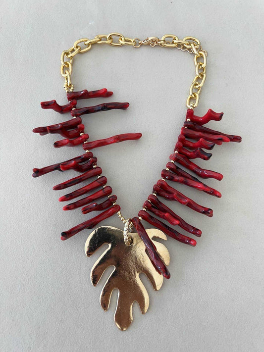 COLAR CORRENTE DOURADA COM CORAIS VERMELHOS E PENDENTE FOLHA - ALIBY