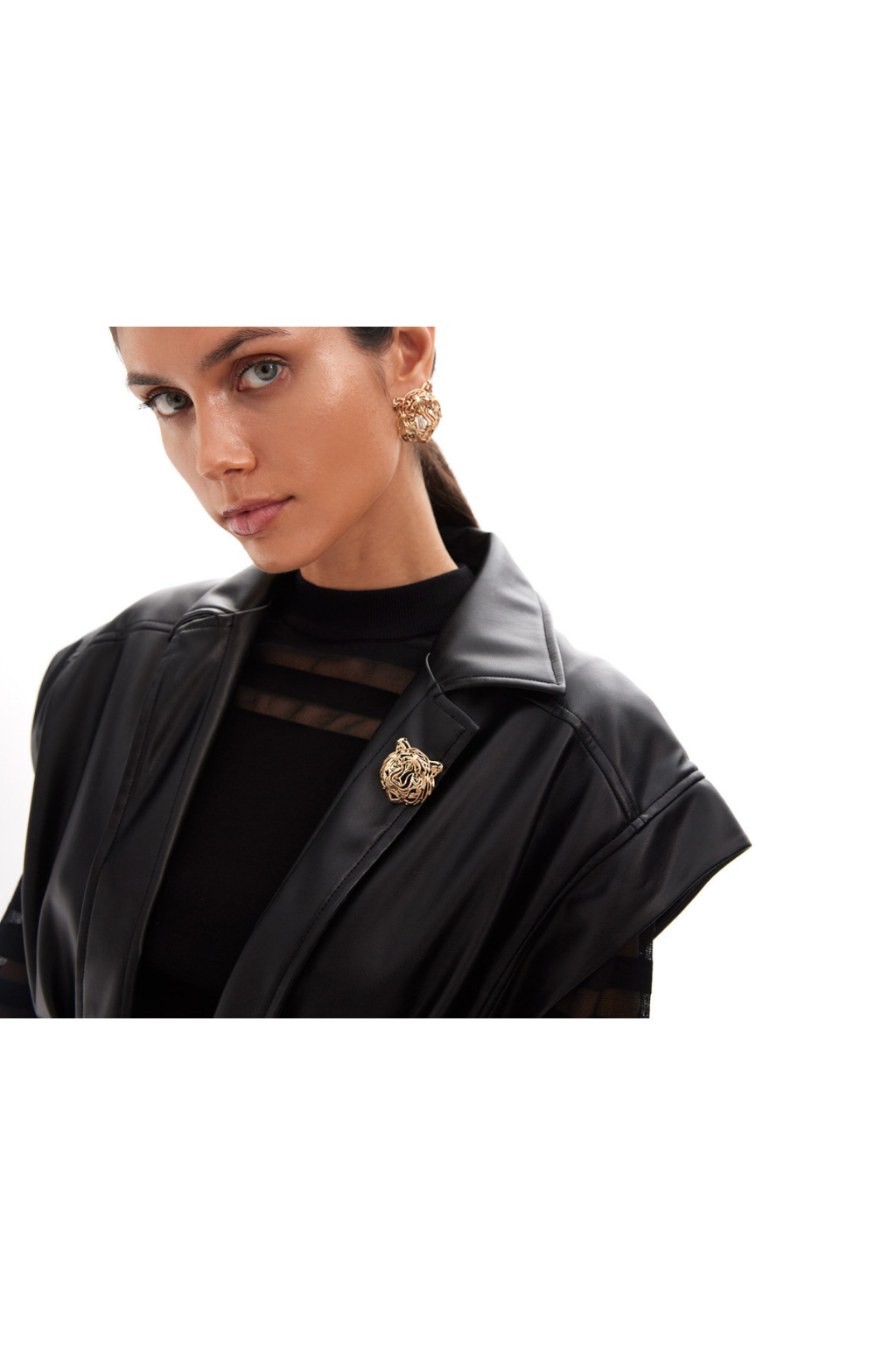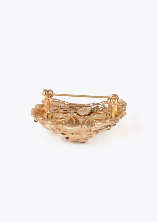 Broche dourado em forma de cabeça de tigre com acabamento texturizado. Apresenta detalhes em relevo que adicionam sofisticação ao design. Fecho de pino seguro.