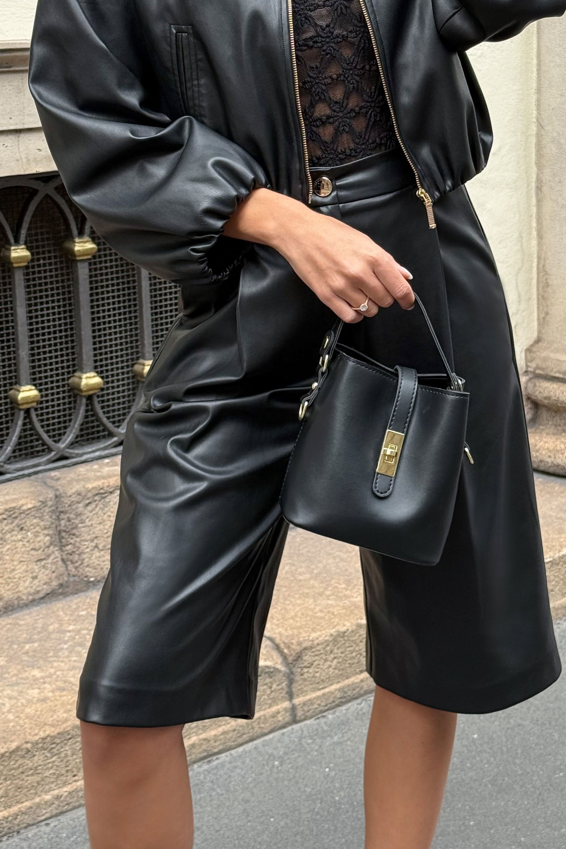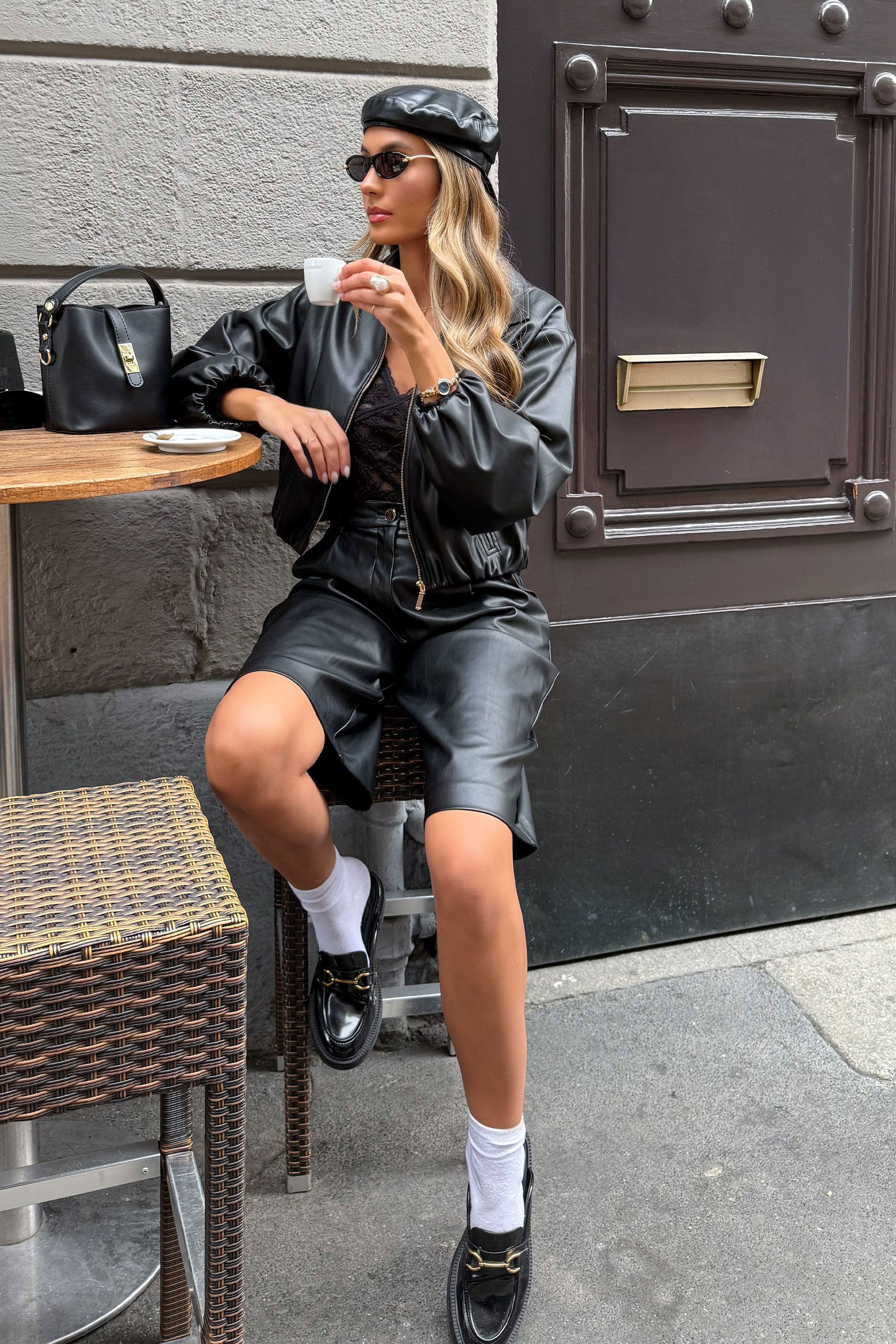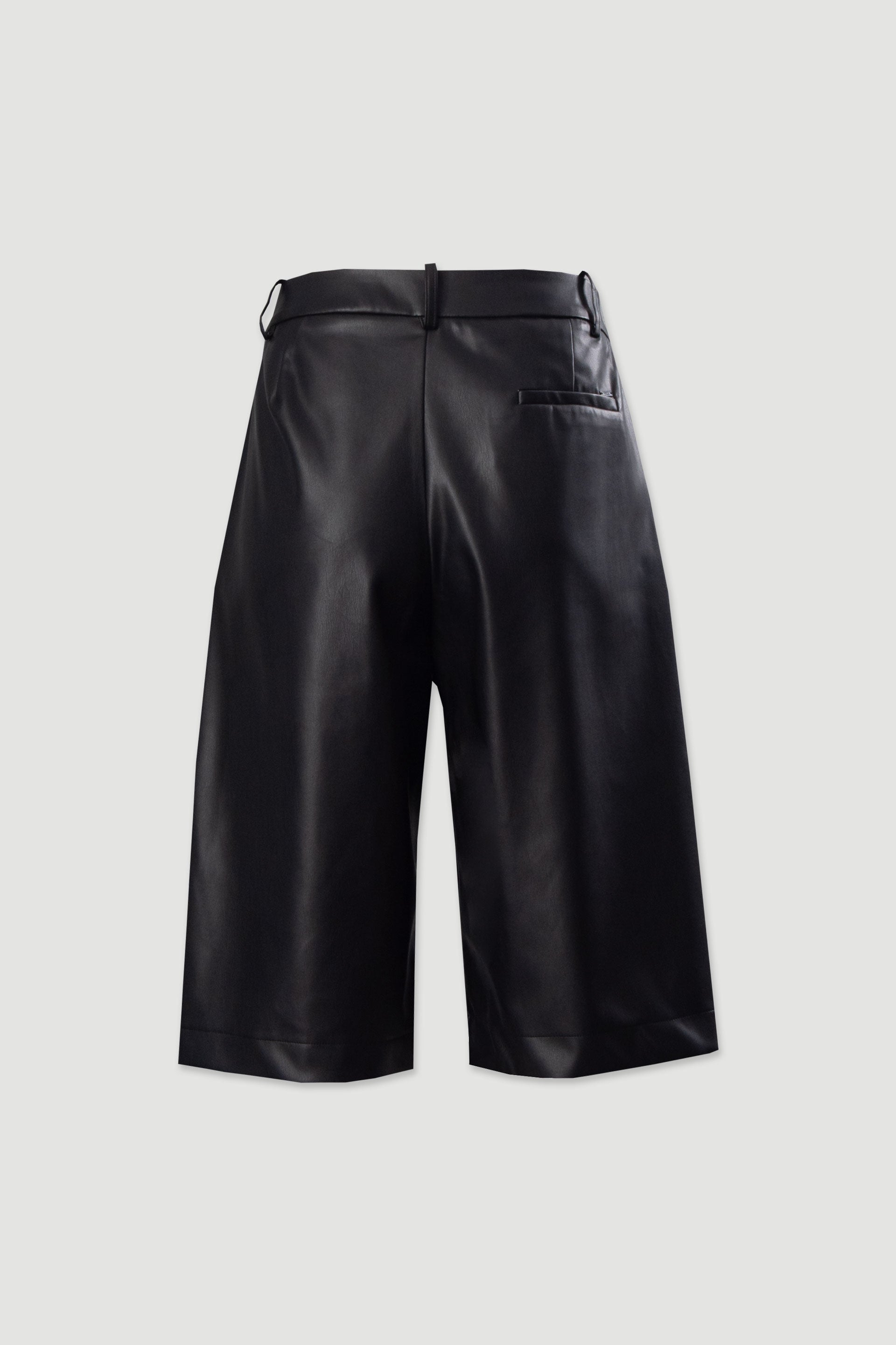 Bermuda de cintura subida em polipele macia, com pinças frontais que conferem estrutura e elegância. O design midi e o corte amplo criam um equilíbrio perfeito entre sofisticação e ousadia. Ideal para composições urbanas e modernas, pode ser combinada com camisas clássicas ou blusões descontraídos para um look contemporâneo.