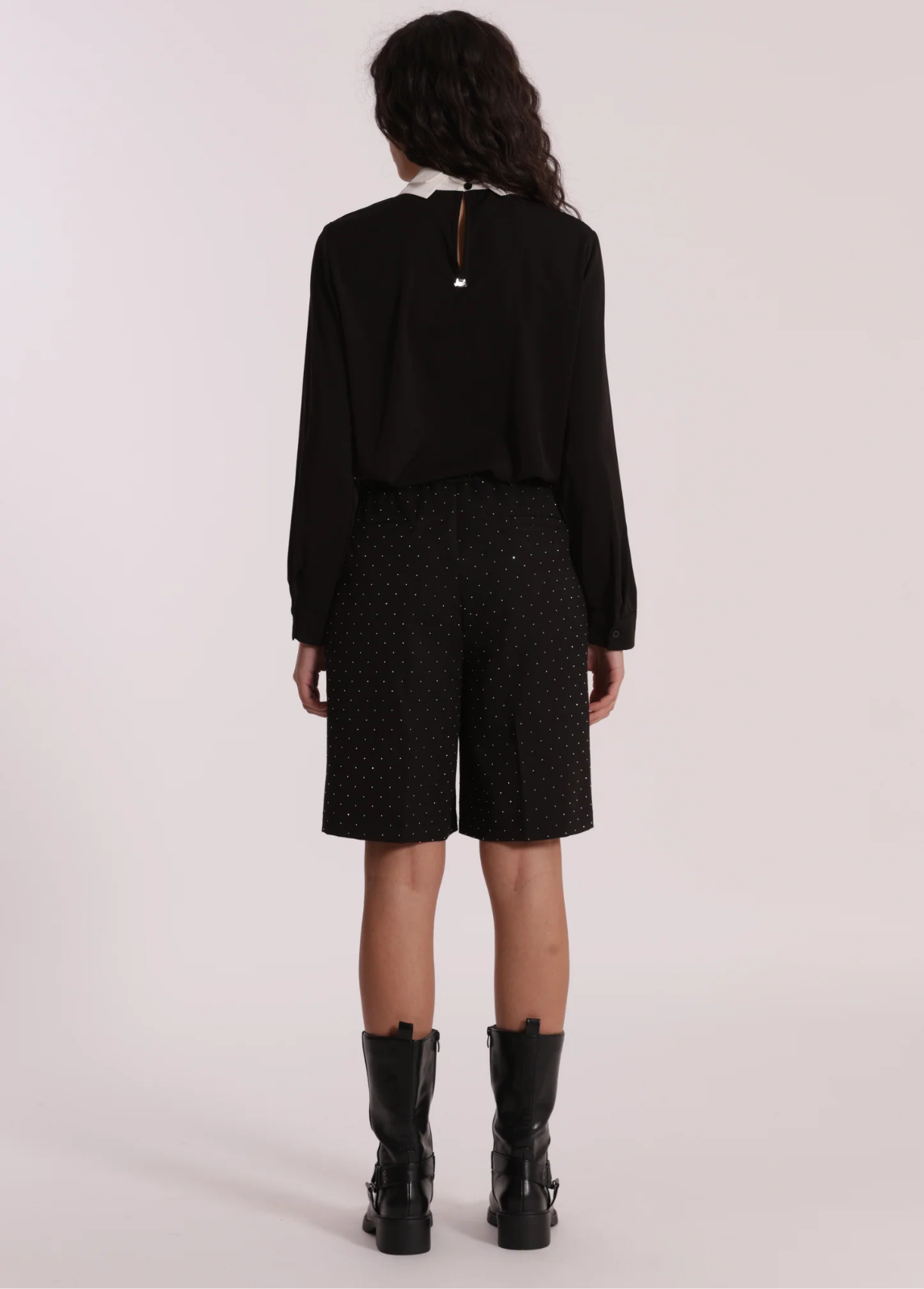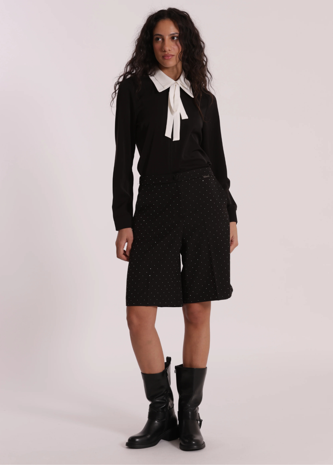 Bermudas sofisticadas em tom preto com aplicação de strass delicado, que acrescenta brilho subtil e um toque feminino à peça. De corte reto e comprimento pelo joelho, oferecem um caimento elegante e confortável. Versáteis, podem ser usadas tanto em looks mais formais com blusas e blazers, como em combinações modernas com malhas ou camisas, ideais para o dia ou para a noite.