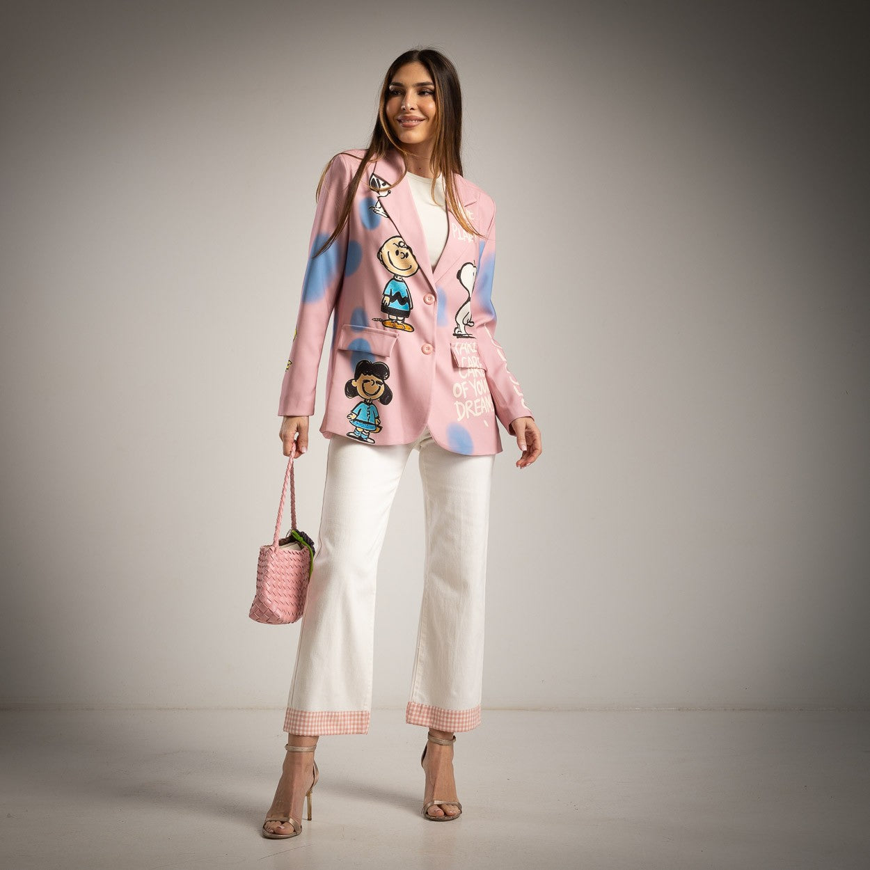 Blazer de corte clássico com estampa Snoopy que combina sofisticação com um toque lúdico e descontraído. Peça versátil da Albano's, ideal para criar looks modernos que transitam entre o casual e o formal. O design impresso traz personalidade ao guarda-roupa, permitindo múltiplas combinações com peças básicas ou mais ousadas. Perfeito para quem busca elegância com carácter e originalidade.