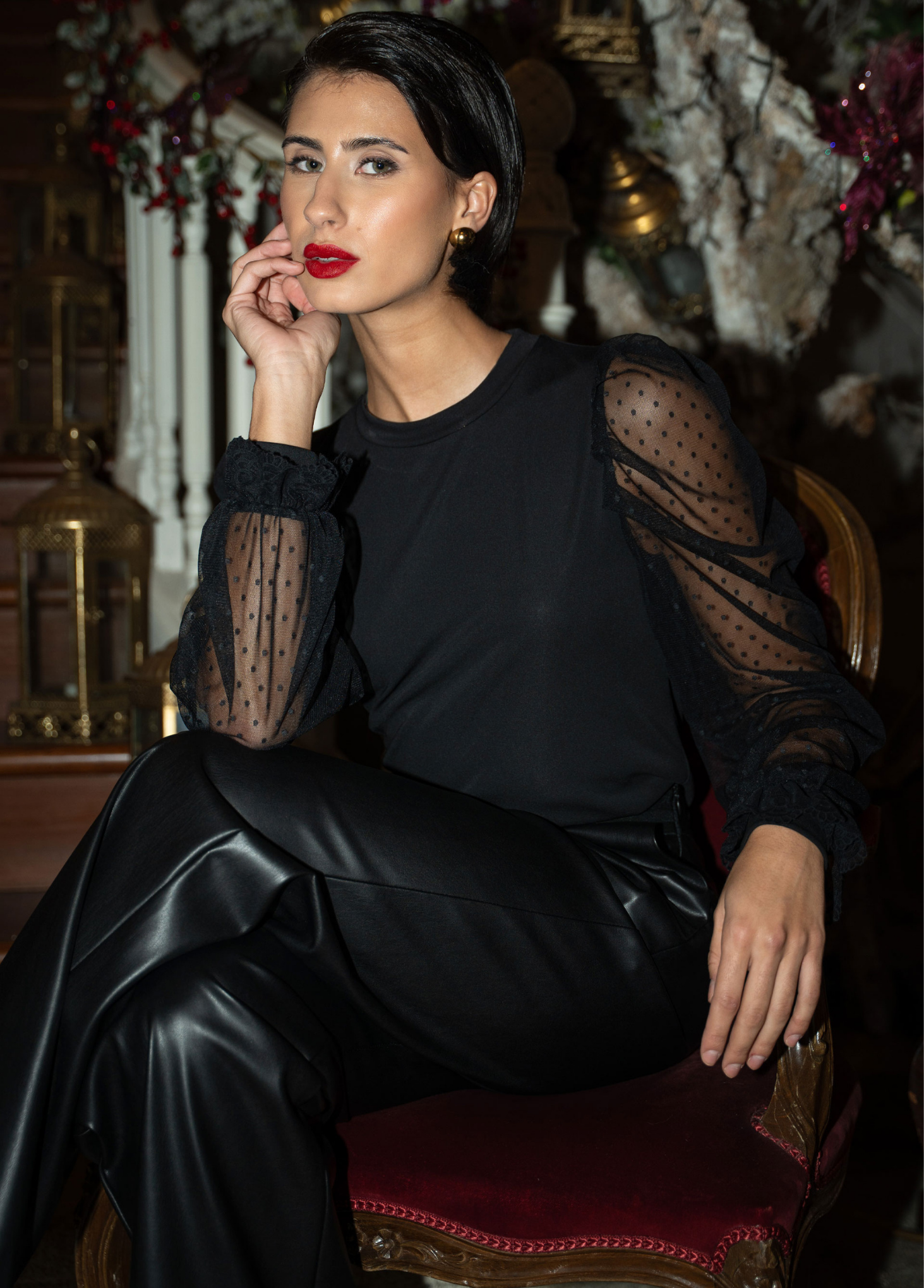 Blusa de manga comprida com corpo em malha lisa e mangas em tule plumeti transparente. O detalhe franzido nas mangas cria volume e elegância, enquanto o punho com folho acrescenta um toque feminino ao design. Uma peça moderna e versátil, perfeita para elevar coordenados de dia ou noite.