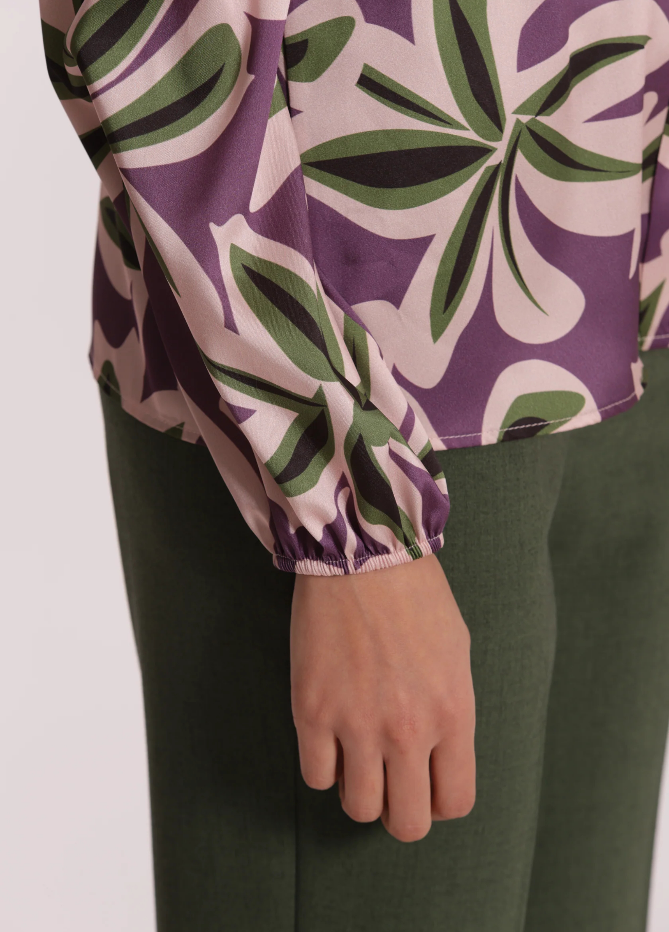 Blusa de manga comprida em tecido leve, com padrão floral abstrato em roxo, verde e bege. O modelo apresenta decote em V com gola estruturada e punhos elásticos, garantindo um caimento confortável e moderno. Uma peça versátil que combina estilo sofisticado com um toque descontraído.