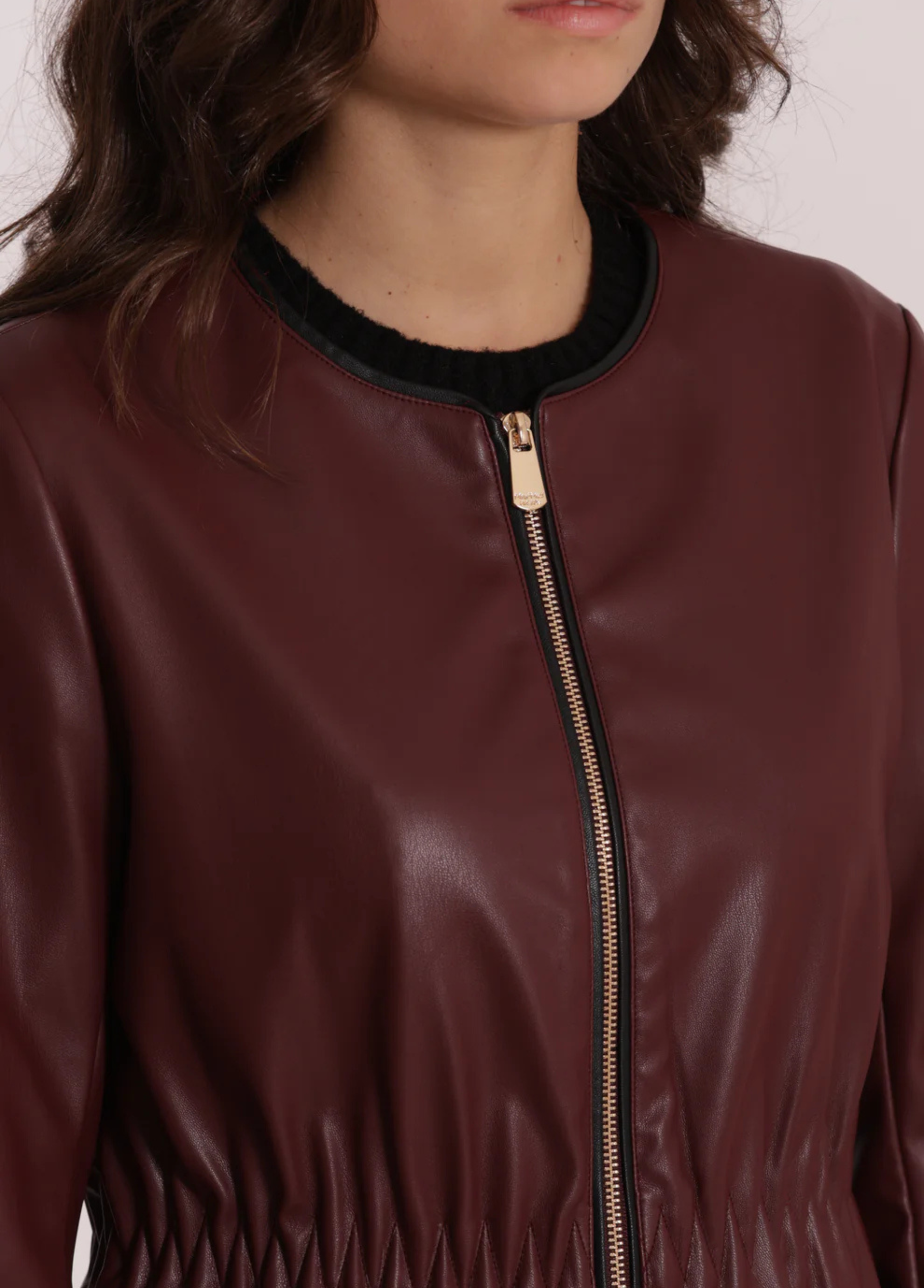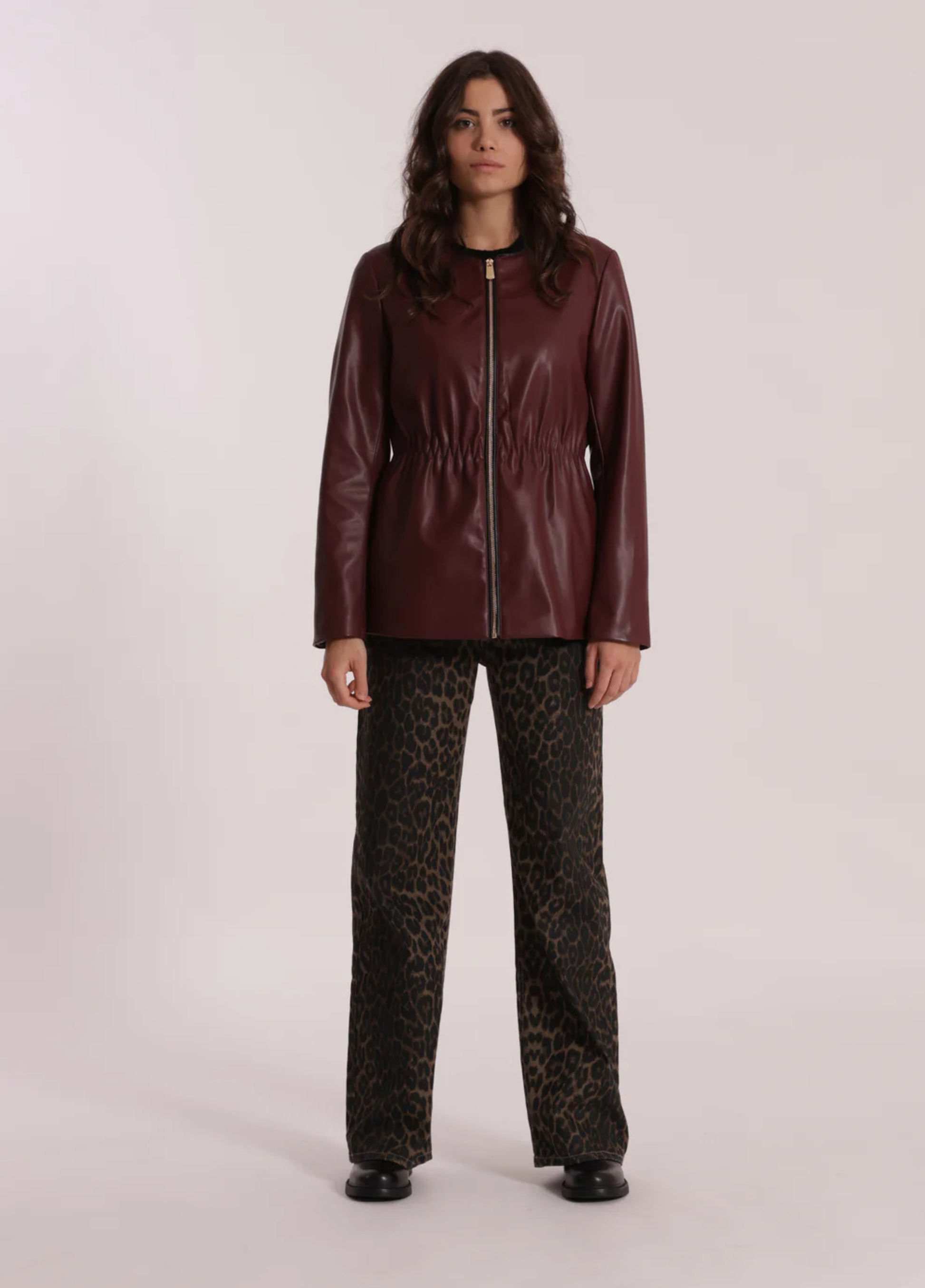 Blusão tipo jaqueta em ecopele com franzido na cintura, fecho zíper com pormenor em ecopele também e forro animal print.