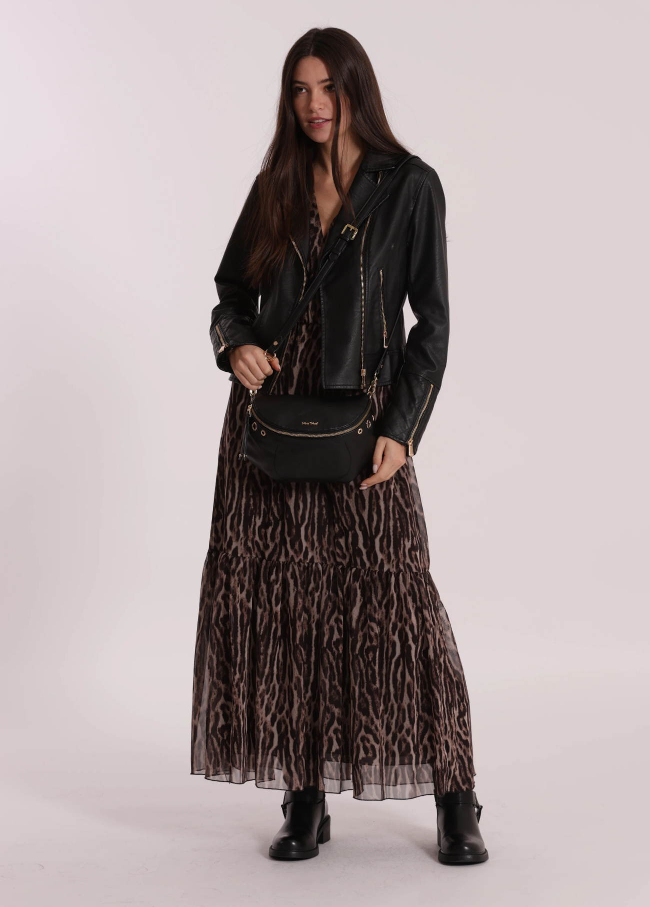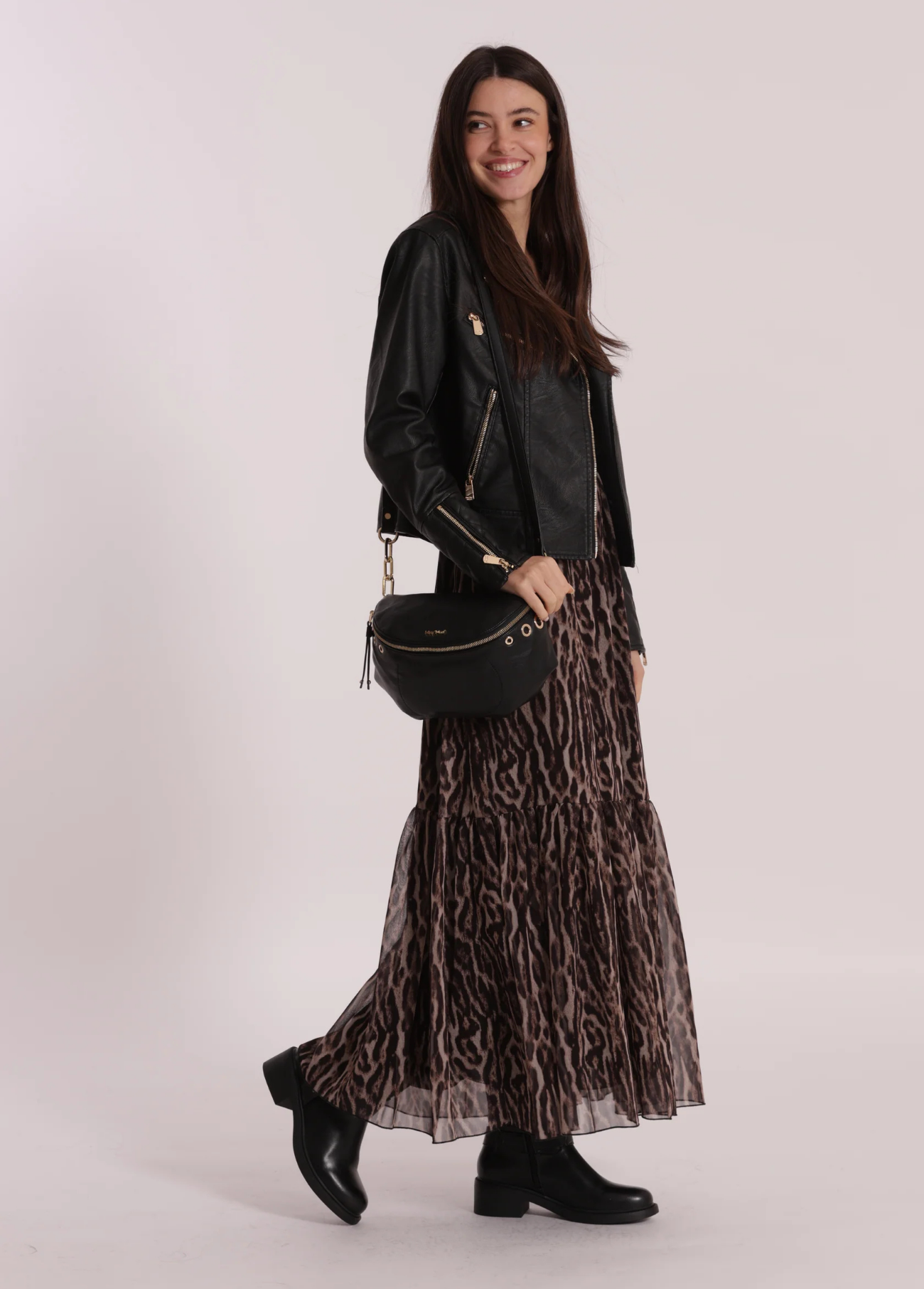 Mala tiracolo estilo pochete disponível em quatro cores — preto, castanho, verde e camel. Fabricada em pele sintética macia, com fecho de correr metálico e alças ajustáveis, combina praticidade com um design moderno e versátil. Os detalhes em dourado acrescentam sofisticação, tornando-a ideal tanto para o dia a dia como para ocasiões casuais elegantes.