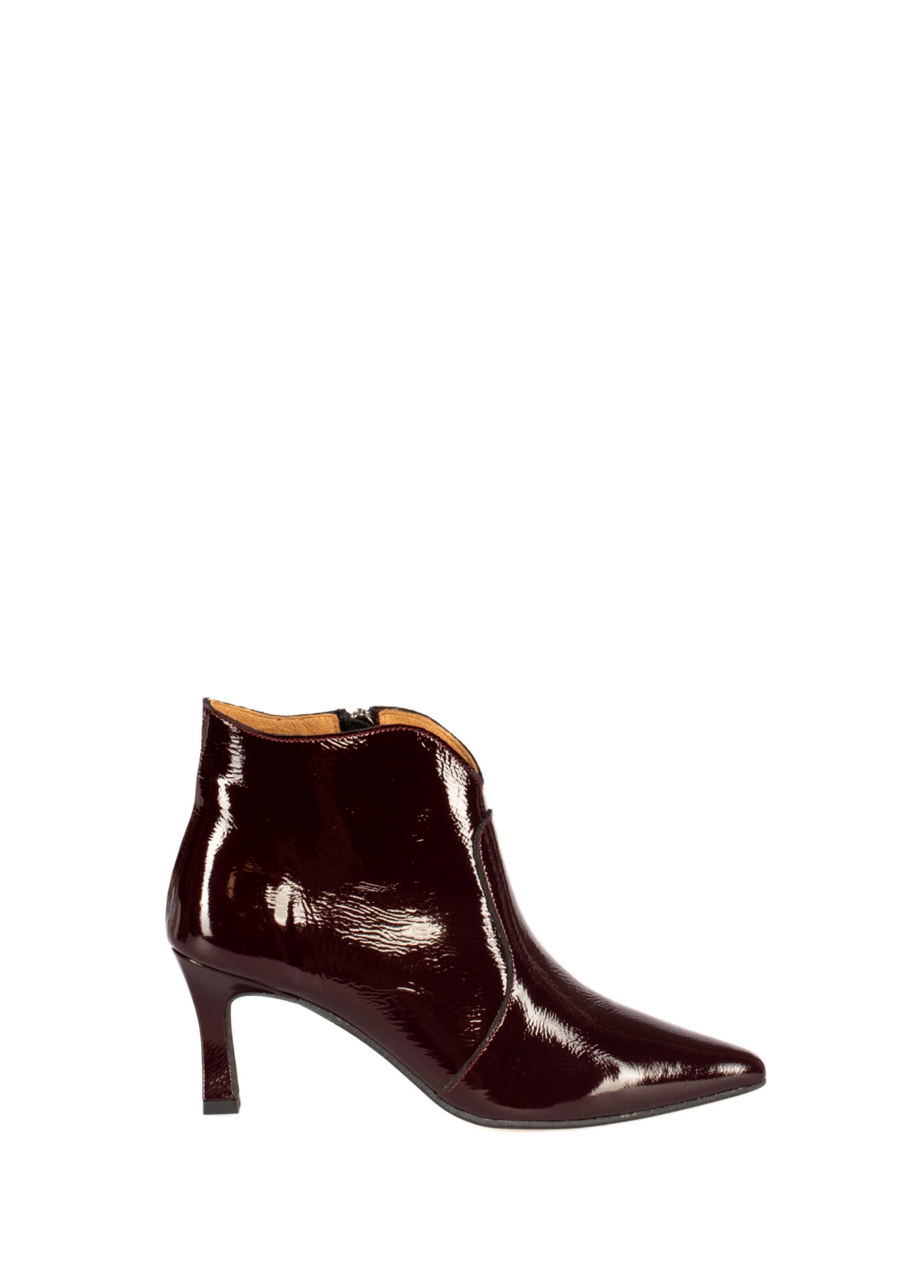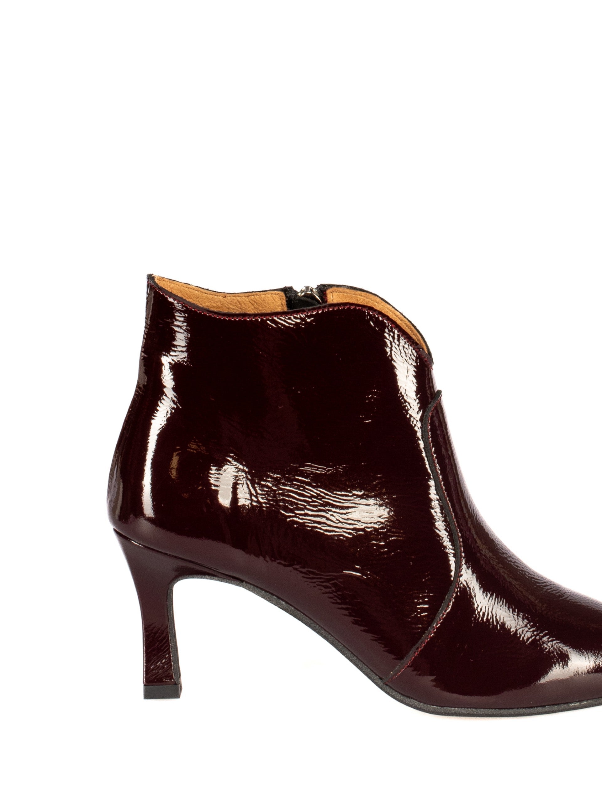 Botim em verniz de salto alto. Apresenta design de forma bicuda e fecho para facilitar o calçar. Fabricado em Portugal.