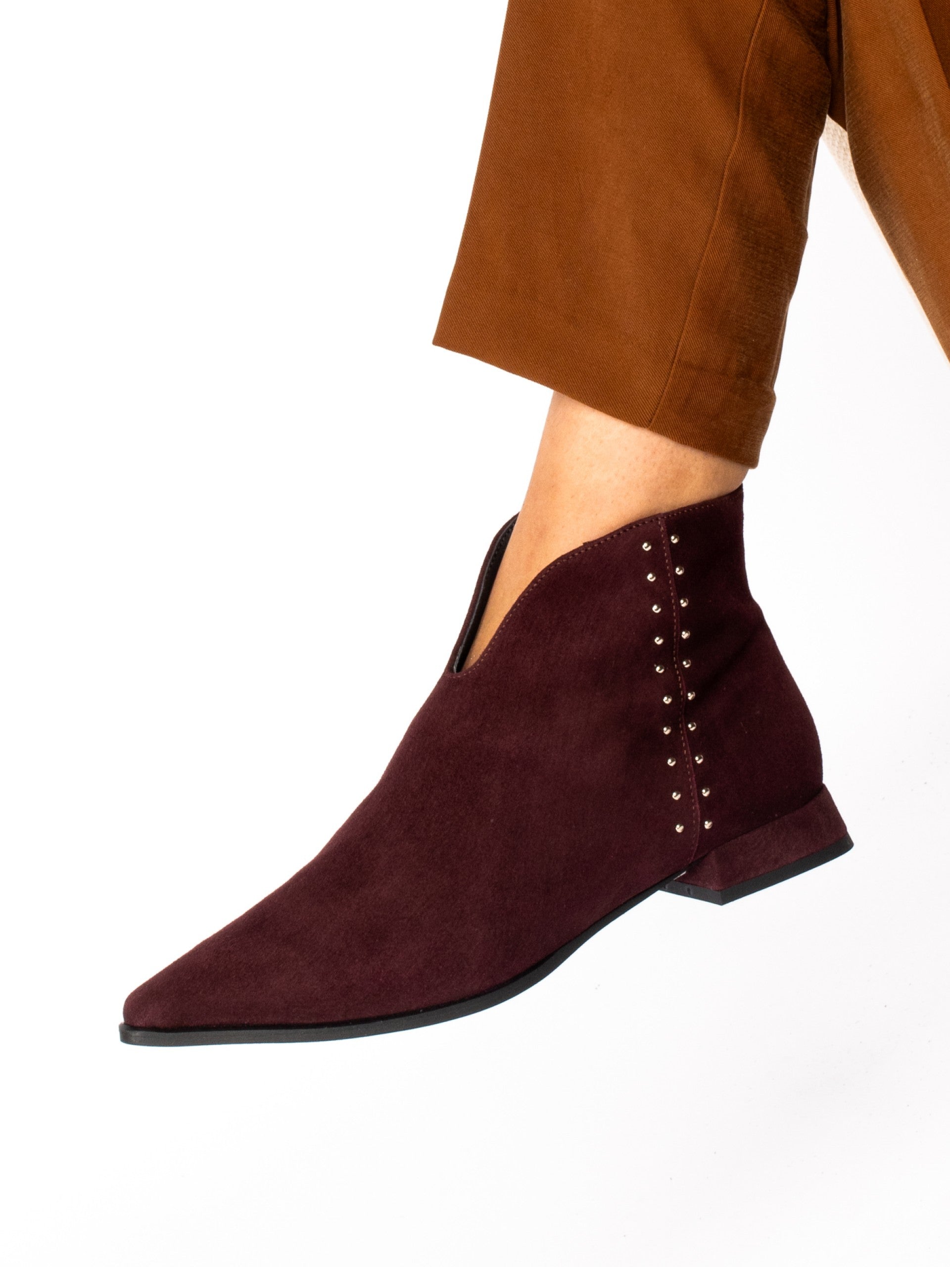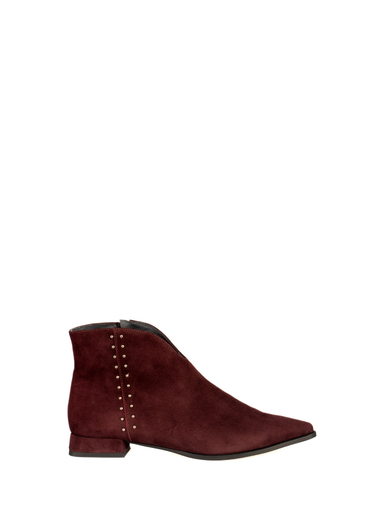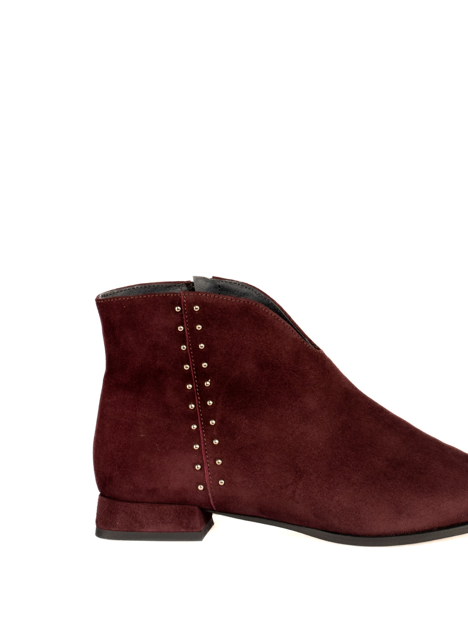Botim curto, em camurça. Apresenta um design de decote e tachas. Salto baixo. Fecho interior, para facilitar no calçar. Fabricado em Portugal.