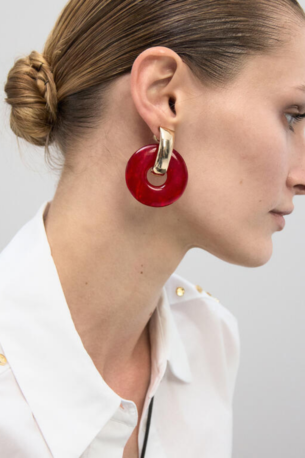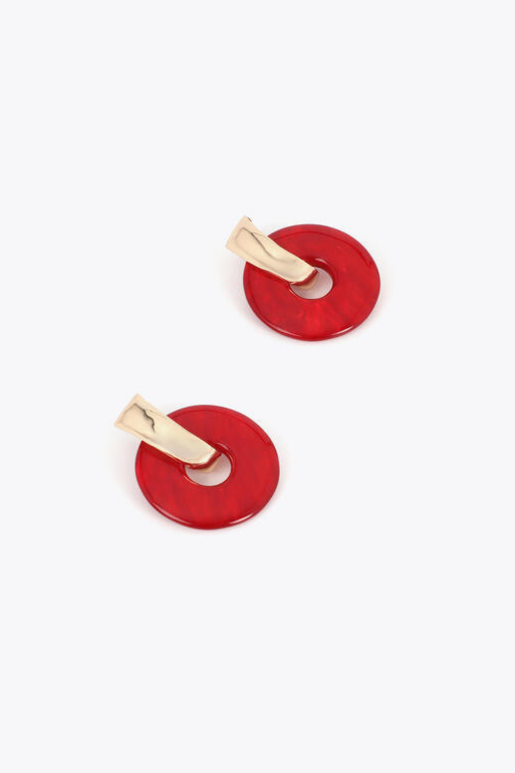 Brincos de design moderno com discos acrílicos vermelhos e detalhes metálicos dourados. Fecho de rosca seguro. Perfeitos para adicionar um toque de cor a qualquer visual. Leves e confortáveis para uso prolongado.