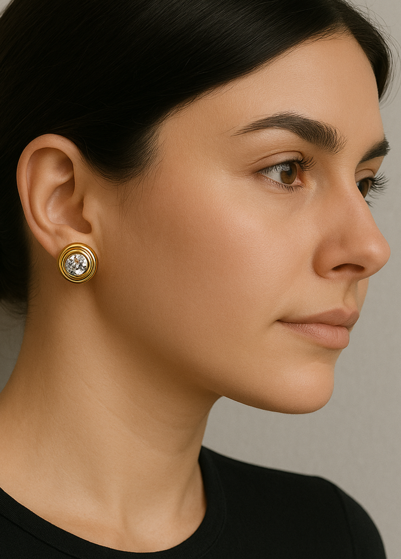 Brincos dourados em aço inoxidável com formato de rosa e brilho ao meio da marca nacional Bastta.
