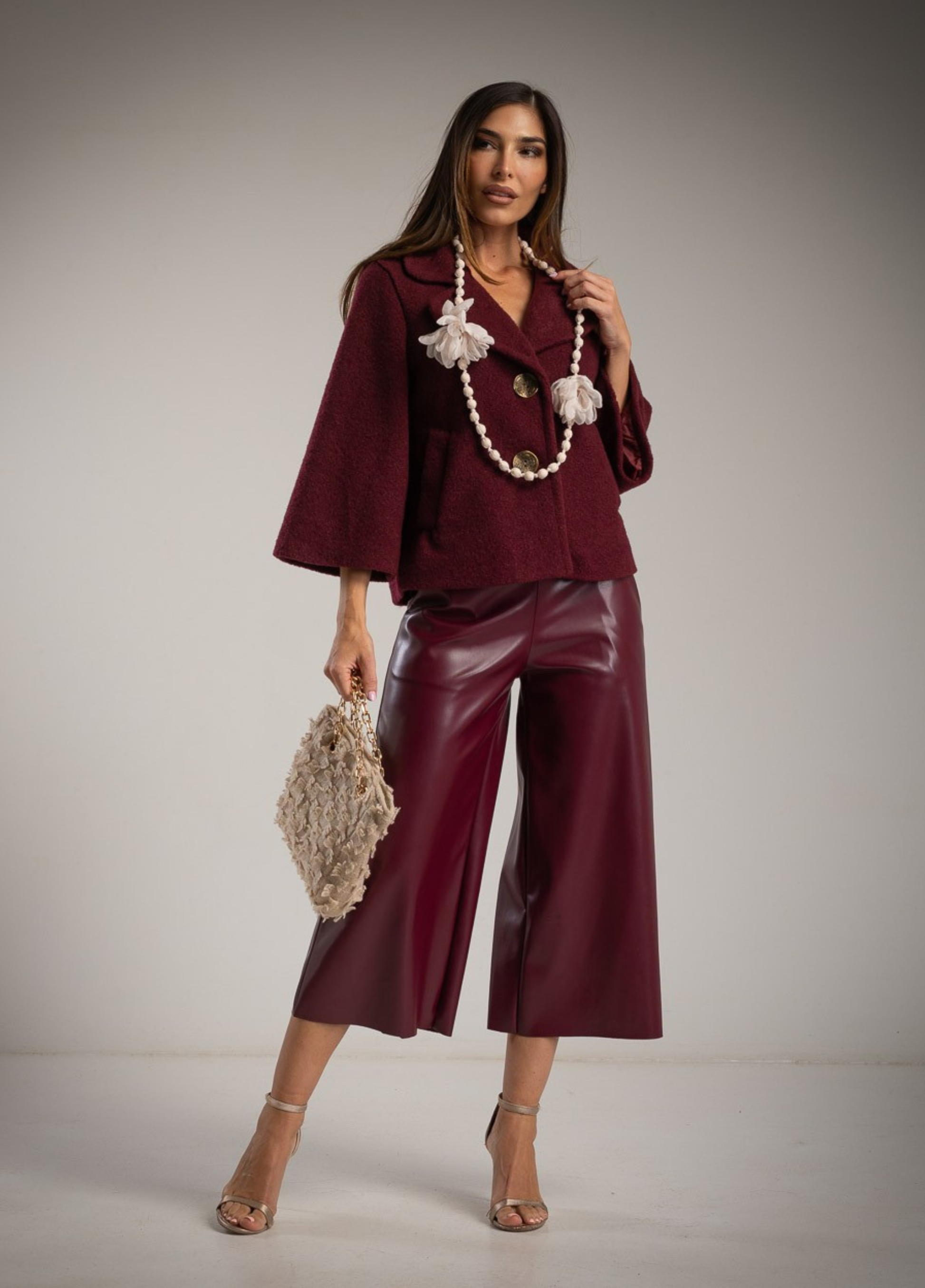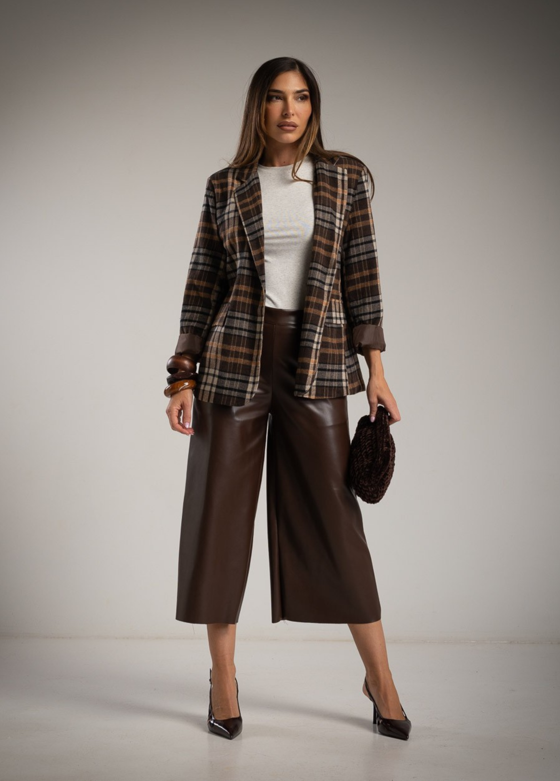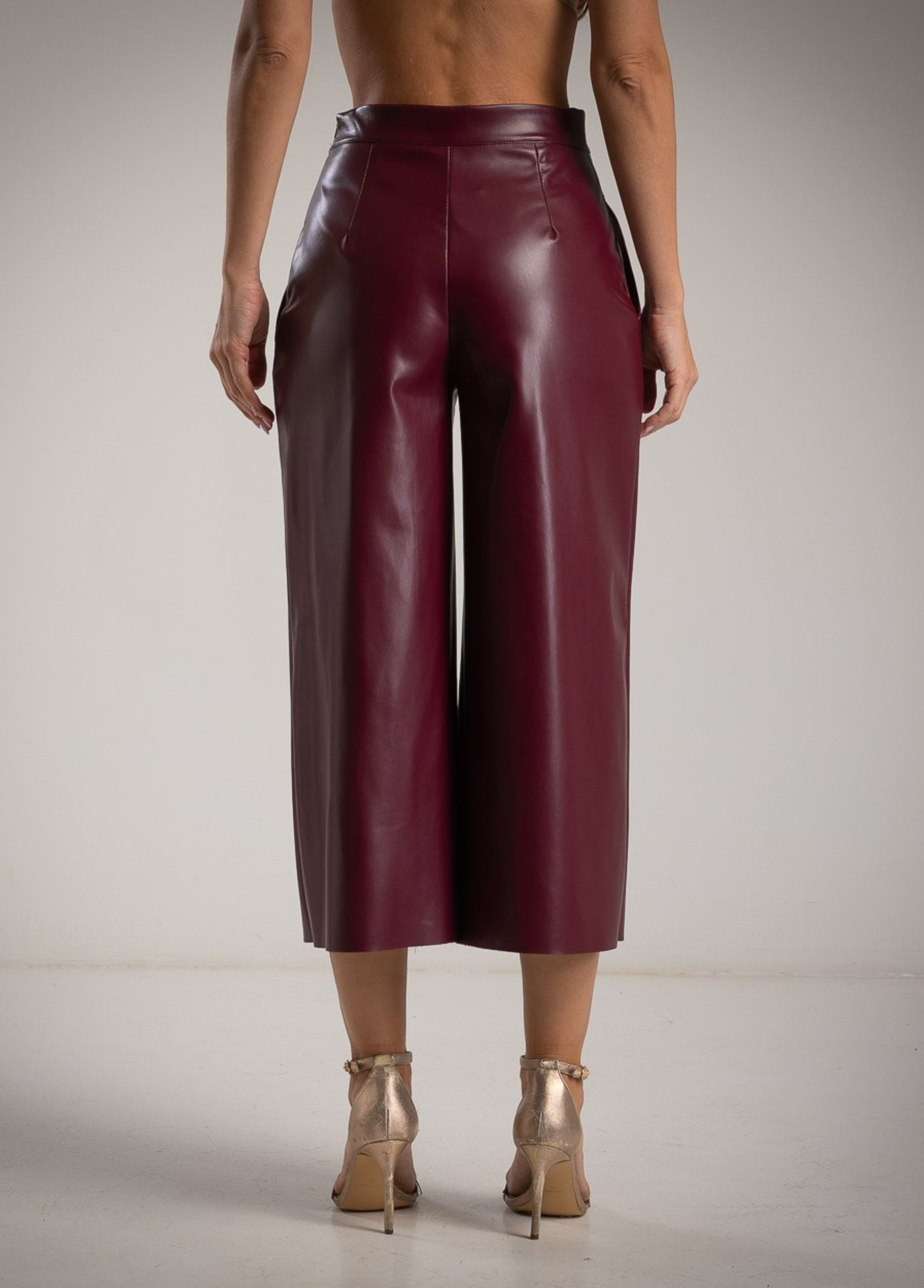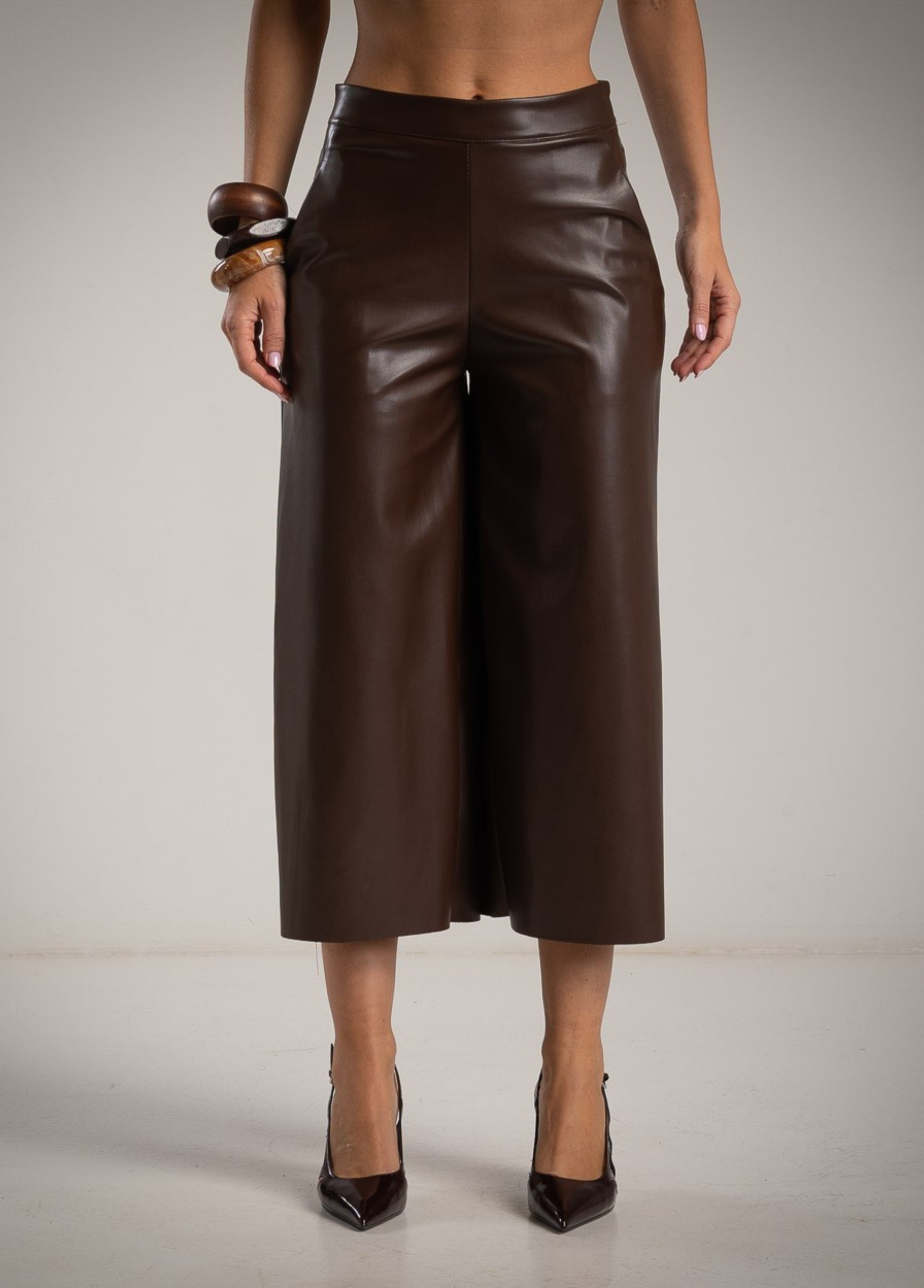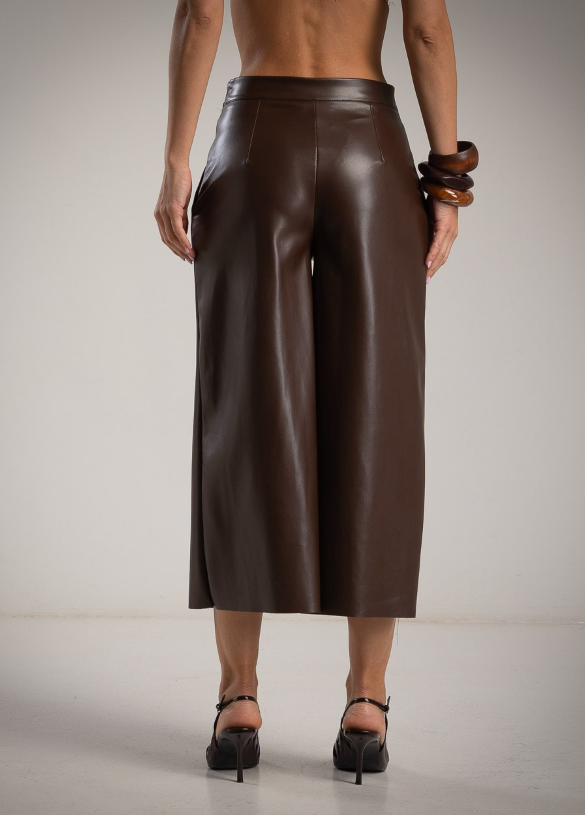 Calças culotte em efeito pele com acabamento acetinado e toque suave. O corte largo e cropped confere um visual moderno e elegante, ideal para coordenar com casacos estruturados ou malhas volumosas. A cintura alta e o tecido com leve elasticidade garantem conforto e estilo em qualquer ocasião.