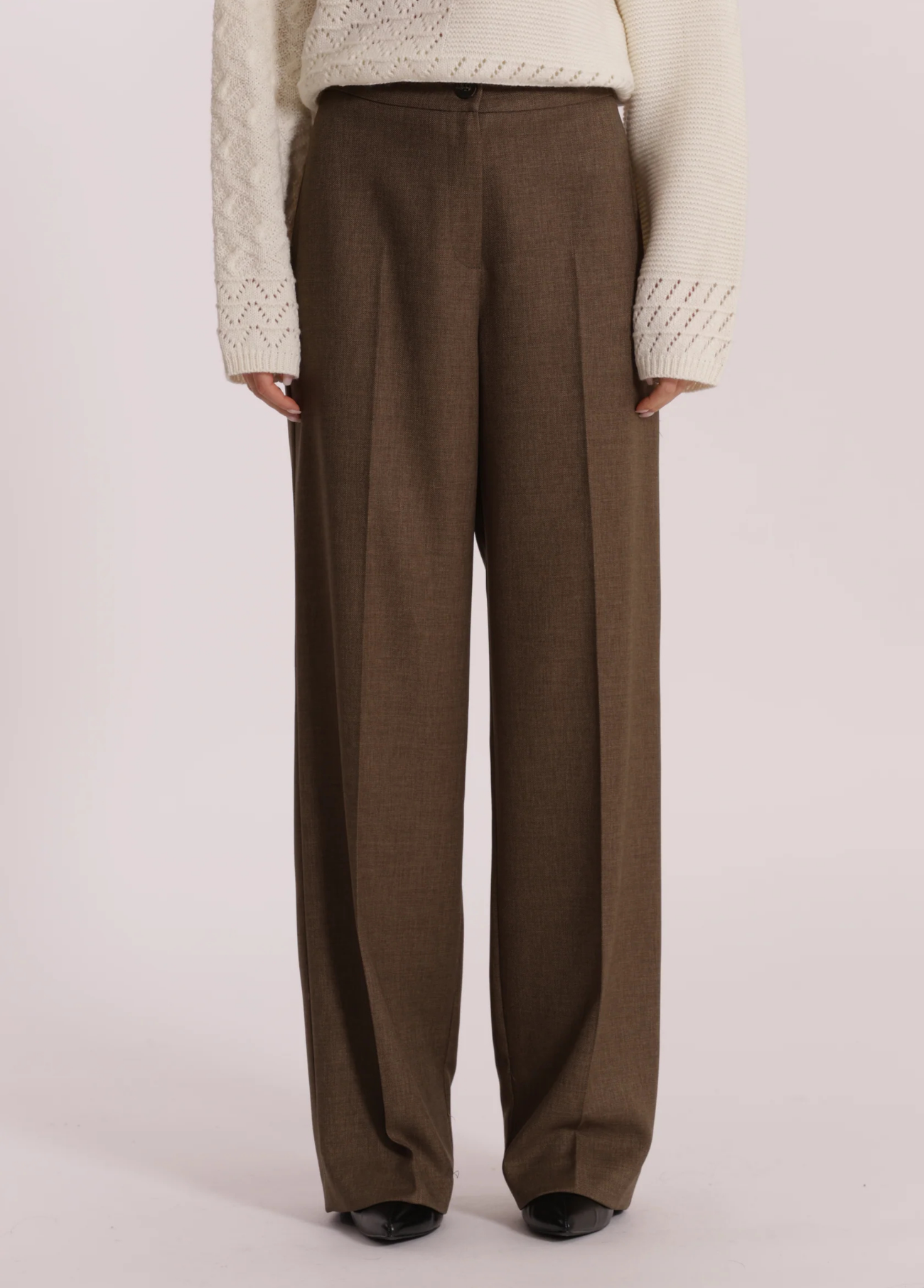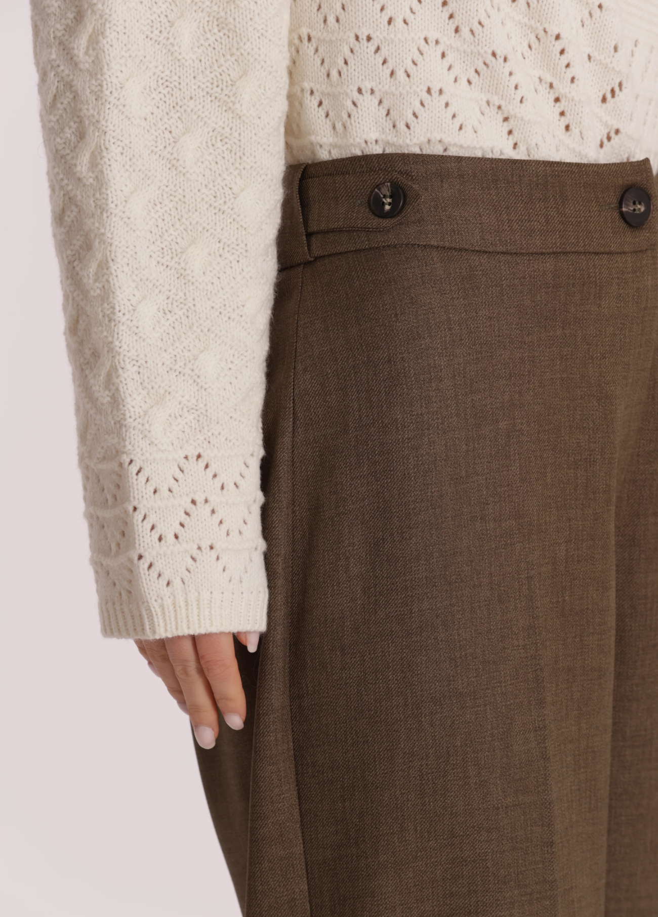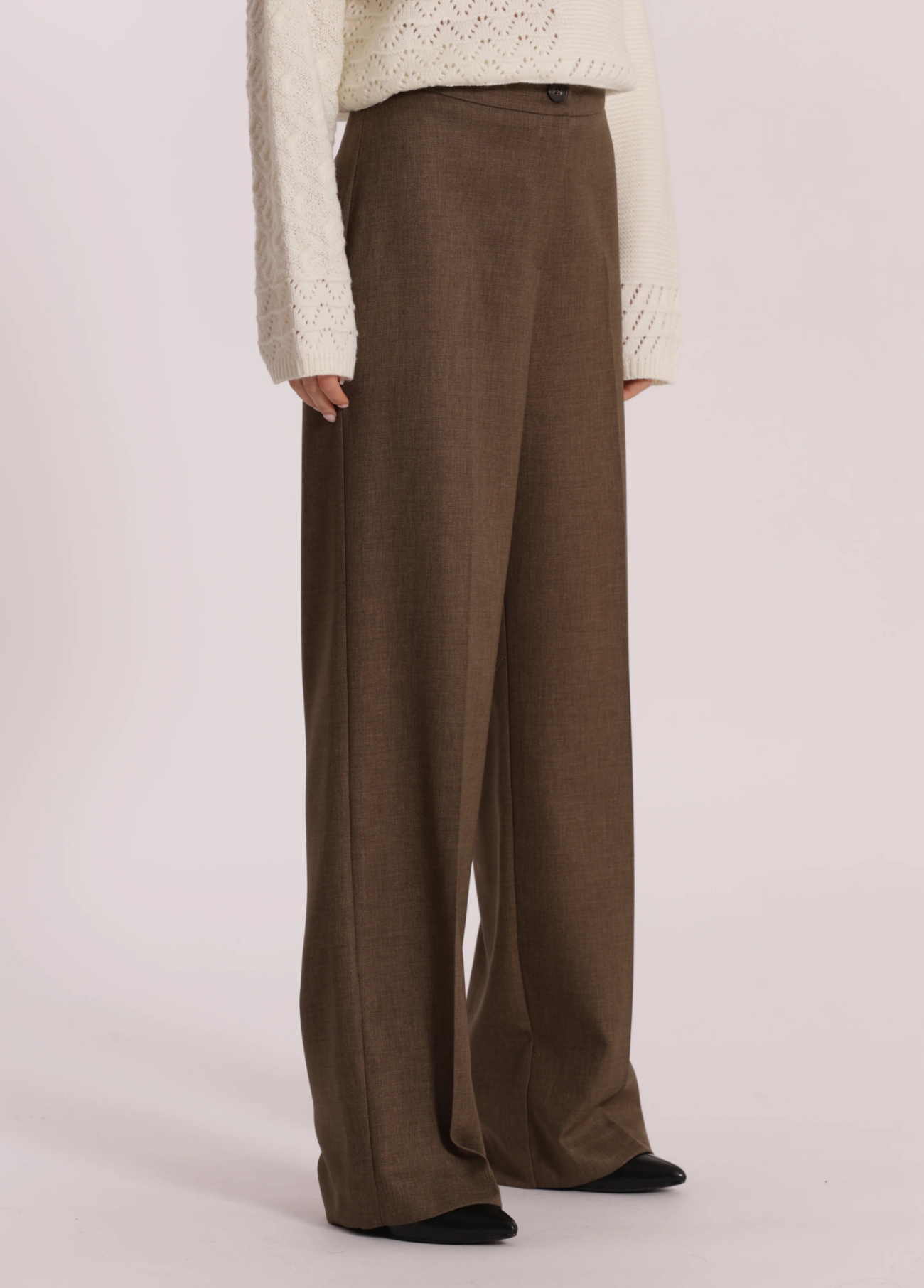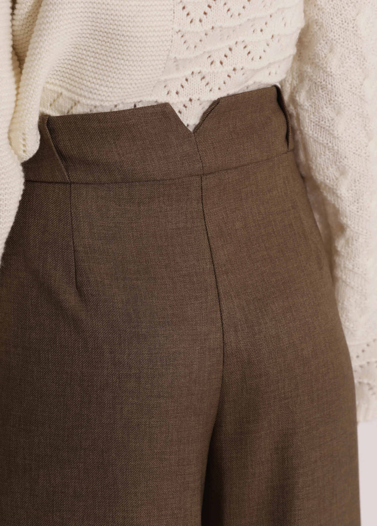 Calças de cintura subida em verde militar com detalhe em bico elegante no cós, que valoriza a silhueta de forma subtil. De corte reto e caimento fluido, são perfeitas para criar looks sofisticados e versáteis, ideais tanto para o dia a dia como para ocasiões mais formais.
