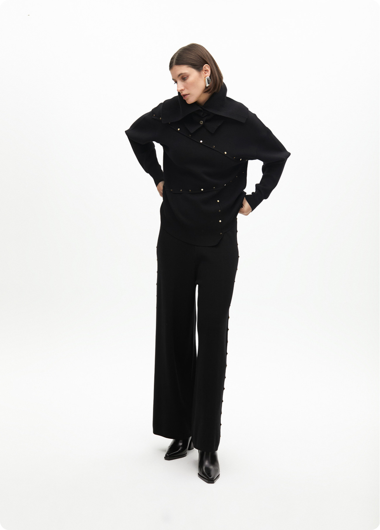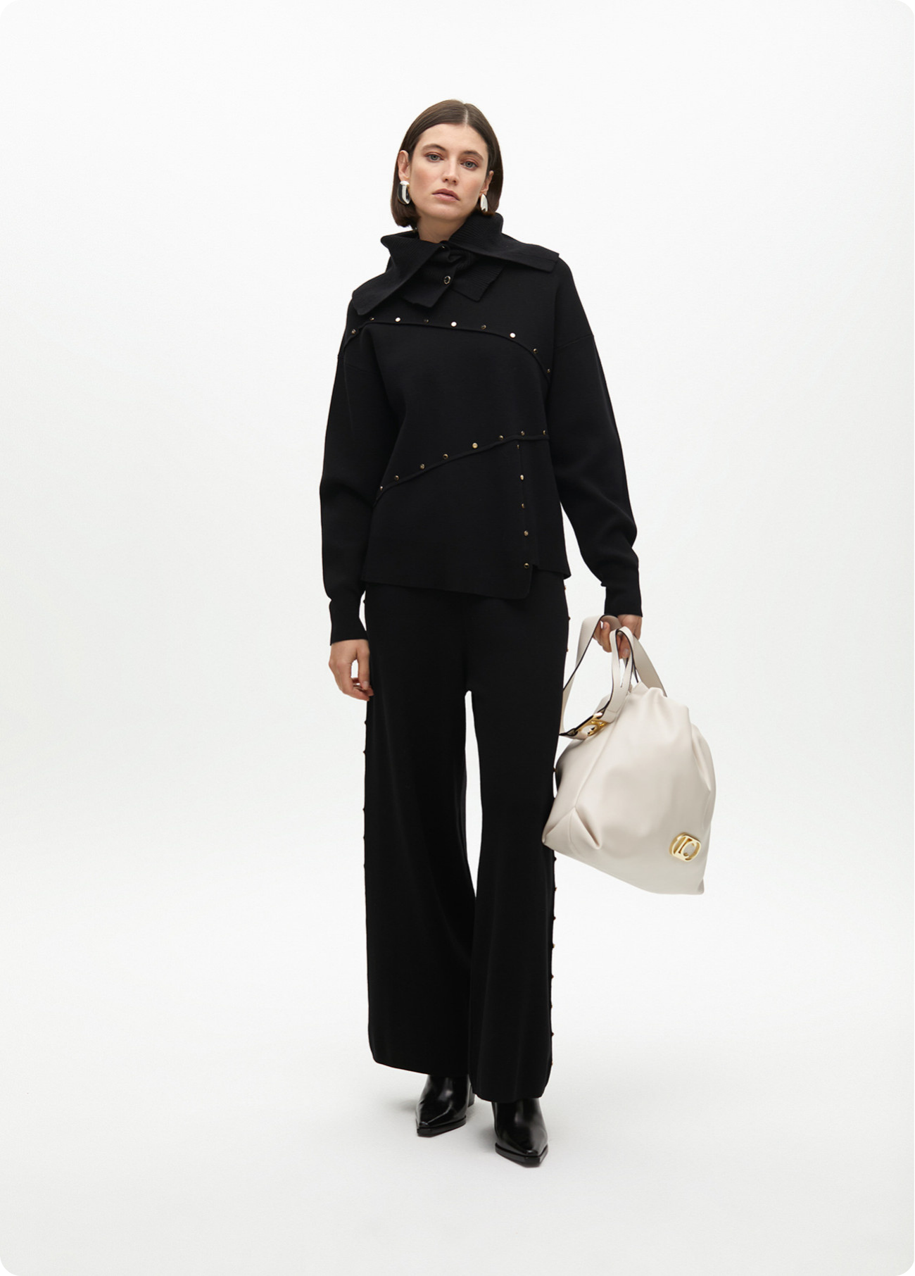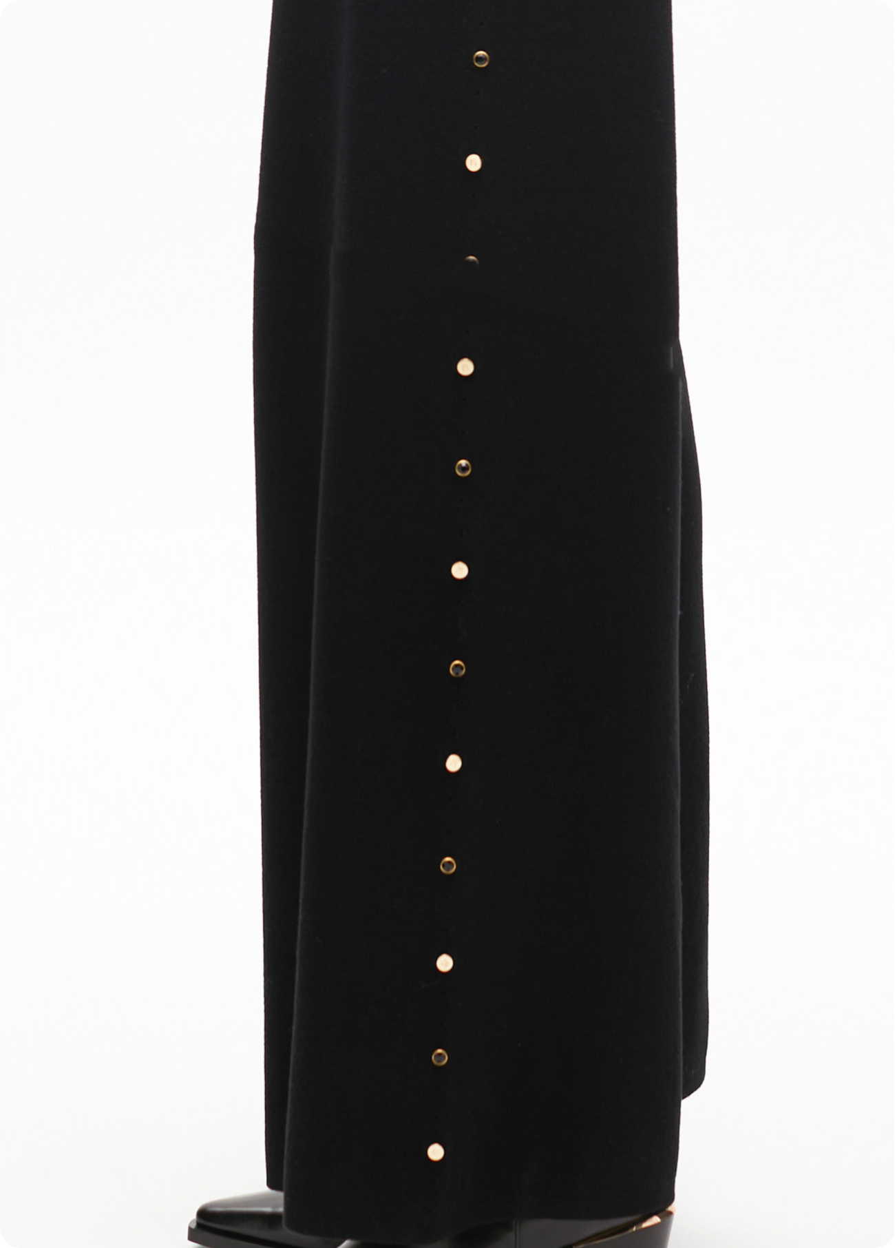 Calças retas em tecido de malha suave. Apresenta tachas decorativas laterais para um toque moderno. Cintura elástica para maior conforto.