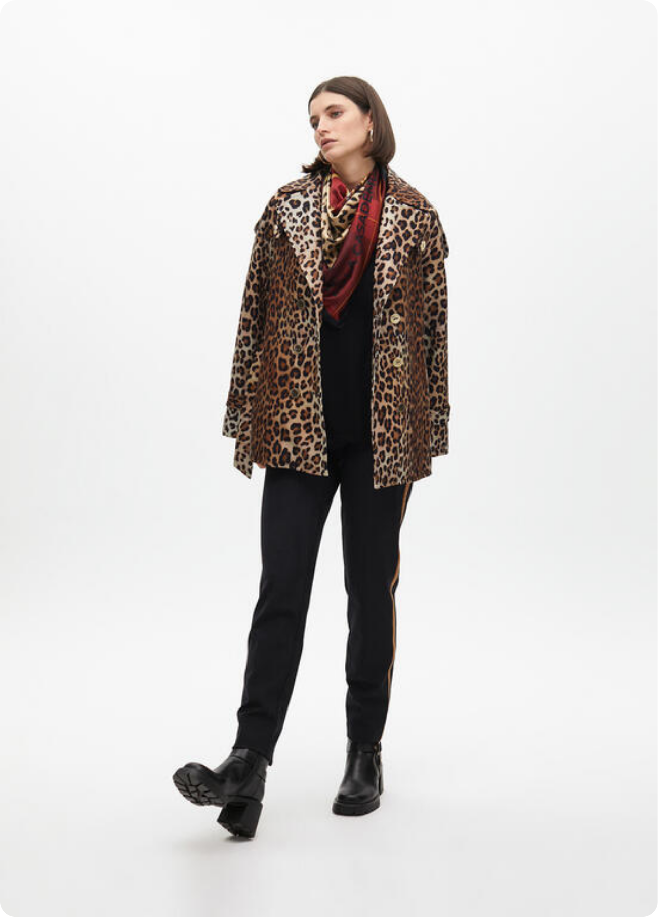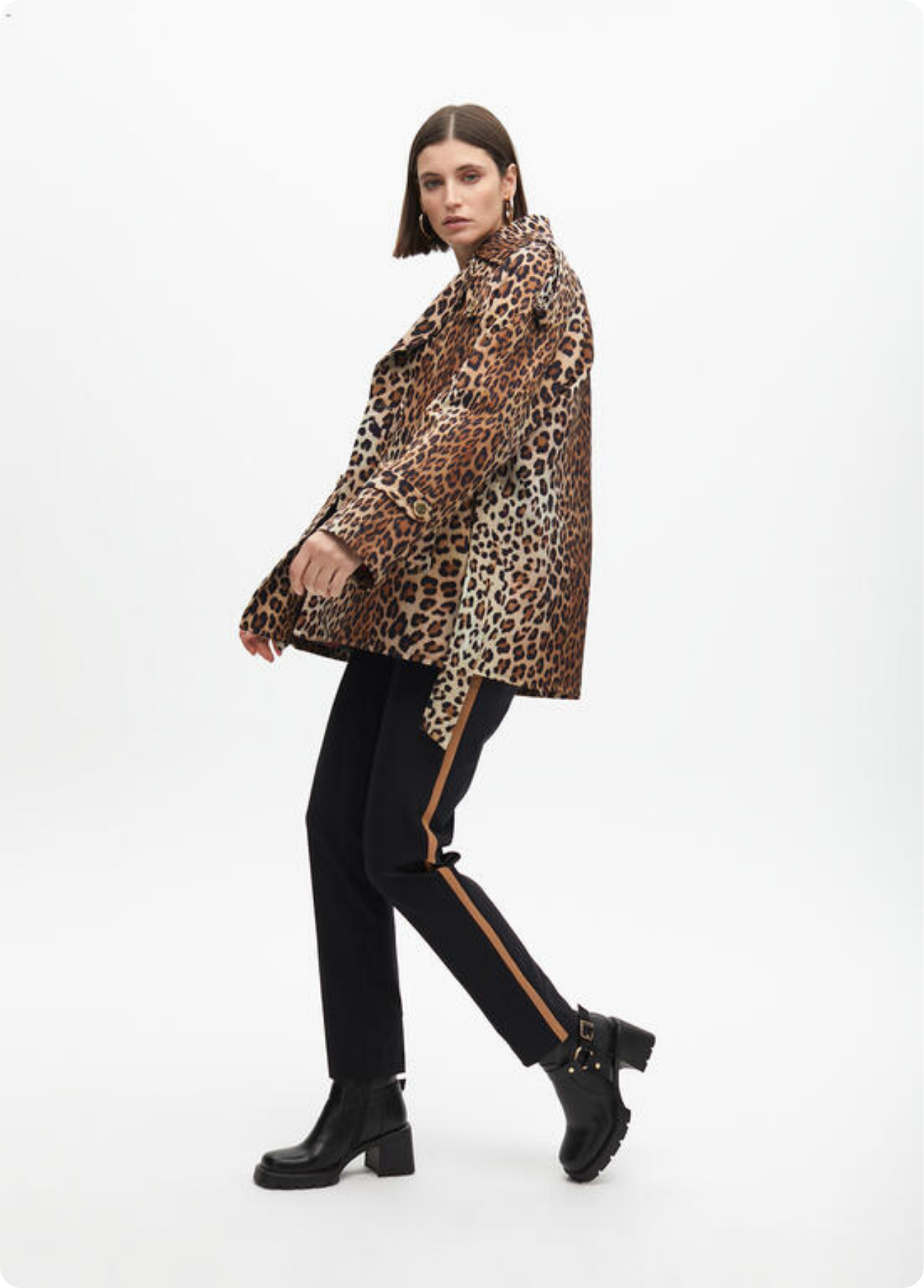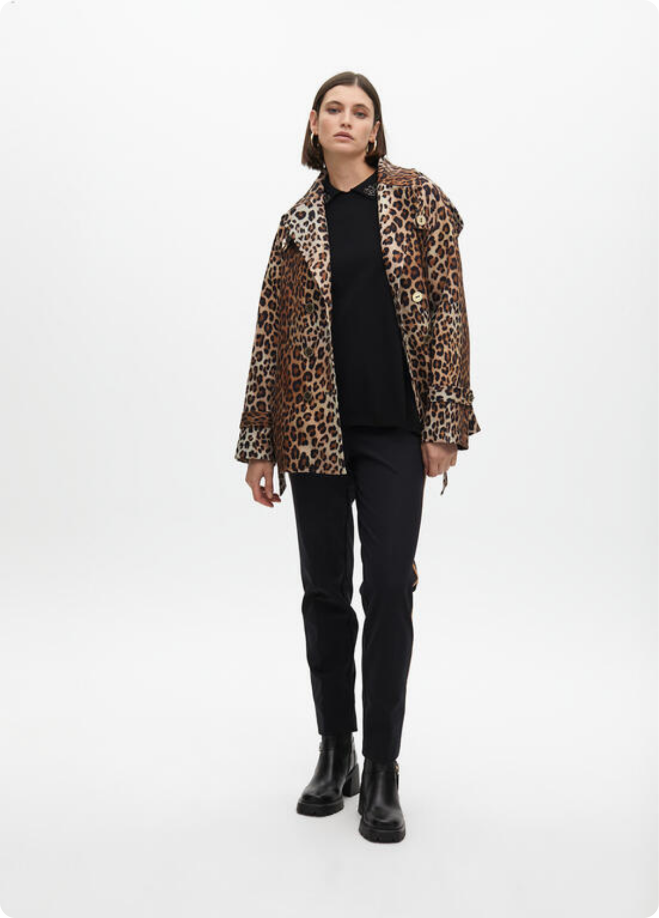 Calças pretas de corte slim, com detalhe de faixa lateral em camel que alonga a silhueta e acrescenta um toque moderno ao look clássico. Confortáveis e versáteis, podem ser usadas tanto em coordenados de escritório como em outfits casuais elegantes. Uma peça intemporal com design sofisticado e funcional.
