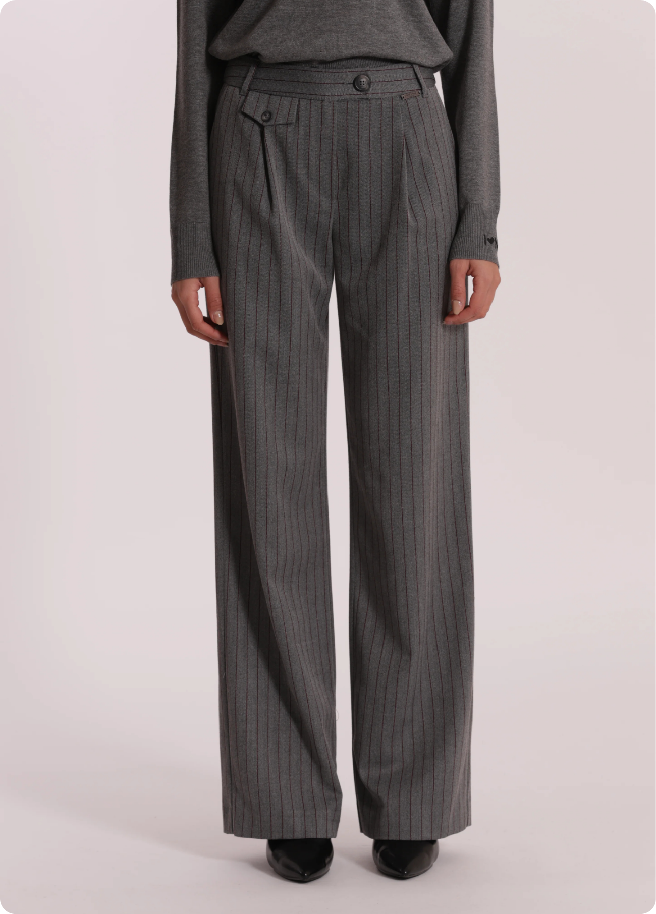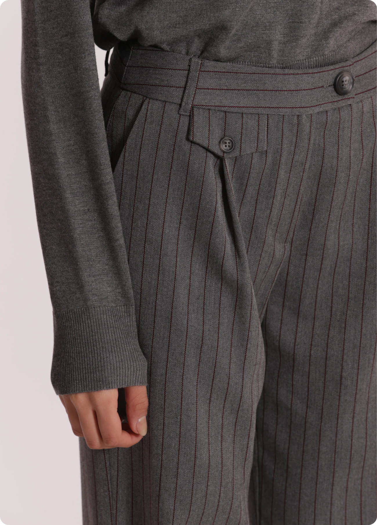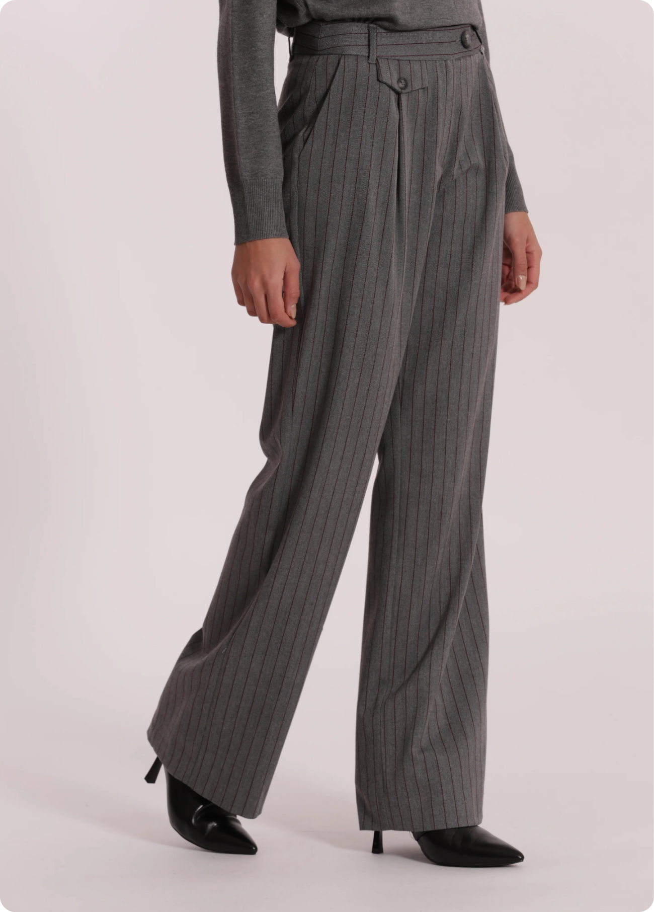 Calças pantalonas palazzo em tecido cinzento com risca diplomática bordeaux.