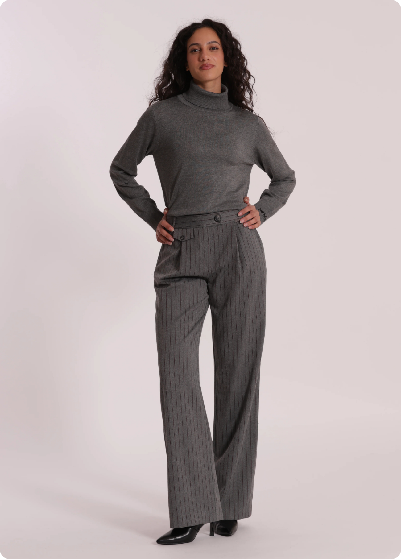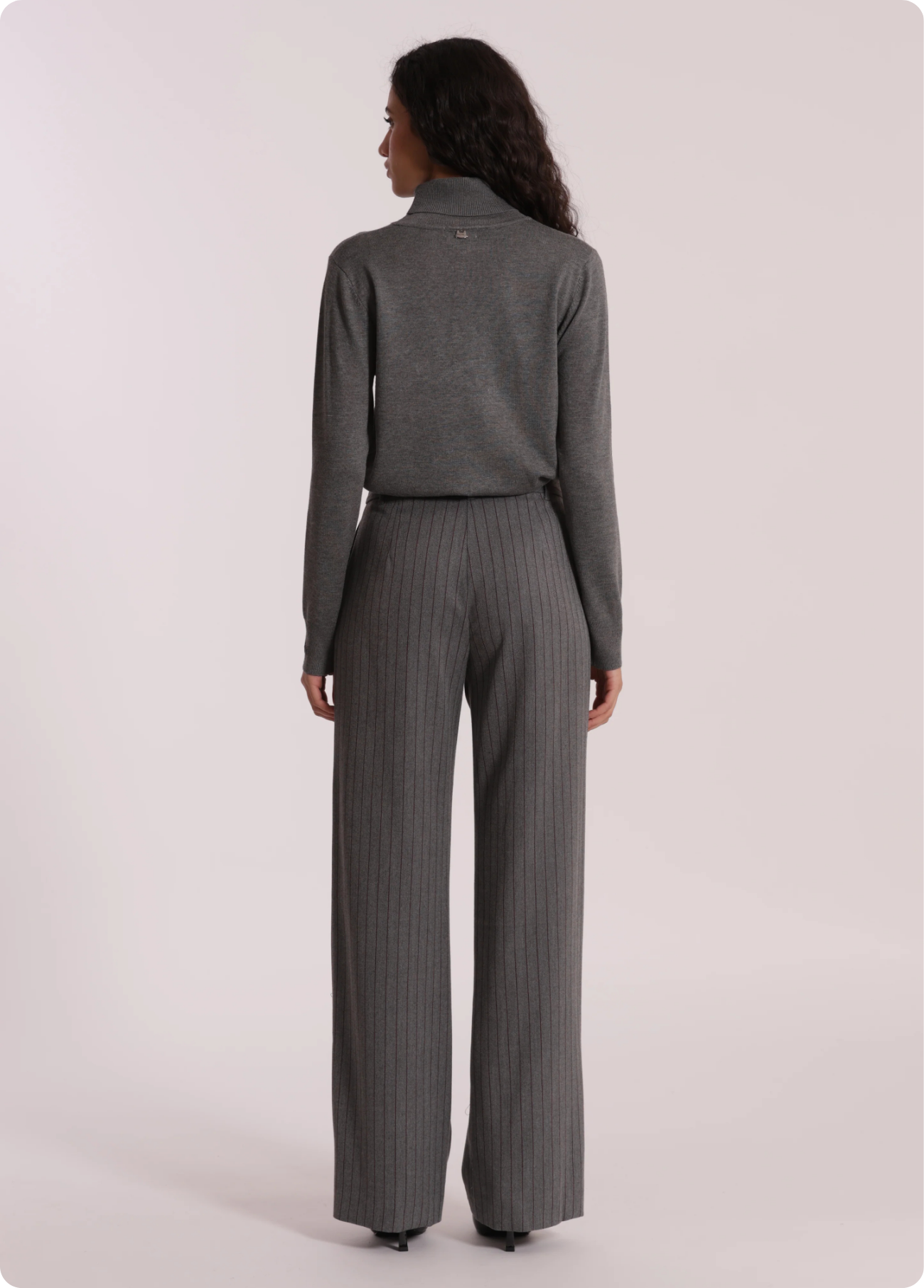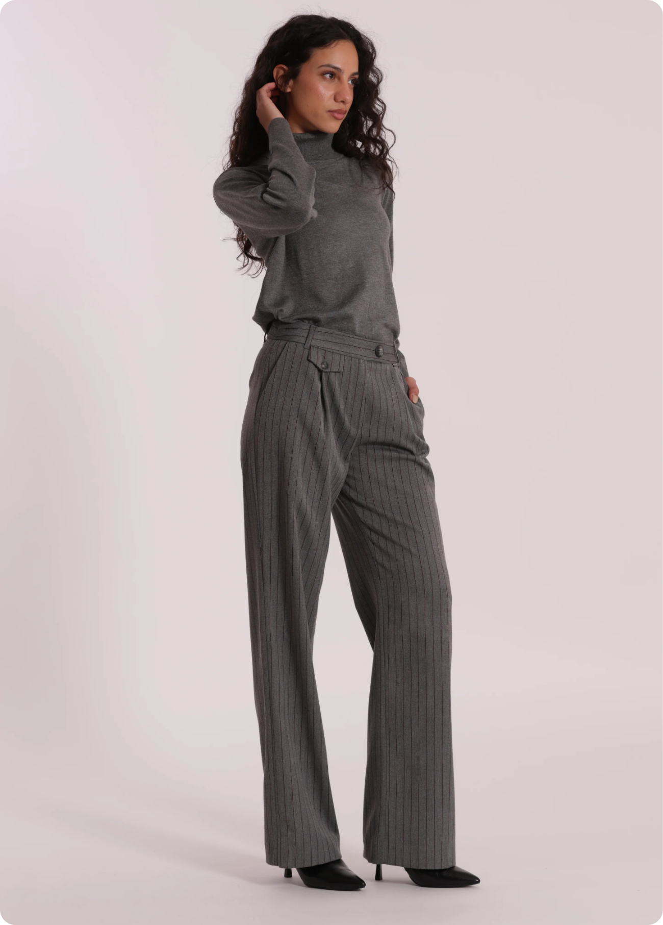 Calças pantalonas palazzo em tecido cinzento com risca diplomática bordeaux.