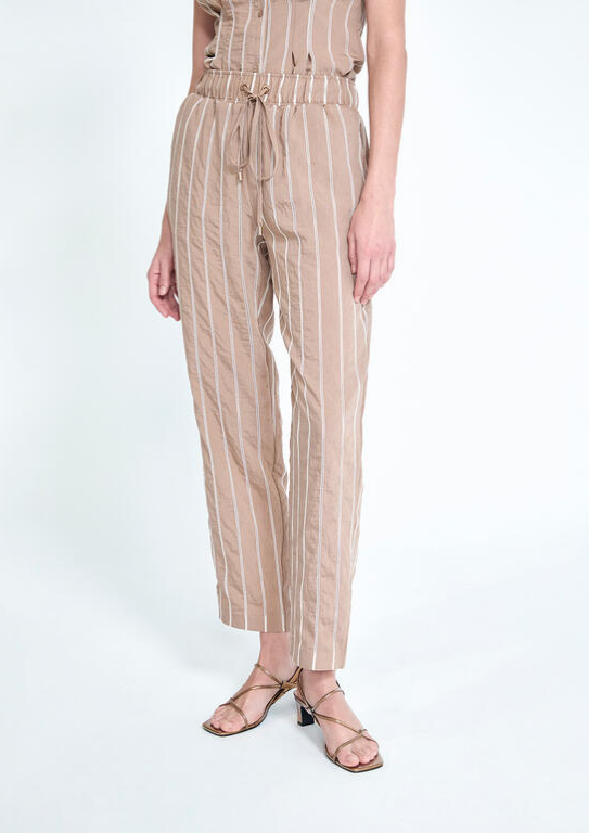 Calças tipo jogger de tecido fresco. Fundo bege com risca vertical branca. Existe blusa a combinar.