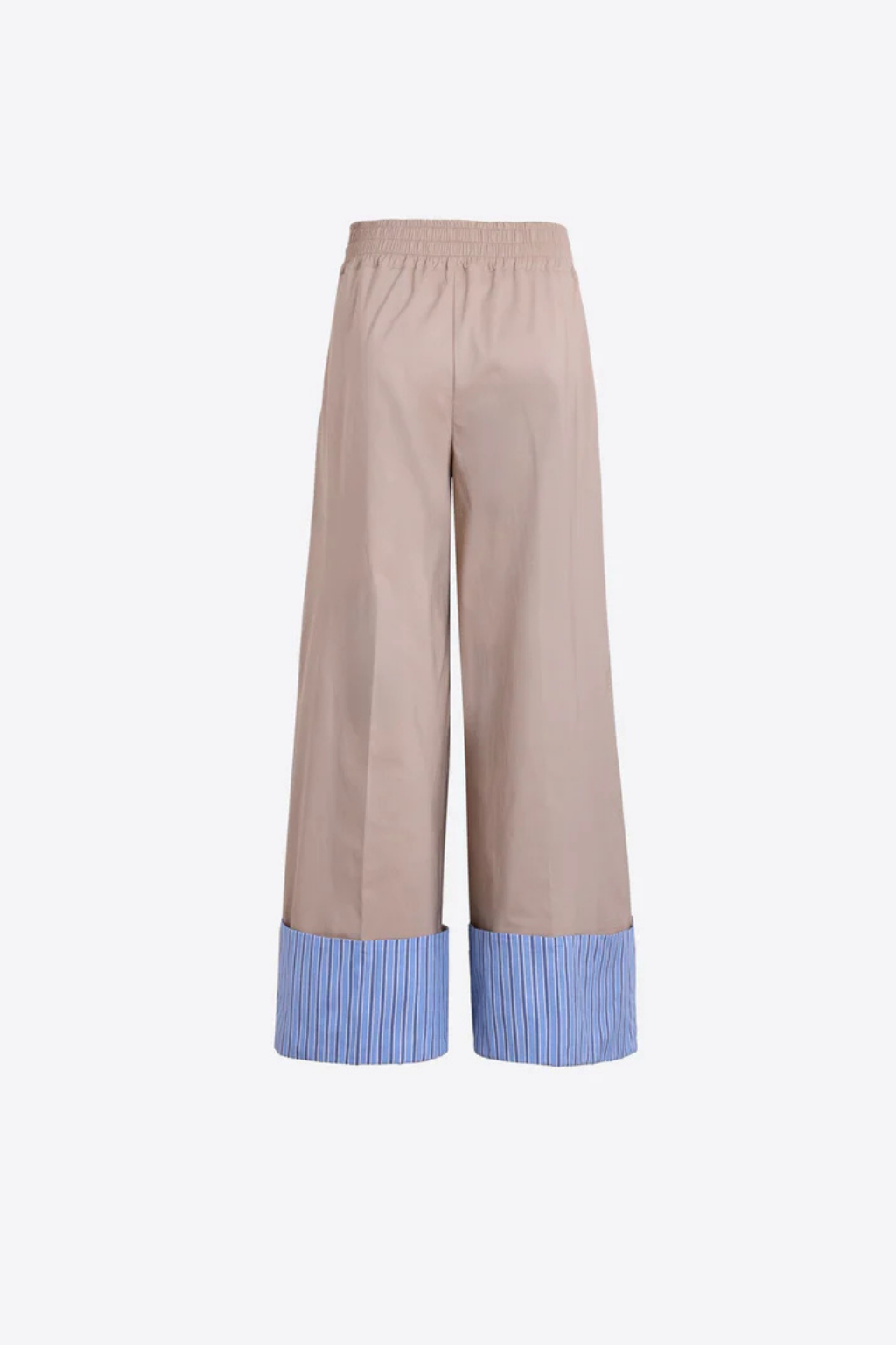 Calças bege de perna larga com pregas frontais. Cintura lisa e bainha dobrada em tecido às riscas azul-claro. Bolsos laterais.