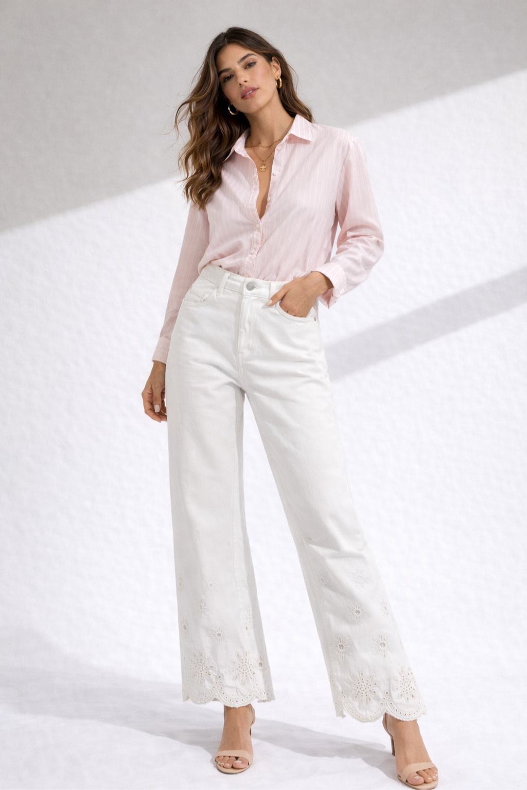CALÇAS DE GANGA BRANCAS COM BORDADO NA BAINHA - ALIBY