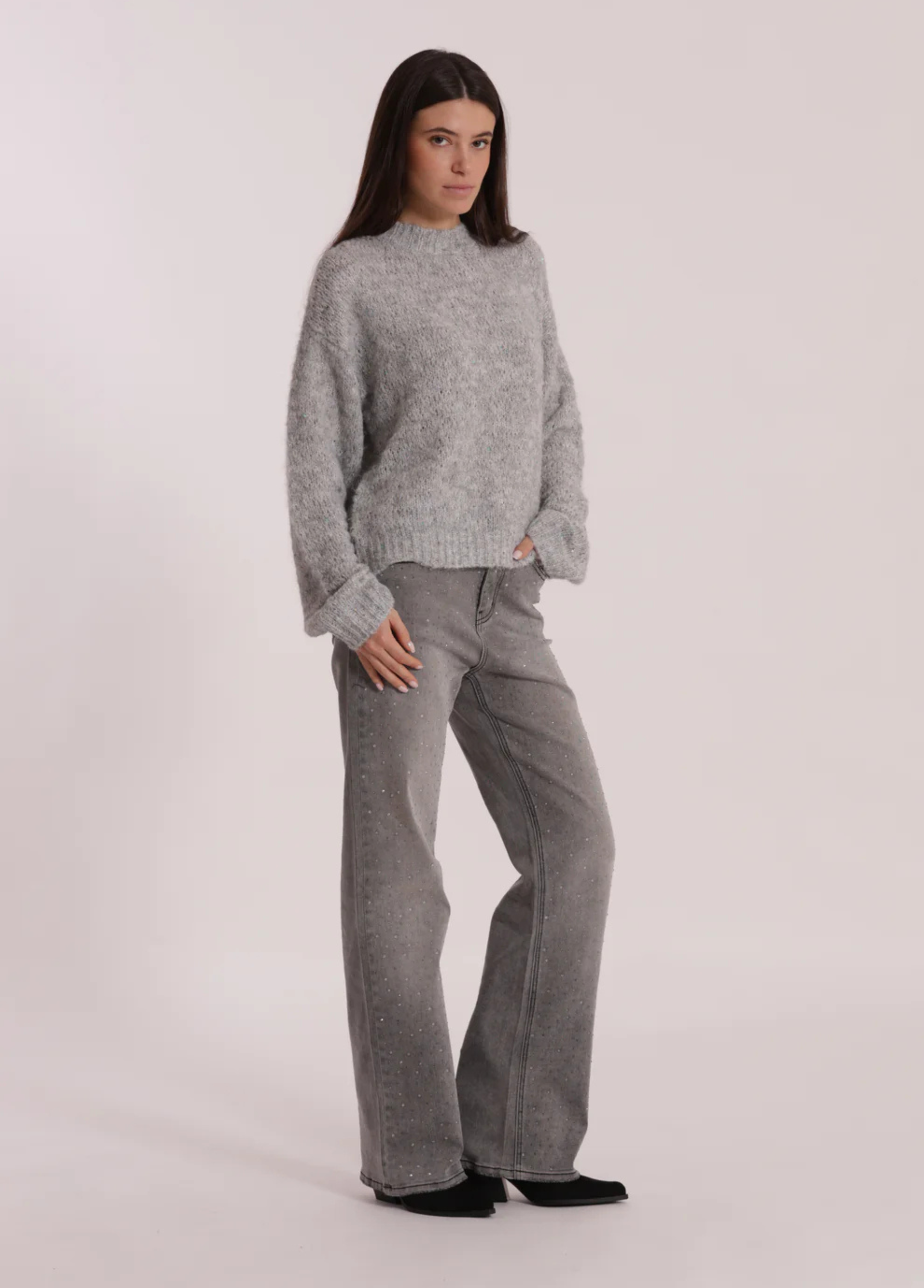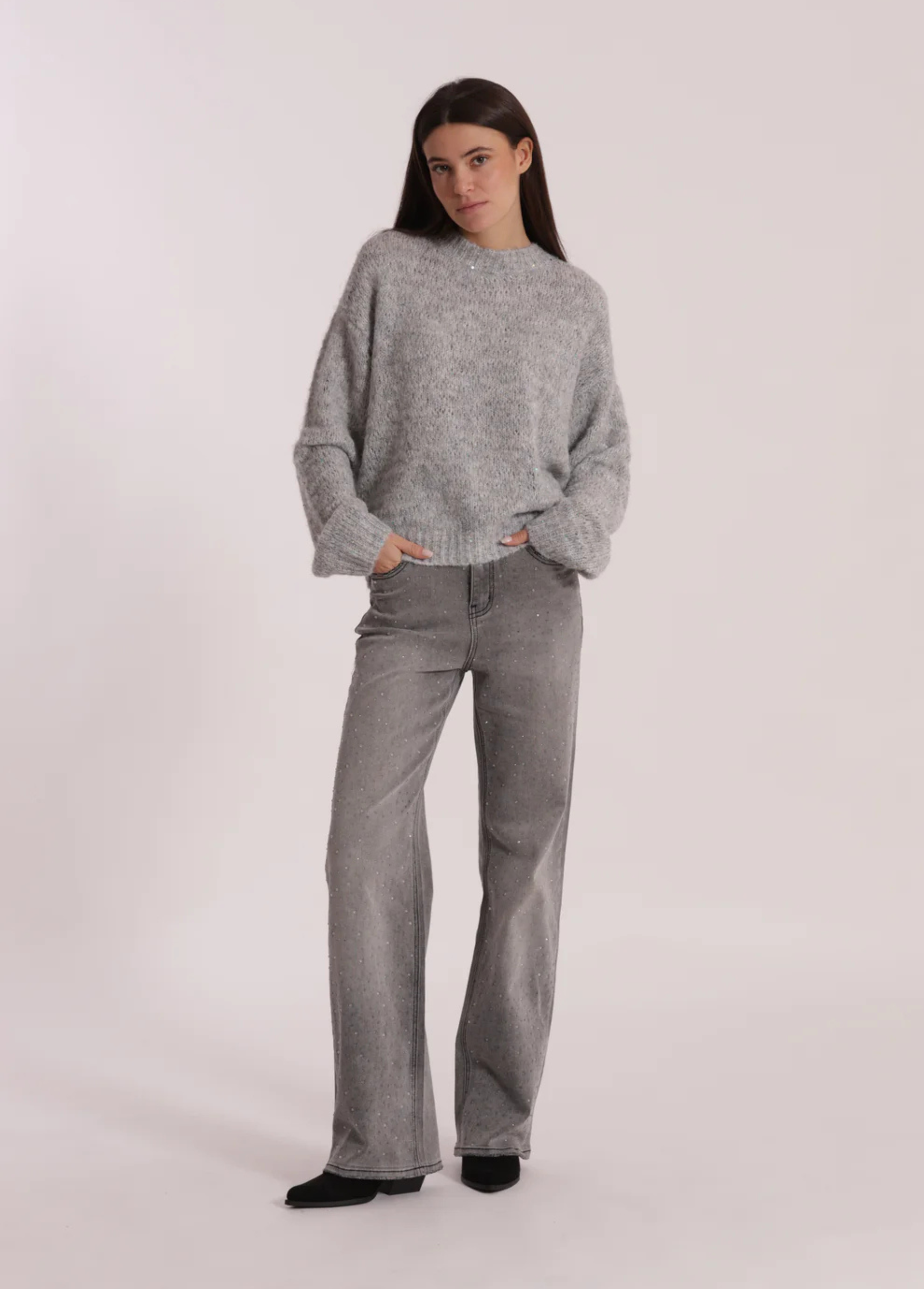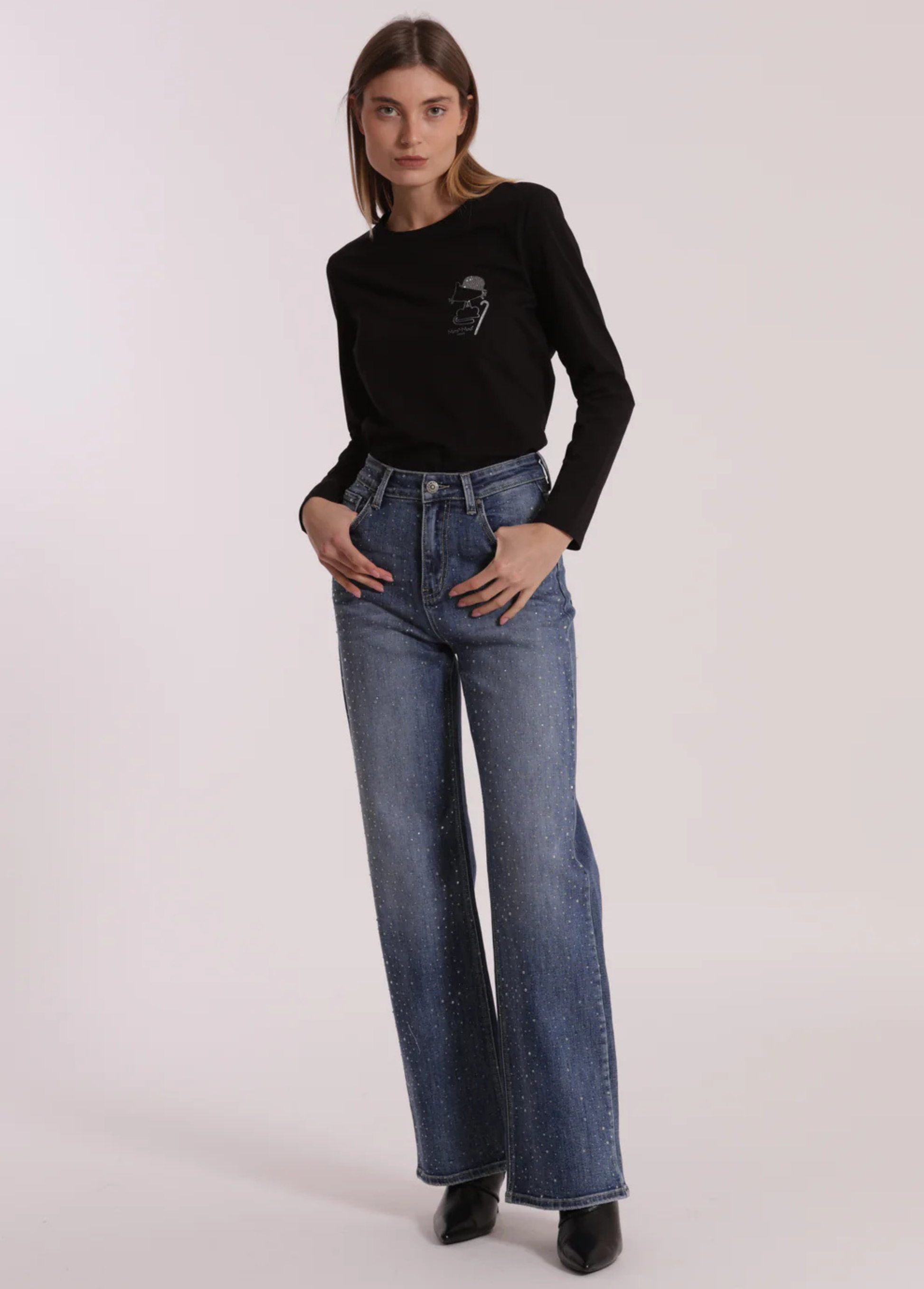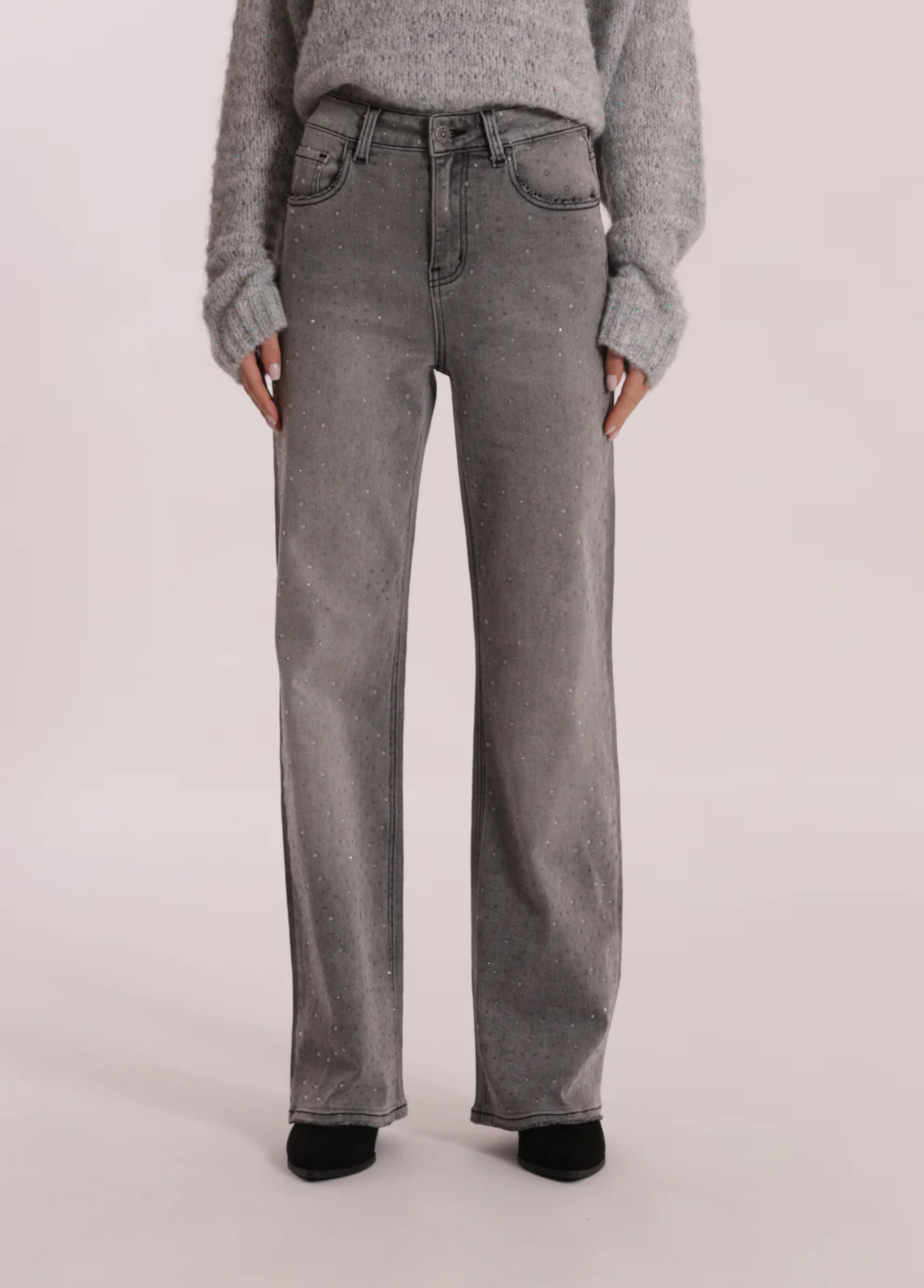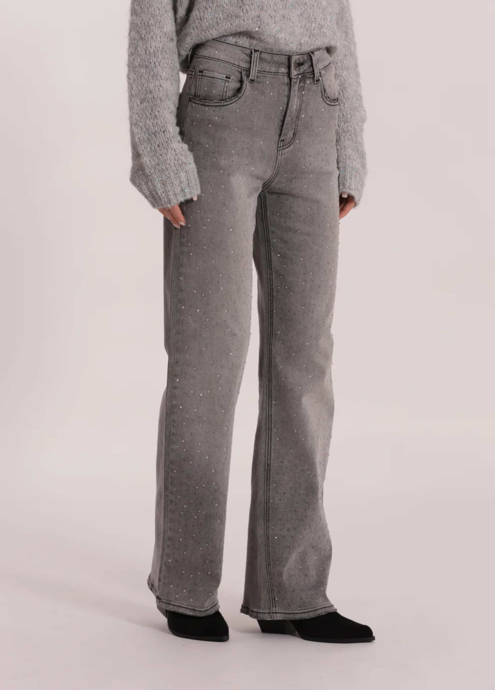 Calças de ganga largas com strass acinzentado apenas à frente. Os strass são discretos mas com toque de moda. Duas cores disponíveis: ganga azul ou ganga cinzenta.