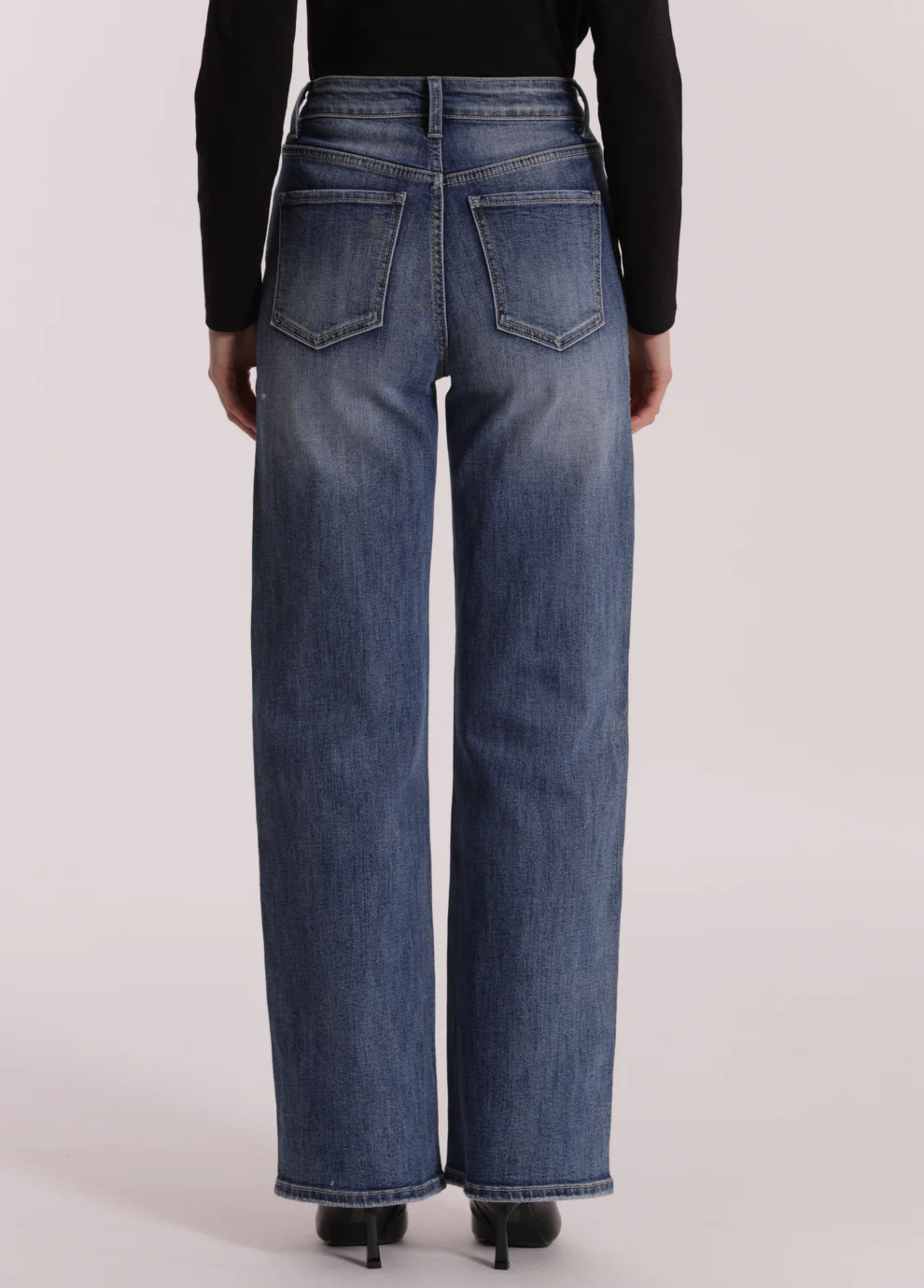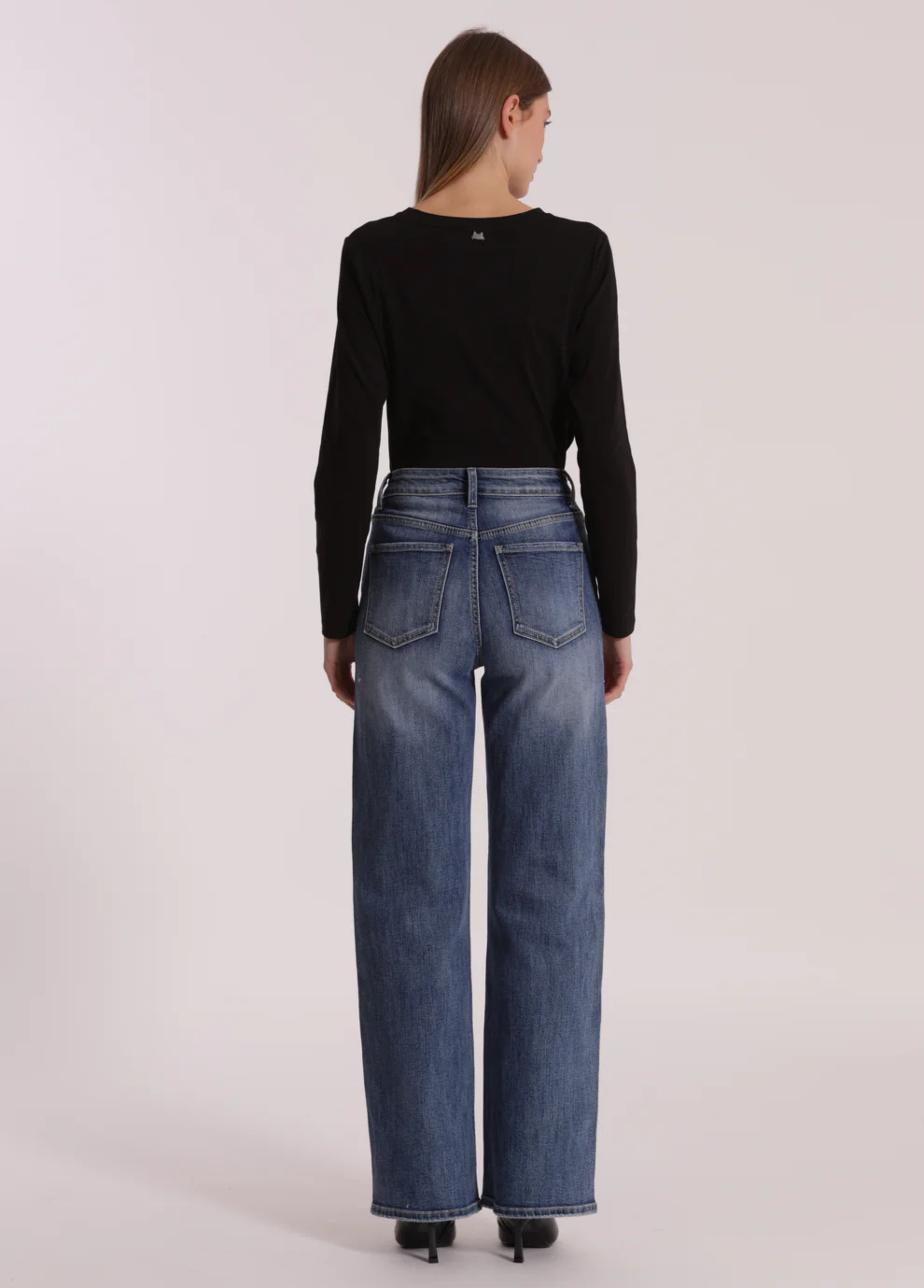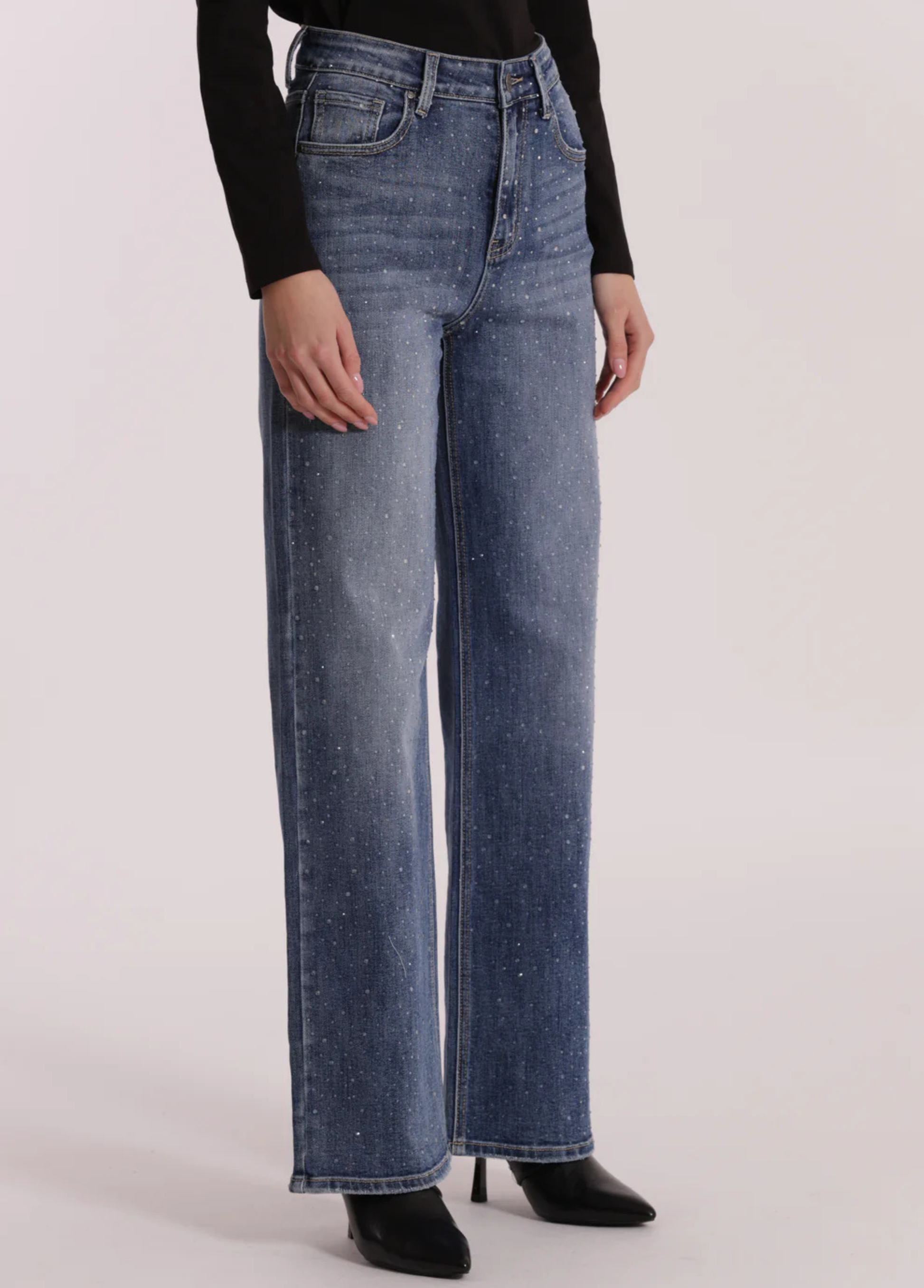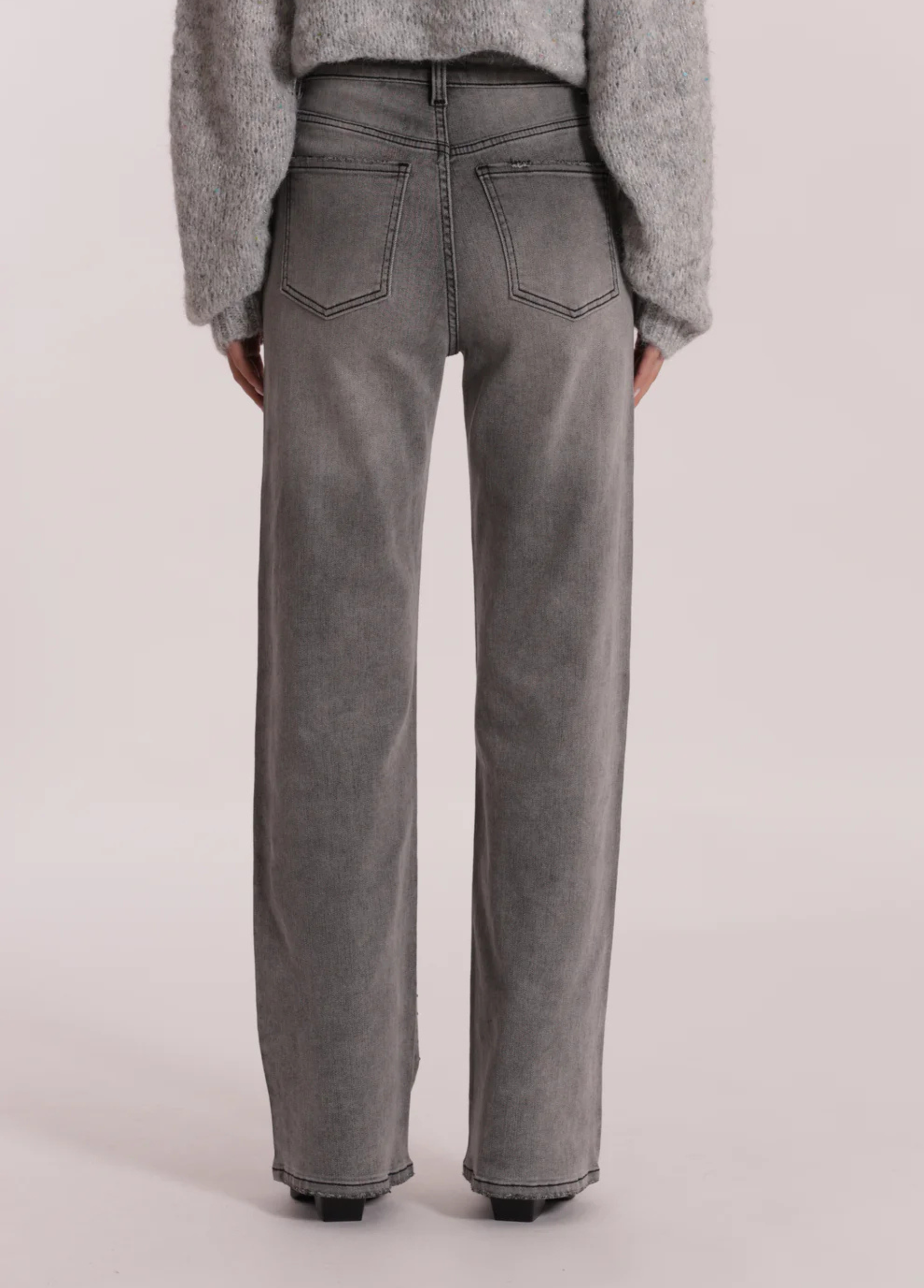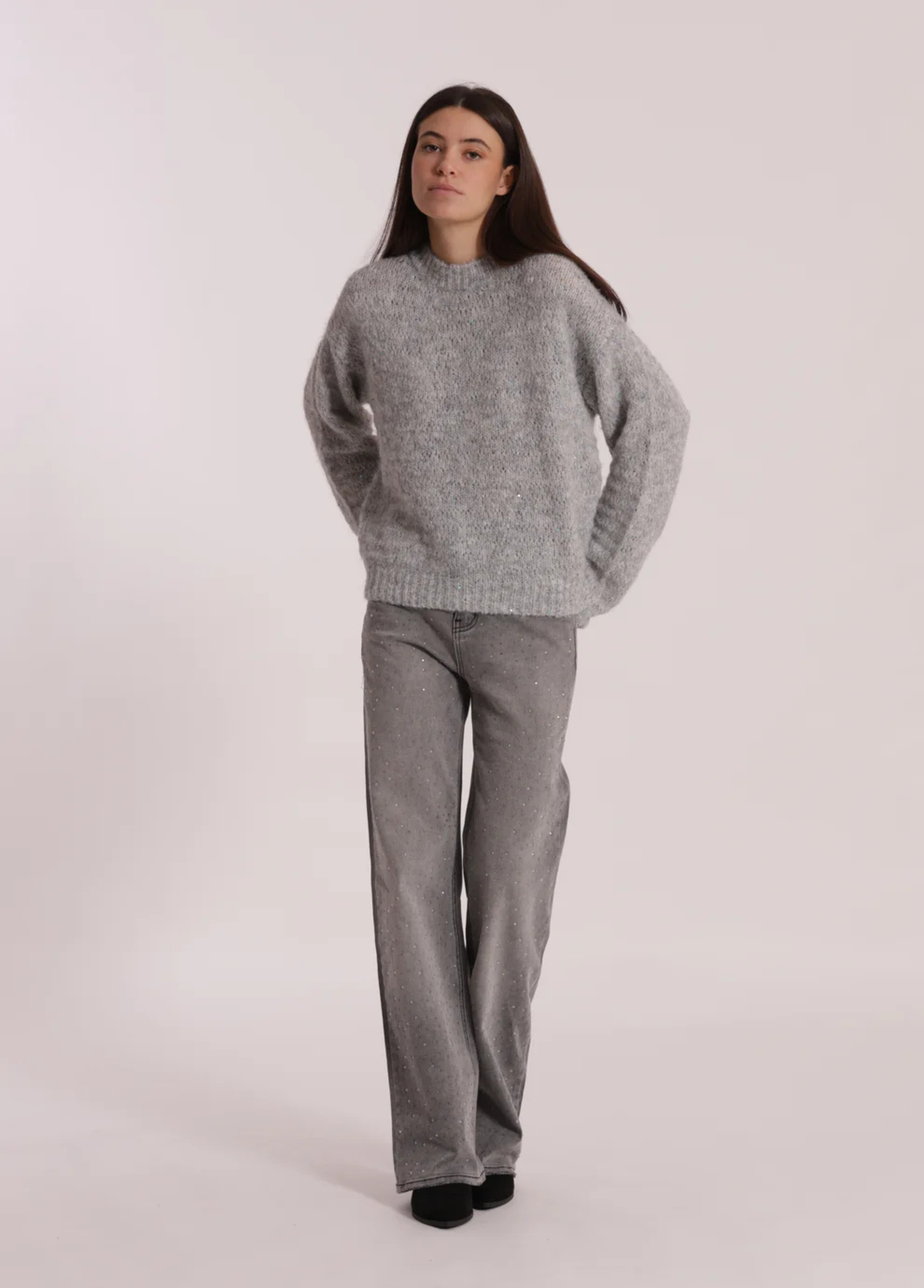 Calças de ganga largas com strass acinzentado apenas à frente. Os strass são discretos mas com toque de moda. Duas cores disponíveis: ganga azul ou ganga cinzenta.