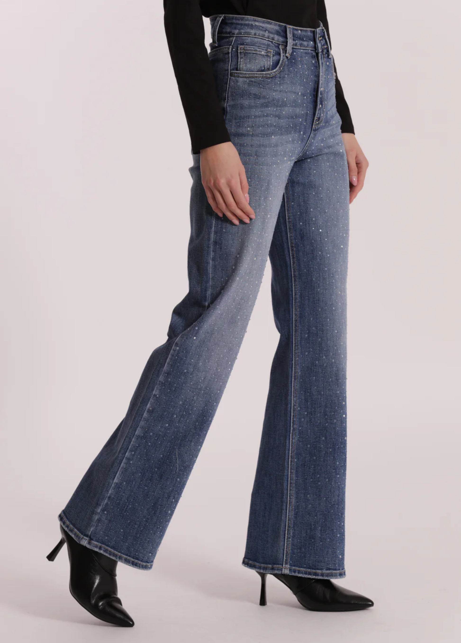 CALÇAS DE GANGA LARGAS COM STRASS À FRENTE - MIMI MUA