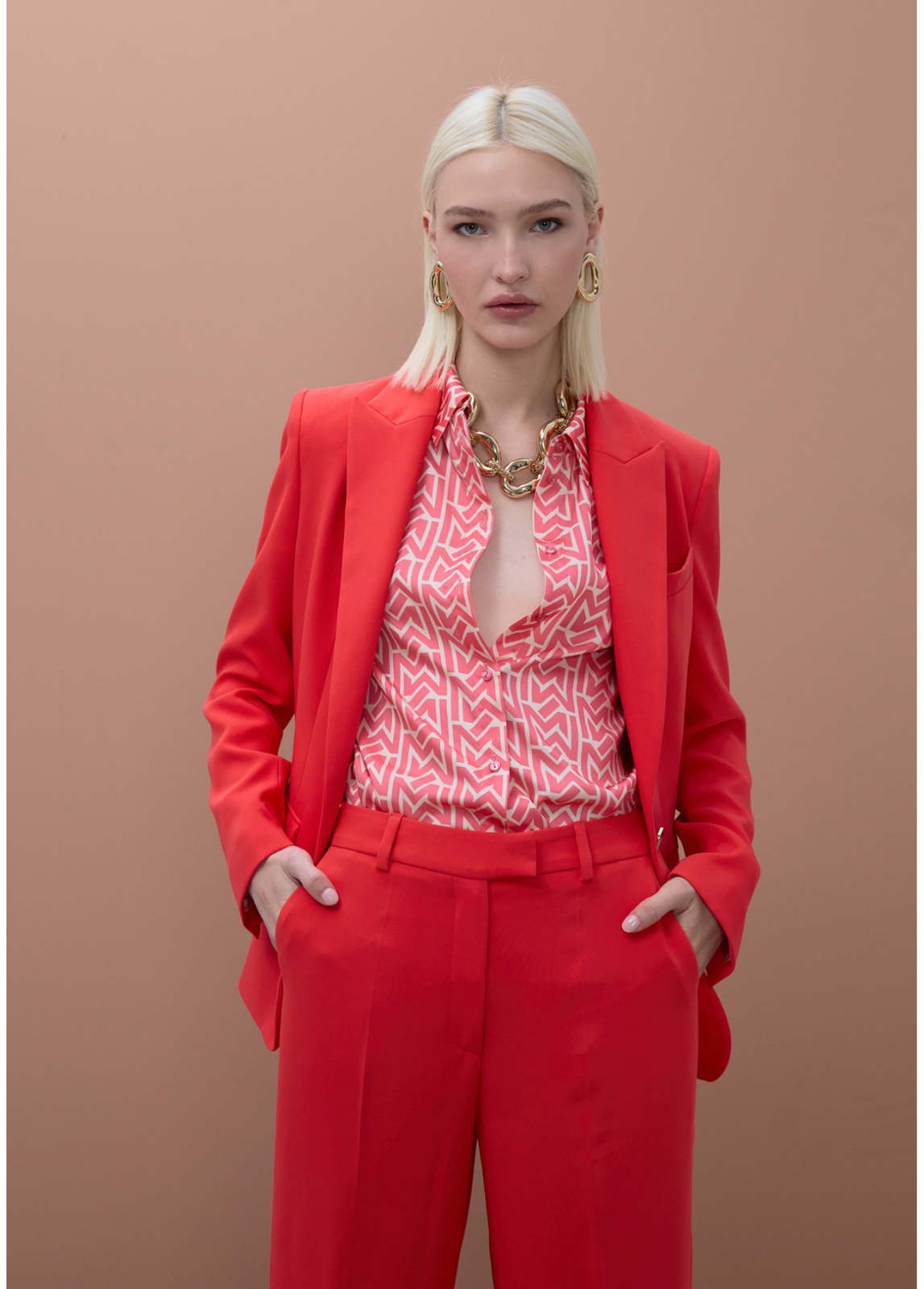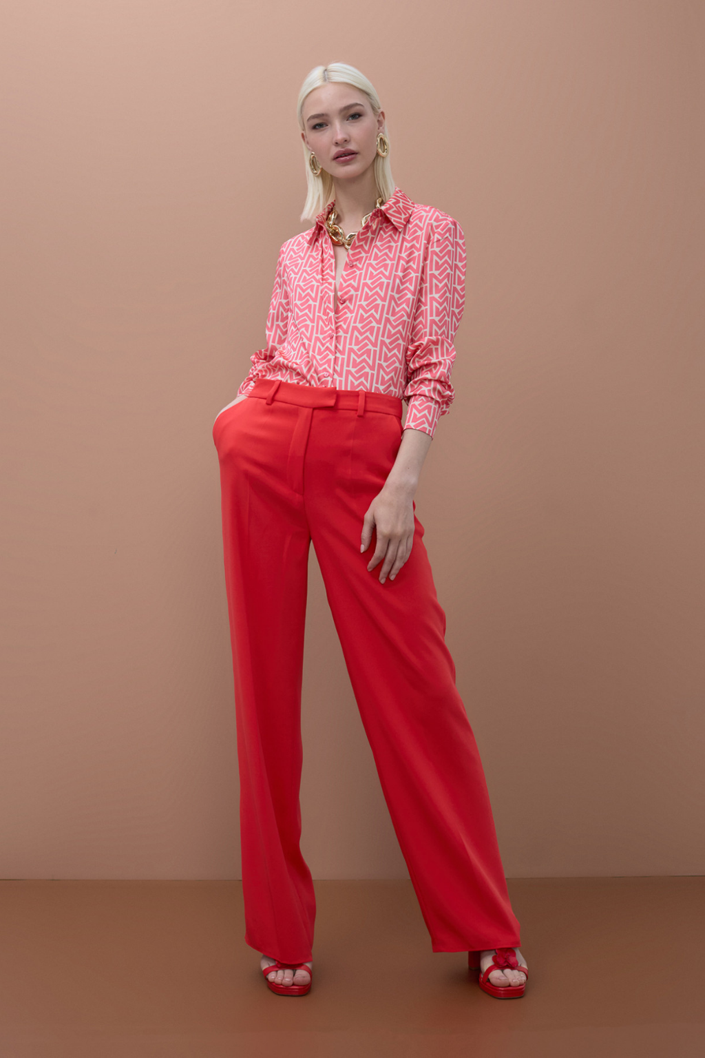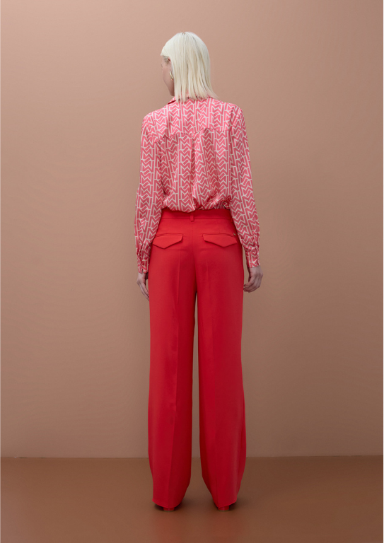 Calças de corte reto em coral vibrante. Confeccionadas em tecido fluido. Possuem bolsos laterais e fecho de zíper. Combine com uma blusa elegante para um look moderno de escritório.