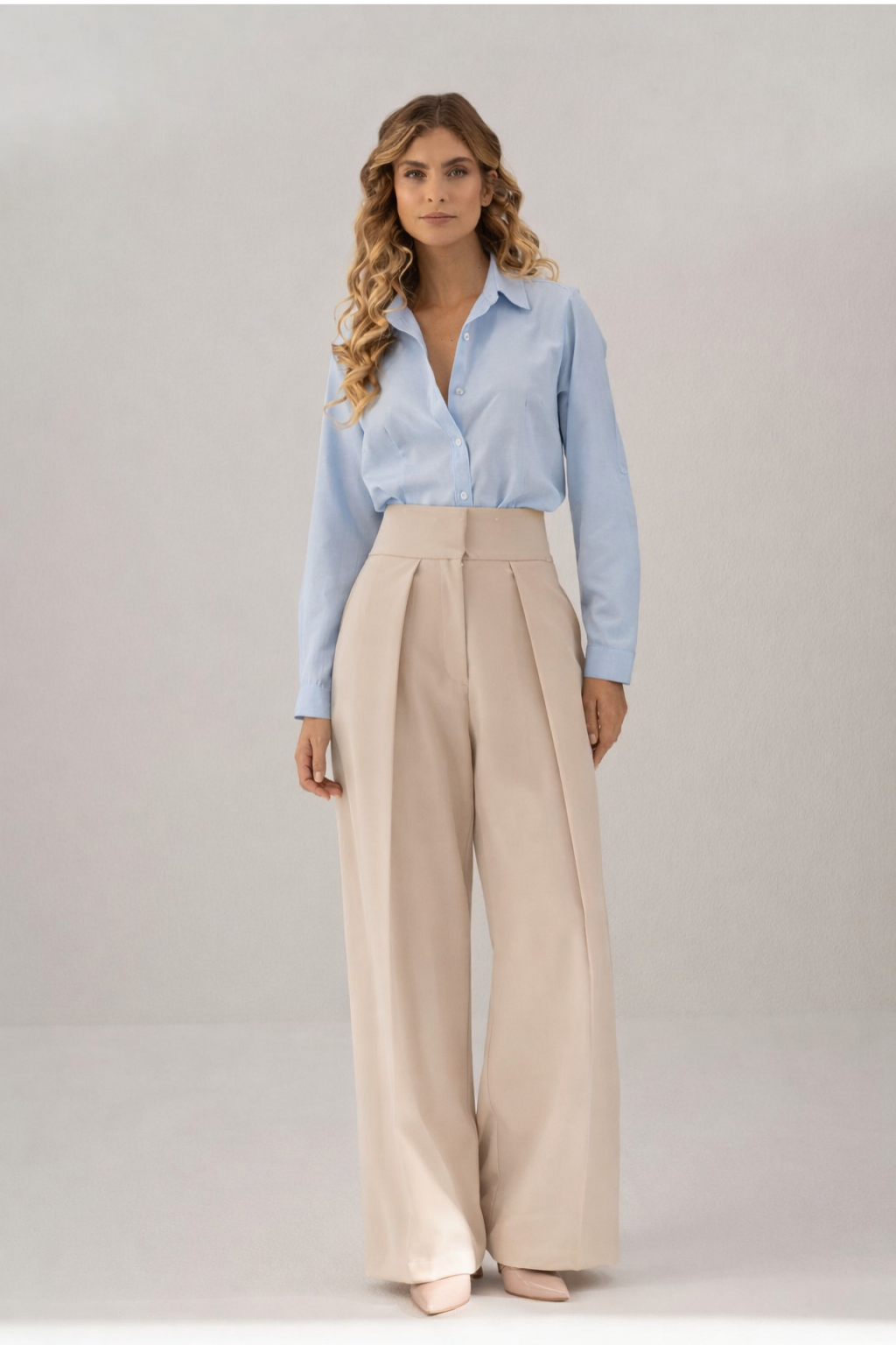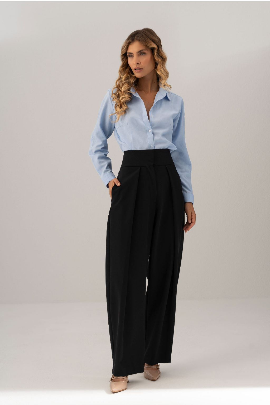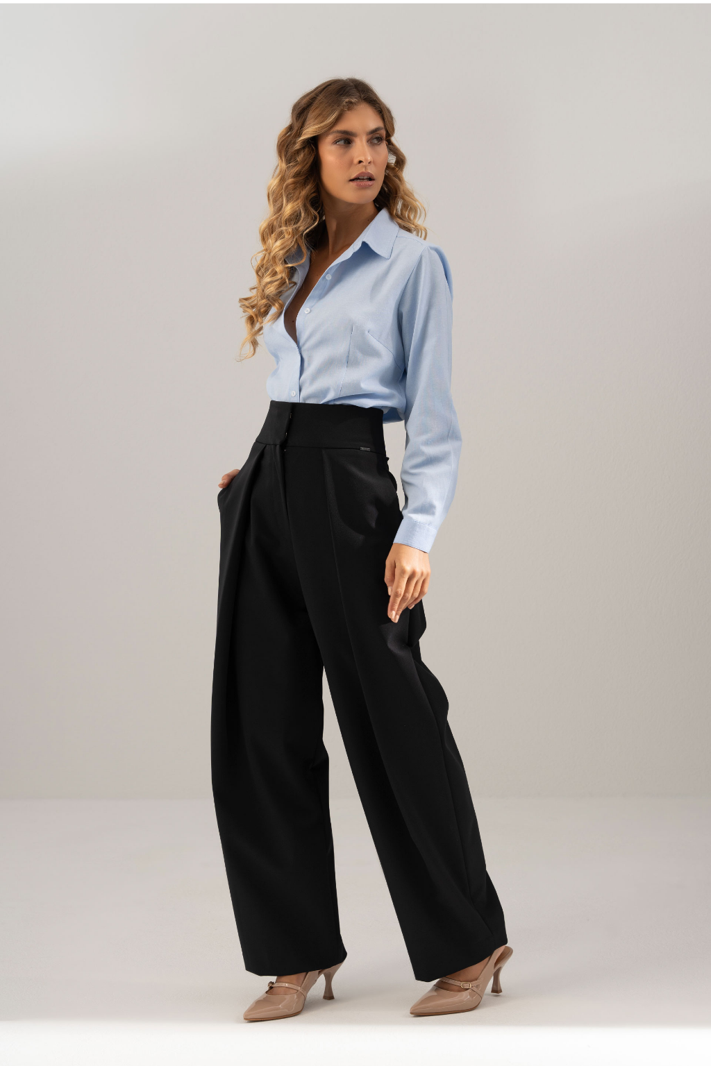 Calça feminina de cintura subida, com pregas frontais que valorizam e alongam a silhueta. Apresenta perna de corte amplo e caimento fluido, combinando elegância e conforto. O design minimalista e a estrutura cuidada tornam-na uma peça versátil, ideal para coordenados sofisticados ou looks profissionais com um toque moderno.