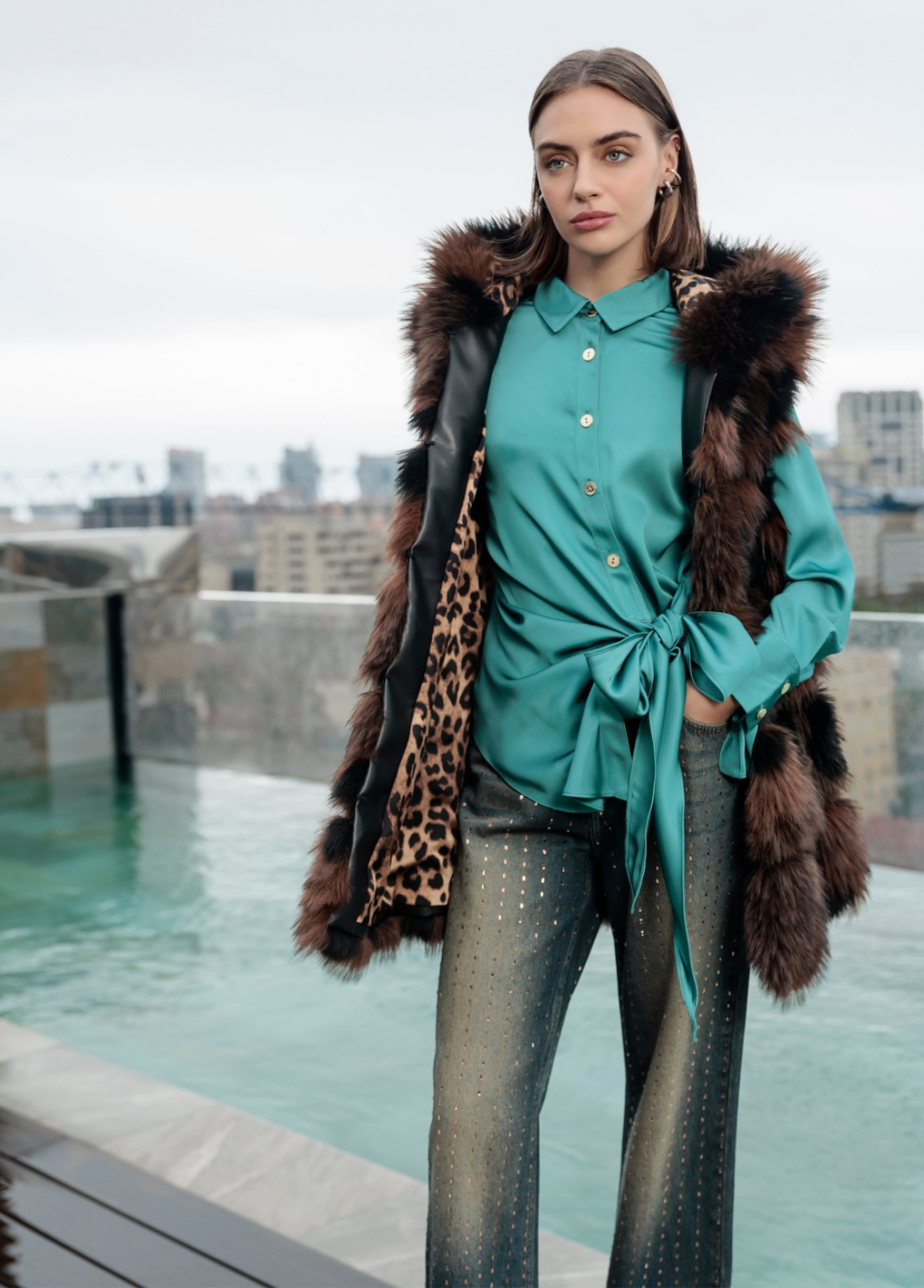 Jeans wideleg com design usado chique e detalhes brilhantes em cobre. Fecho frontal com zíper e botão. Bolsos laterais funcionais.