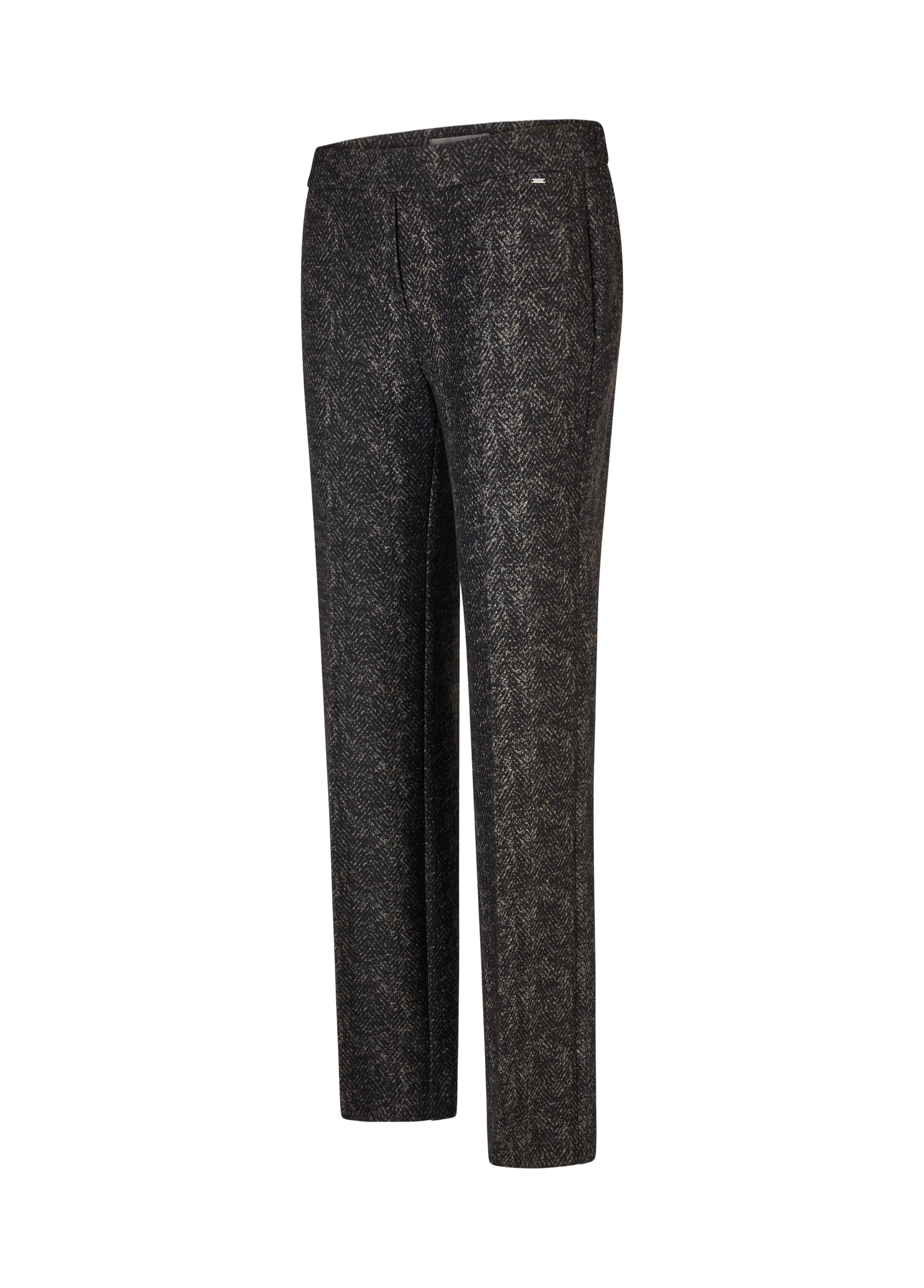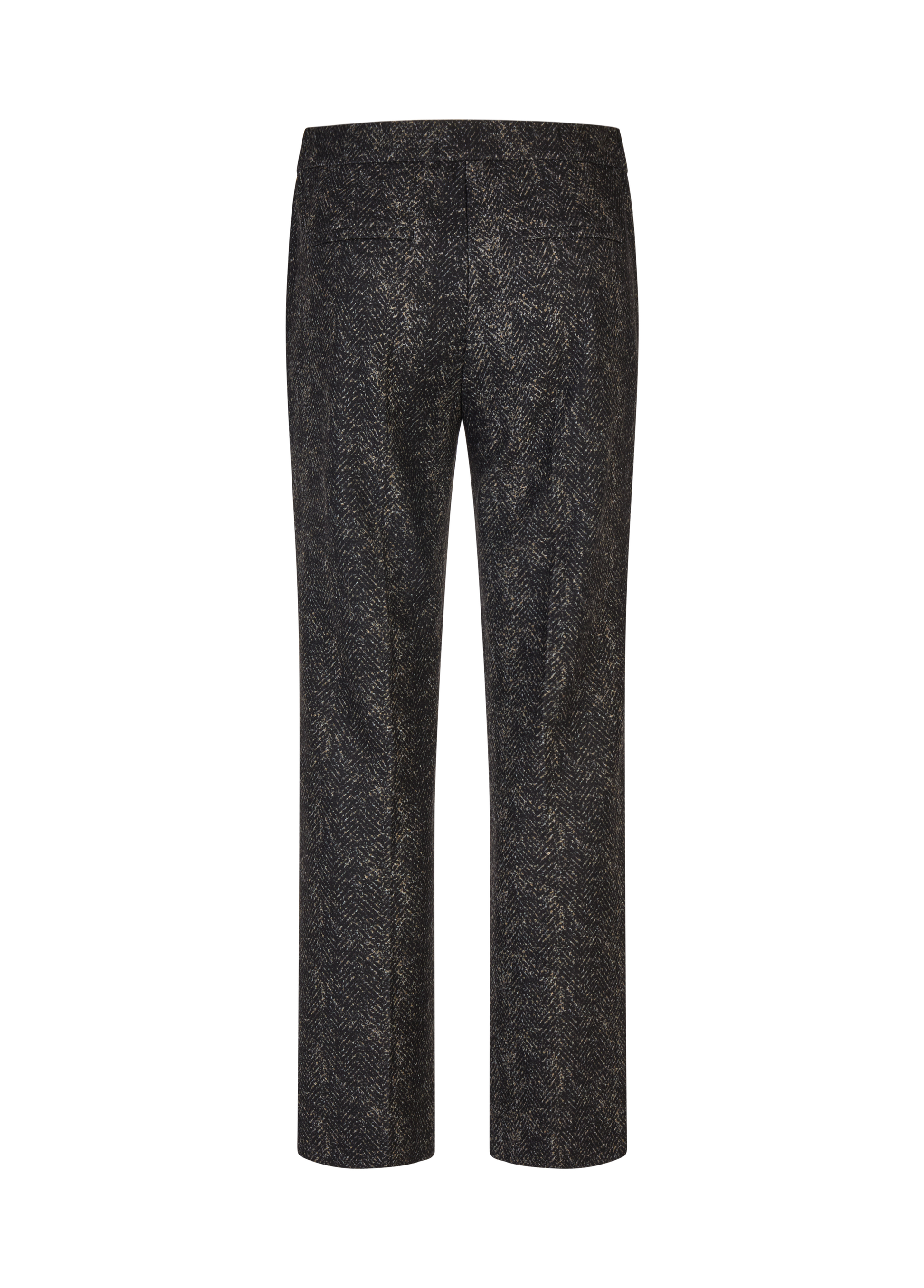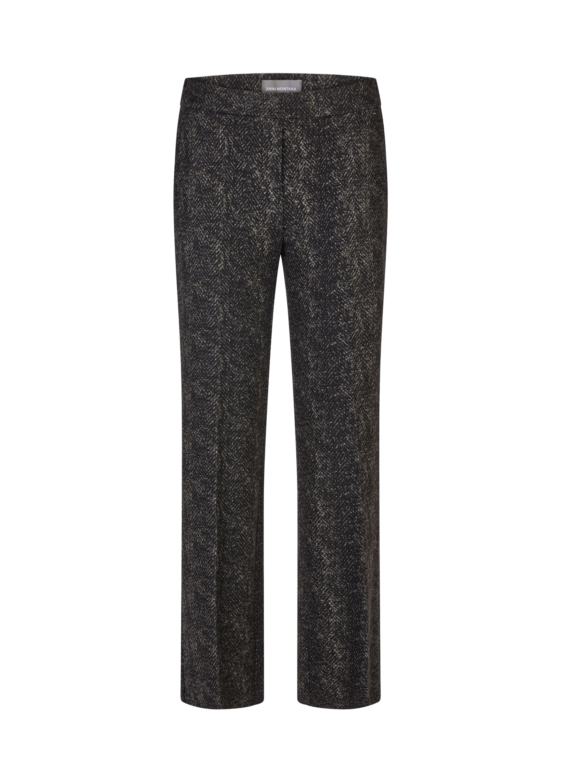 A marca alemã Anna Montana assina estas calças de inspiração clássica com um padrão chevron discreto em tons neutros, perfeitas para um visual sofisticado e intemporal. O tecido macio e elástico adapta-se harmoniosamente à silhueta, proporcionando conforto e liberdade de movimento ao longo do dia. Cintura média e corte reto, esta peça é ideal para coordenados de trabalho ou looks casuais elegantes.