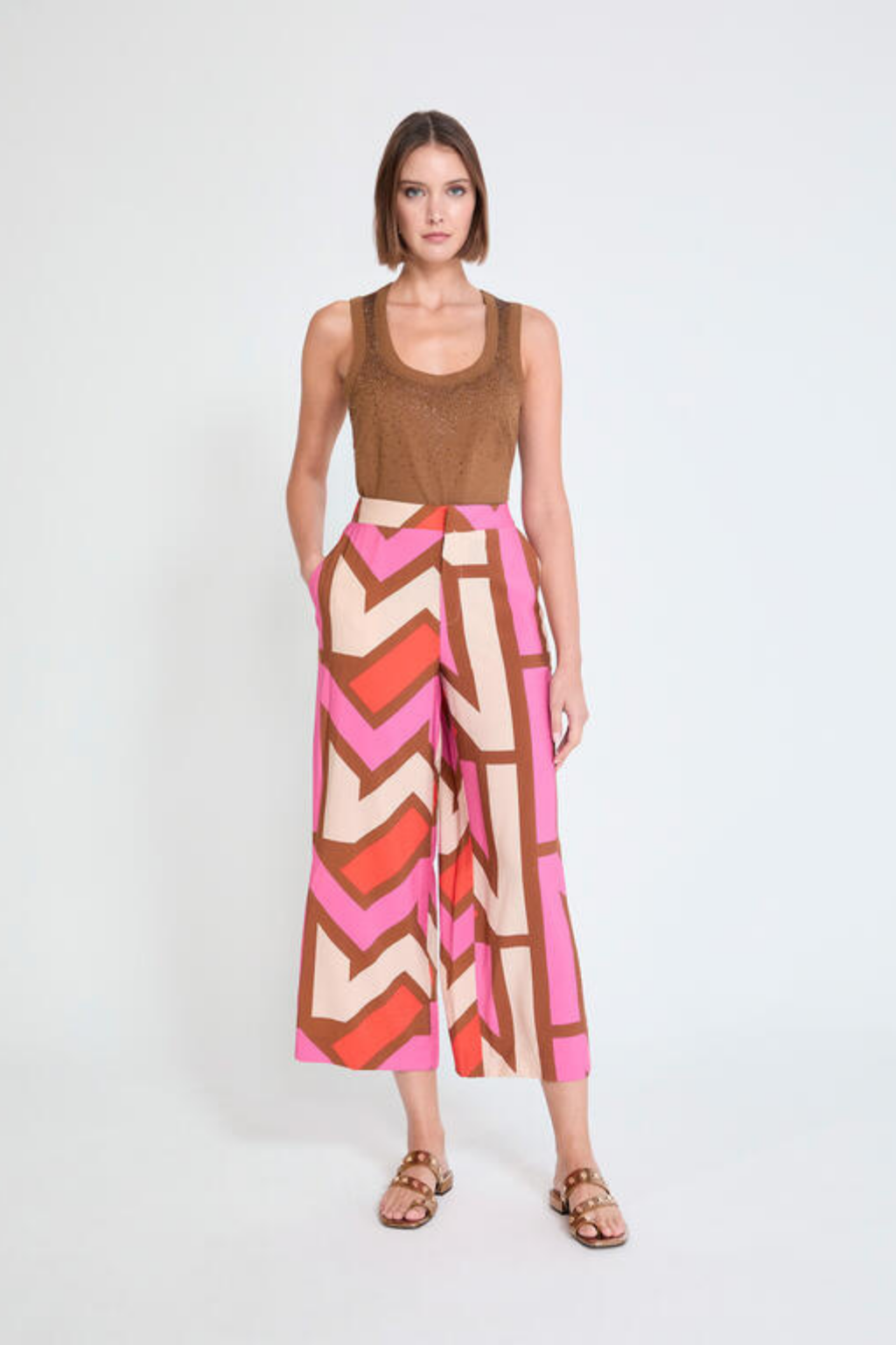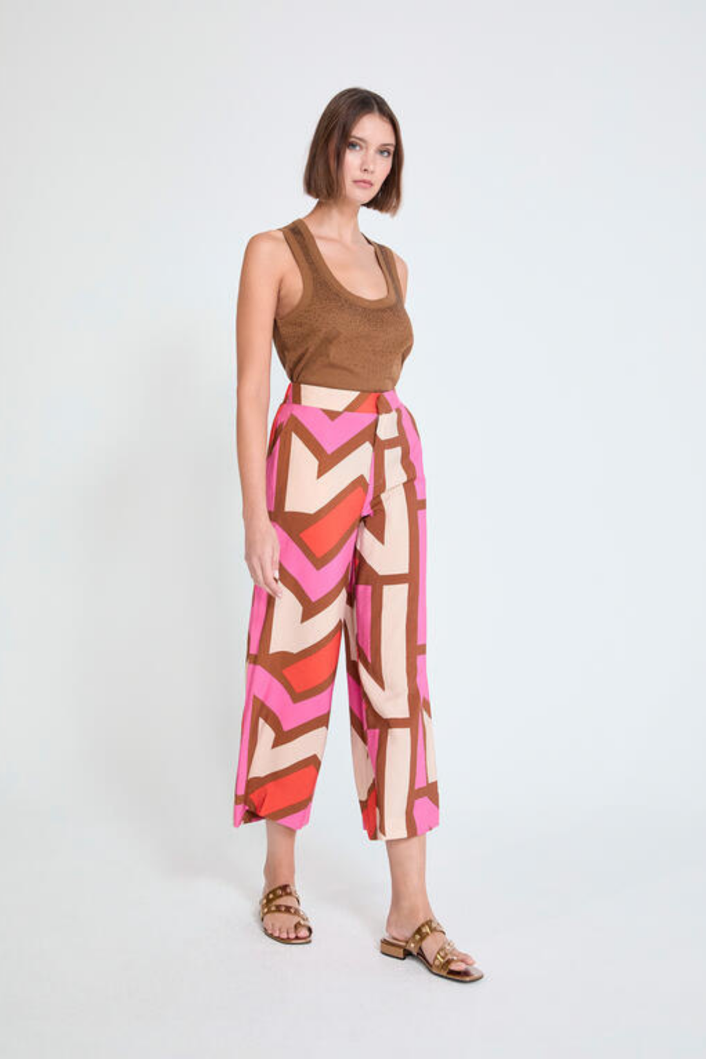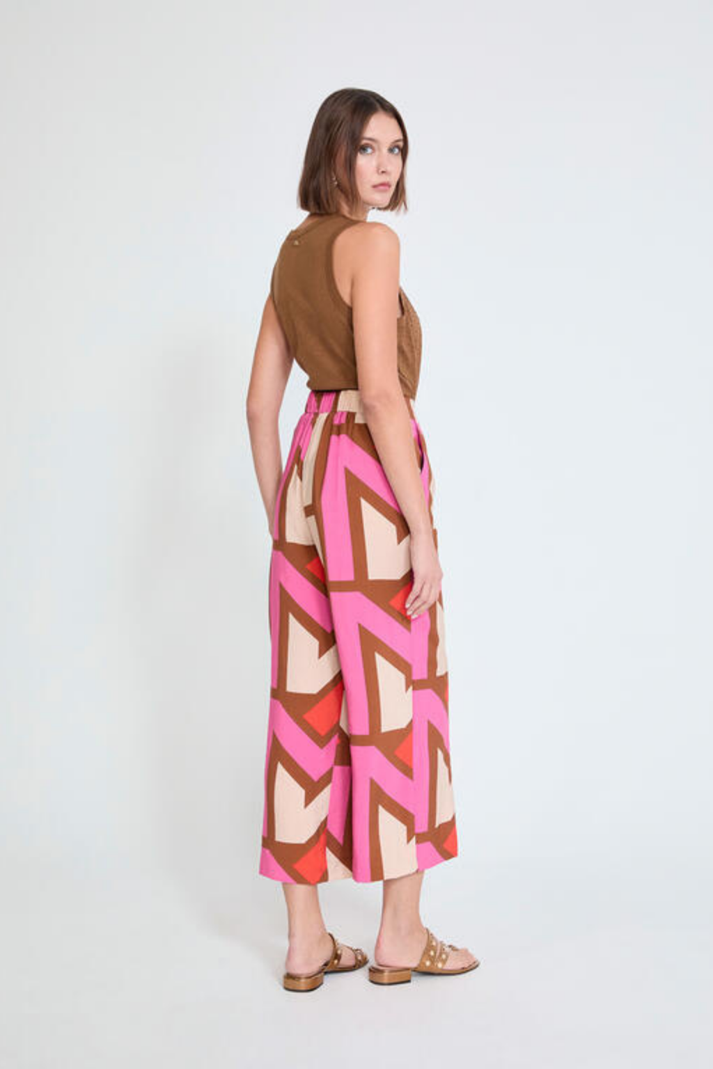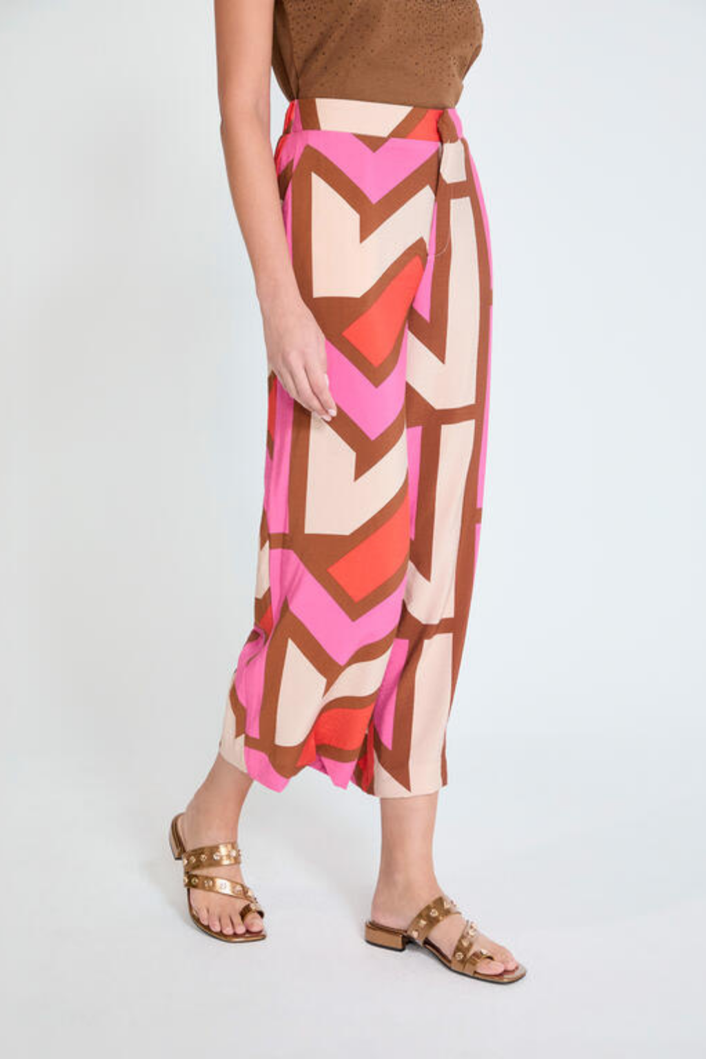 Calças de corte fluido com padrão geométrico multicolor, ideais para um look moderno e cheio de personalidade. Leves e confortáveis, são perfeitas para conjugar com tops neutros ou coordenados para um visual elegante e descontraído.
