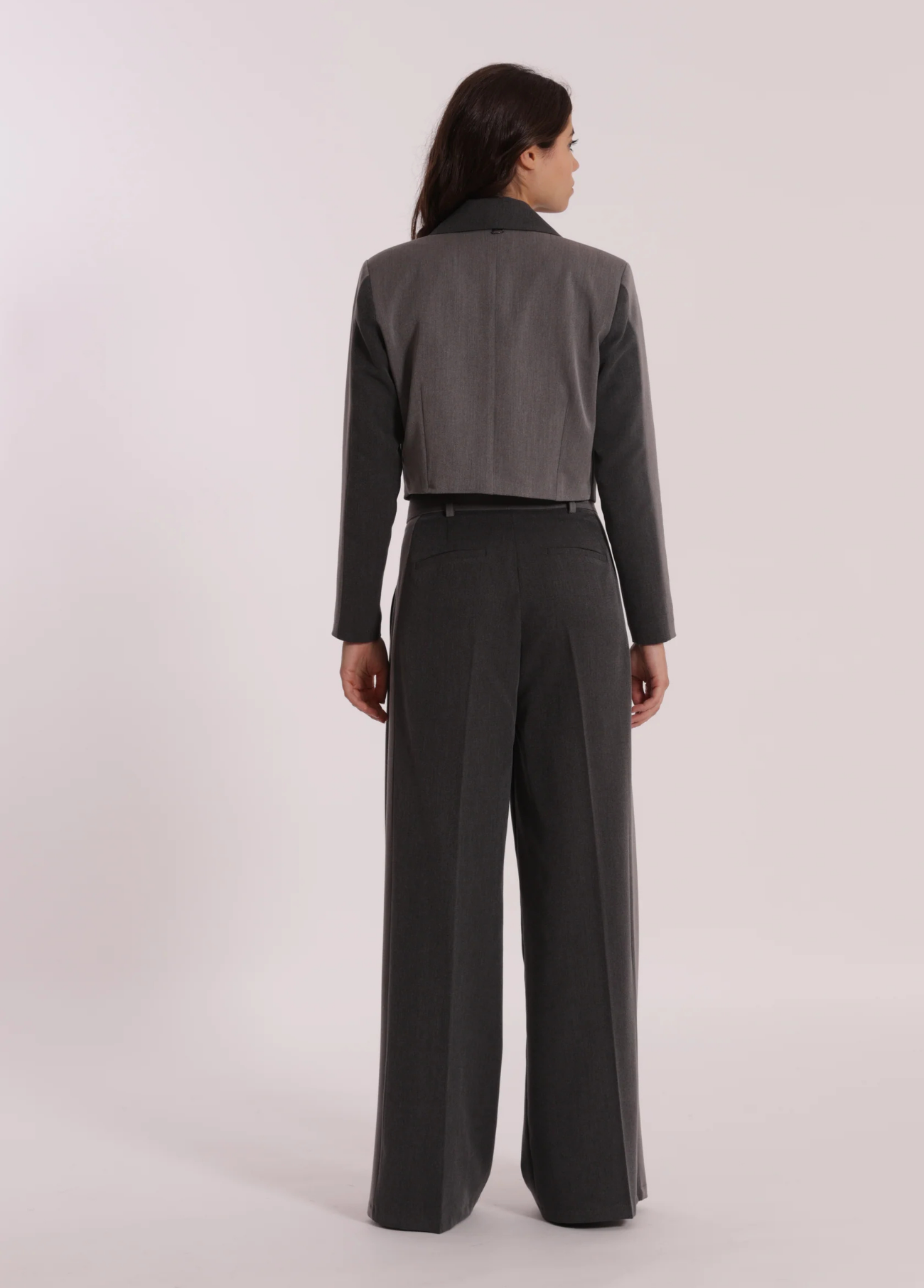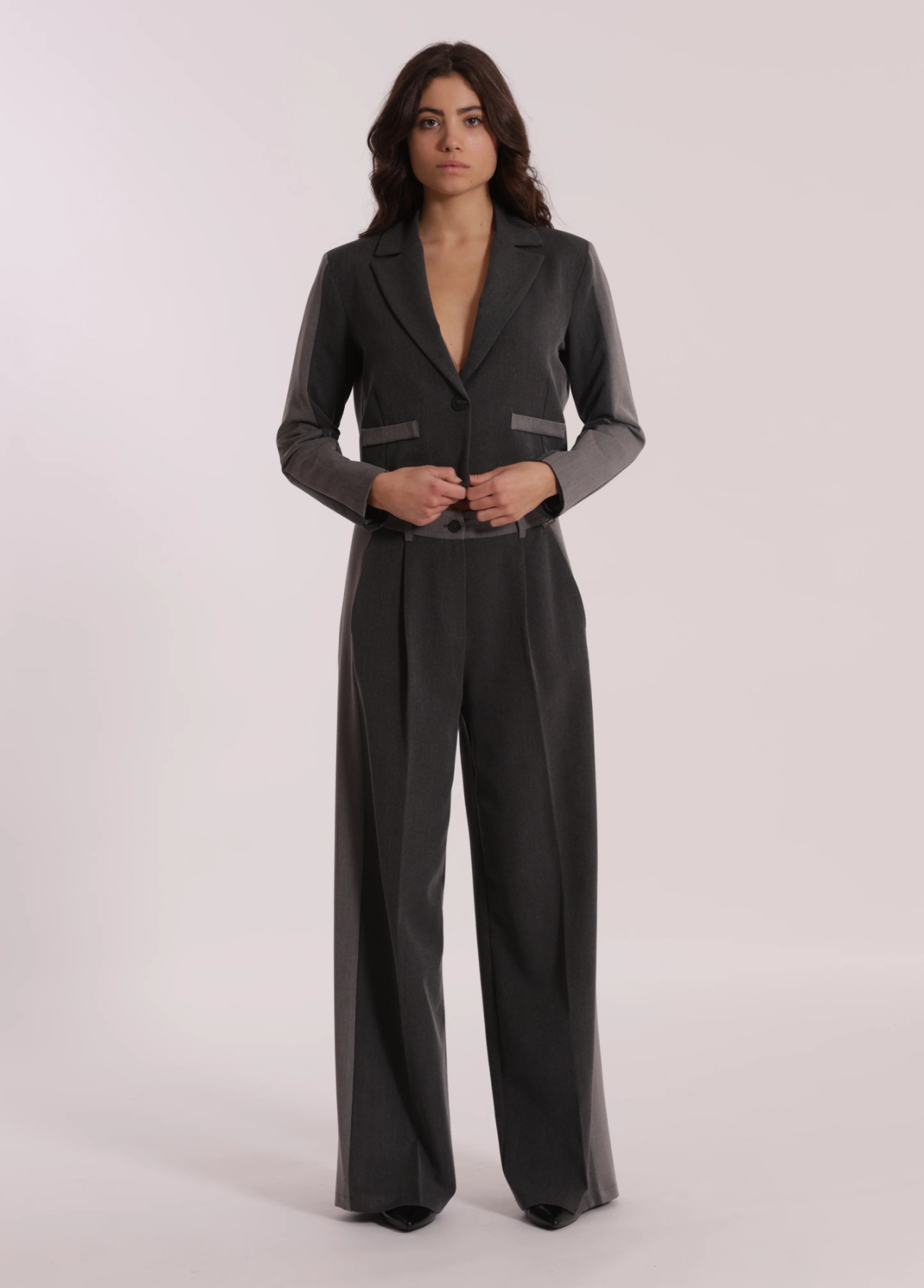 Calças de corte reto e cintura média em tom cinza bicolor, elegantes e versáteis. O design com pregas frontais e caimento fluido garante sofisticação e conforto em qualquer ocasião. Combine com o blazer de conjunto para um look moderno e poderoso.
