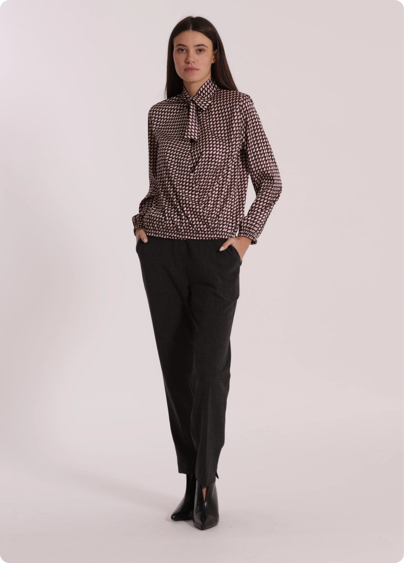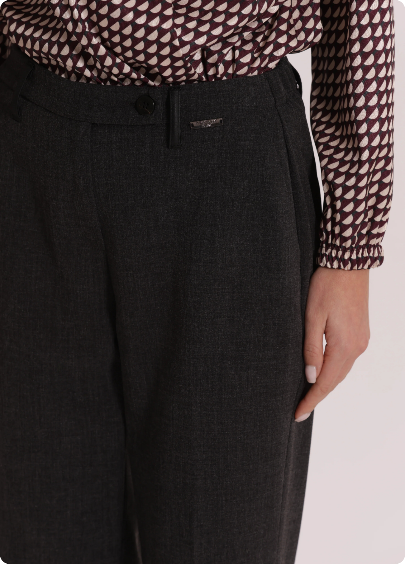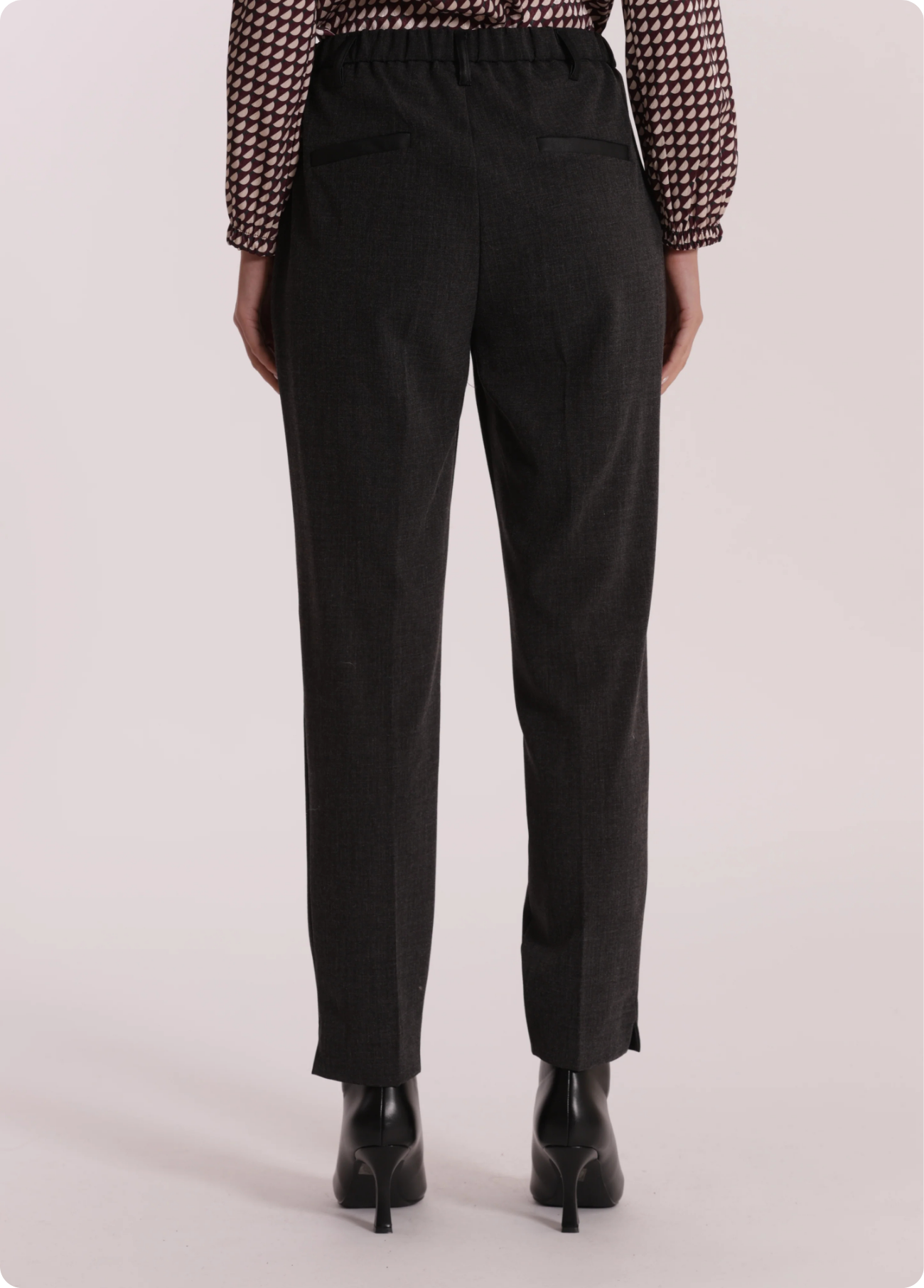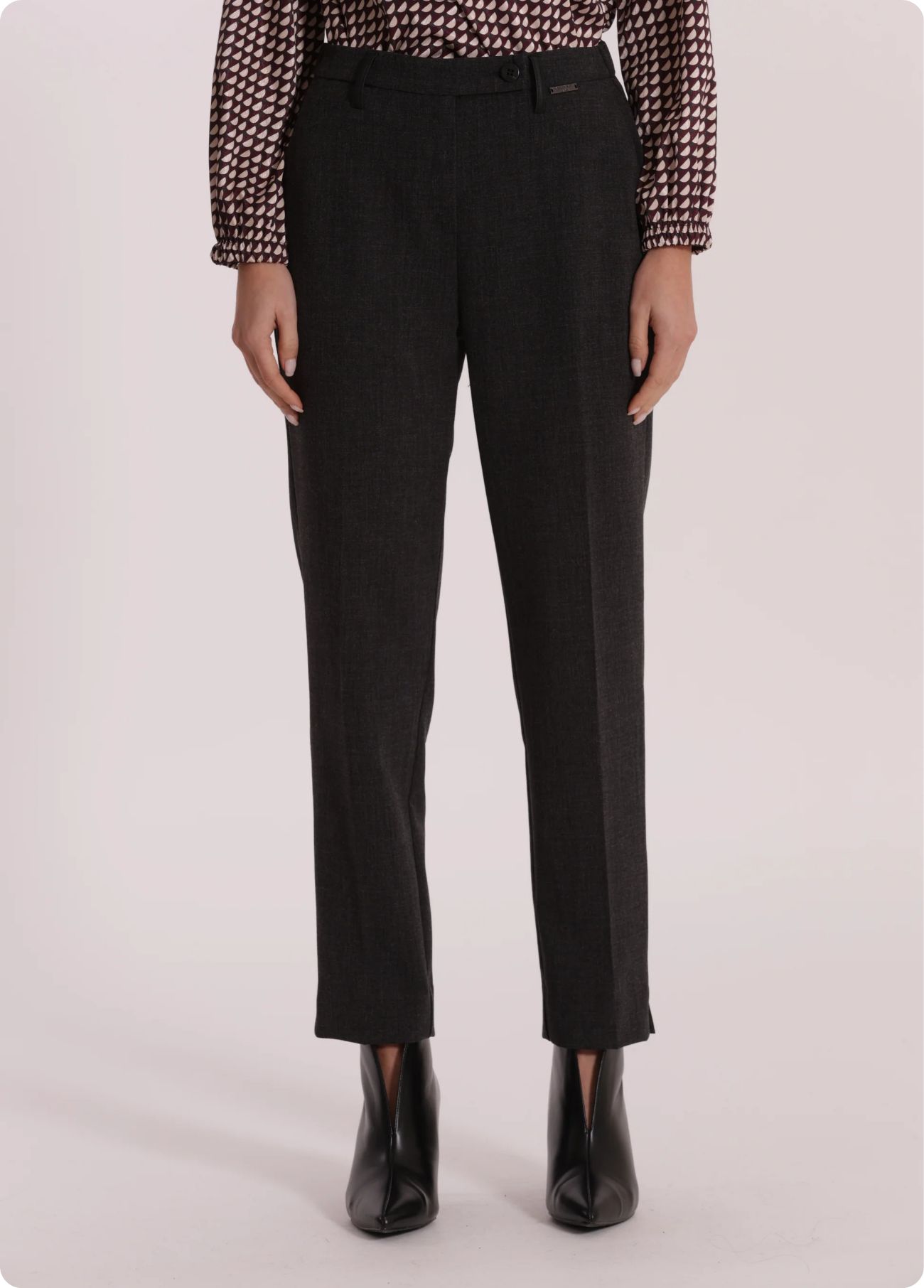 Calças clássicas em tom cinza escuro, de corte reto e cintura média. Elegantes e versáteis, apresentam bolsos laterais discretos e presilhas para cinto. O tecido estruturado garante caimento impecável, tornando-as ideais para coordenados de escritório ou para looks modernos quando combinadas com camisas ou camisolas.