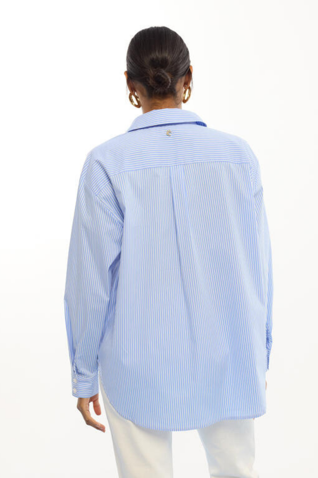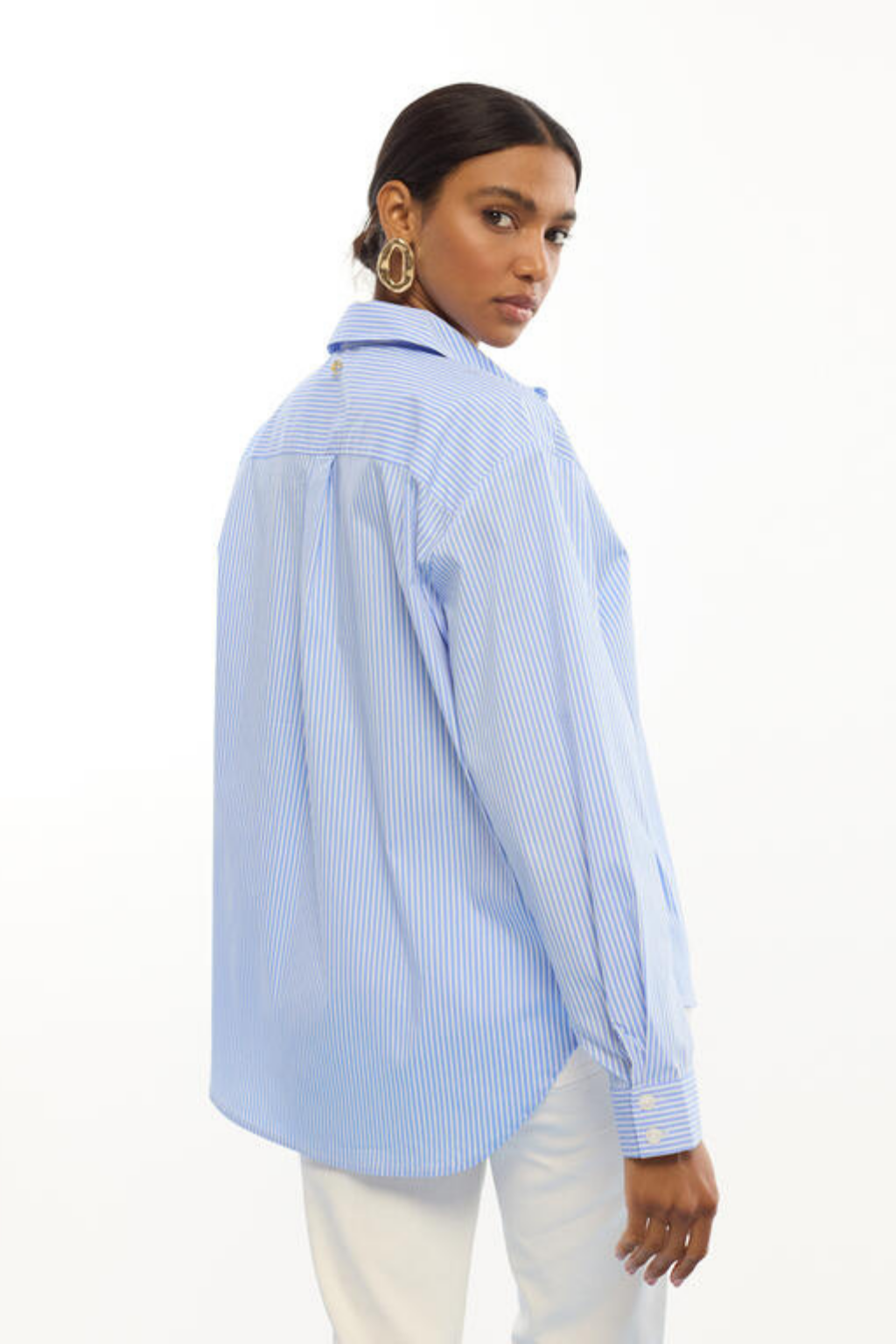 Camisa às riscas em tons de azul, com delicadas aplicações florais em relevo no peito. Um modelo sofisticado e atual, perfeito para elevar looks casuais ou completar produções mais elegantes com um toque distintivo.