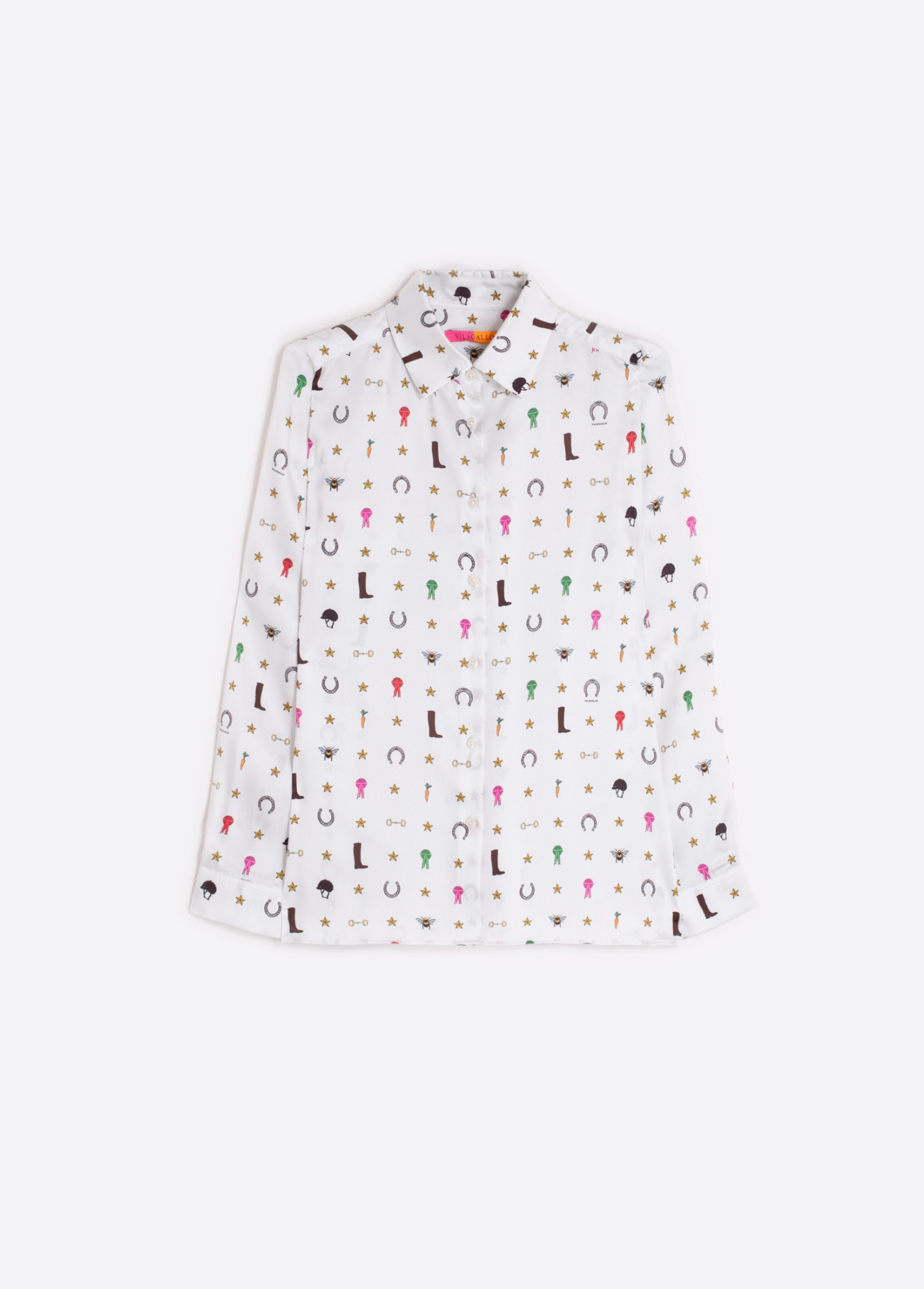 Camisa crua com estampa integral inspirada no hipismo: ferraduras, botas, fitas, abelhas, estrelas e outros motivos equestres em cores vibrantes. Gola clássica, fecho frontal com botões visíveis e punhos abotoados. Corte reto com bainha levemente arredondada. O tecido é leve e tem caimento suave.