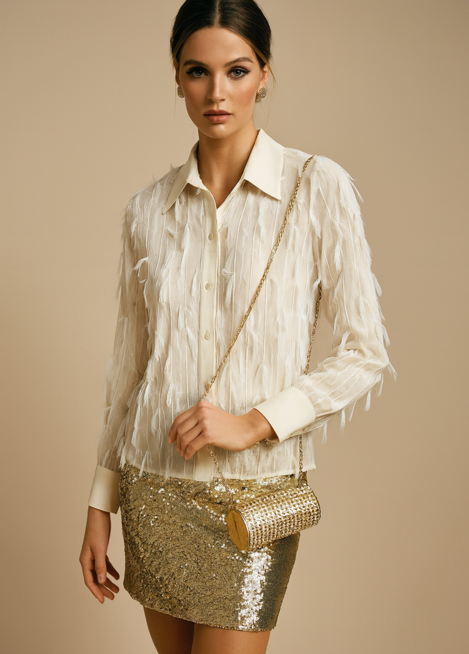 Camisa elegante da marca Operà, feita em Itália, que combina leveza e sofisticação com um toque de fantasia. O tecido translúcido apresenta delicados relevos em forma de penas, criando um efeito visual refinado e feminino. De corte clássico com gola estruturada e botões frontais, é perfeita para coordenar com saias ou calças de festa, acrescentando glamour e elegância a qualquer ocasião especial.