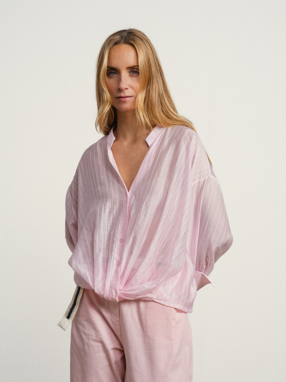 Camisa em tecido semi-transparente com riscas verticais discretas que criam profundidade visual. O nó no cós define a silhueta e permite ajustes personalizados, enquanto o corte oversize oferece conforto sem comprometer a elegância. Ideal para composições sofisticadas, tanto em contextos formais como casual-chic. A leveza do material torna-a versátil para diferentes estações.