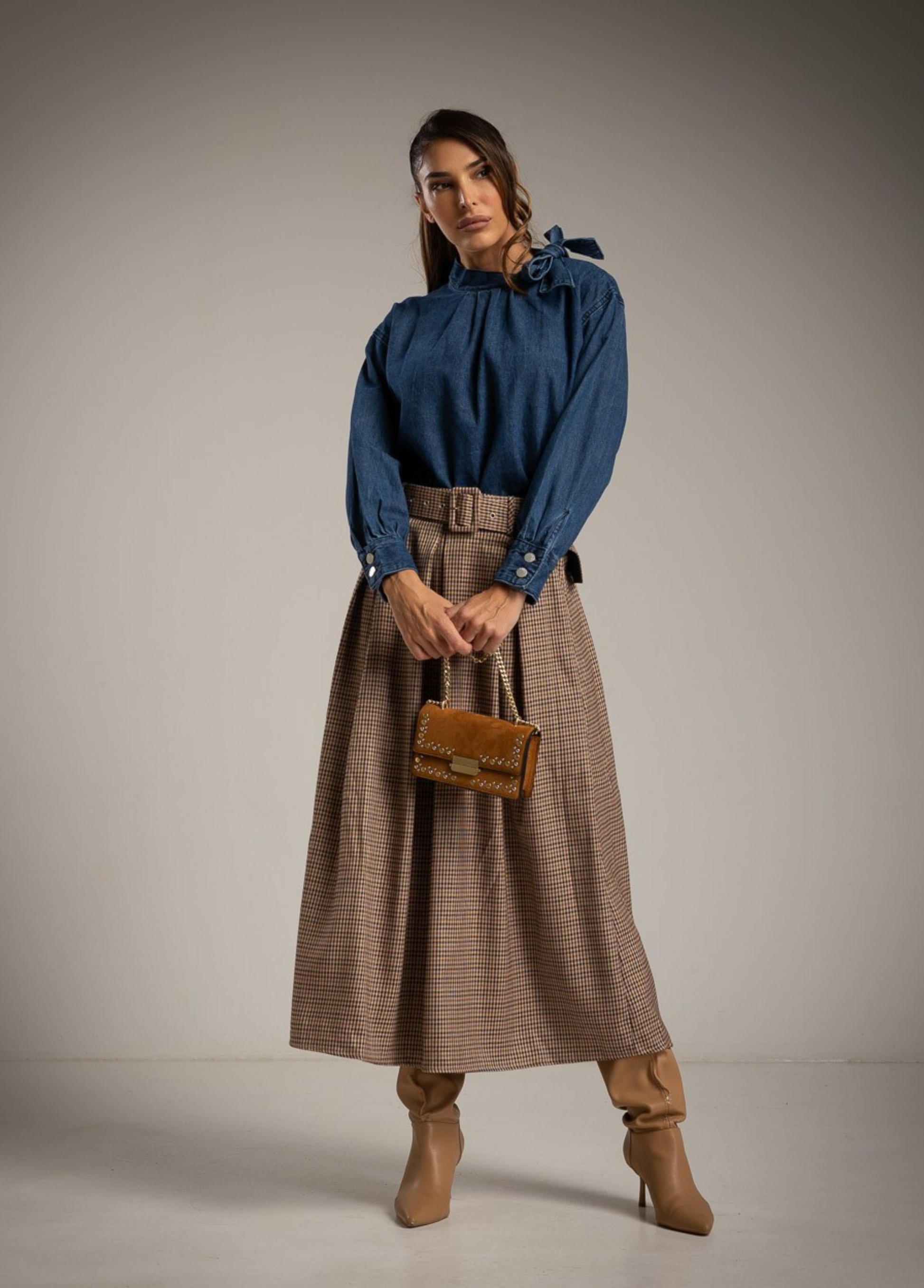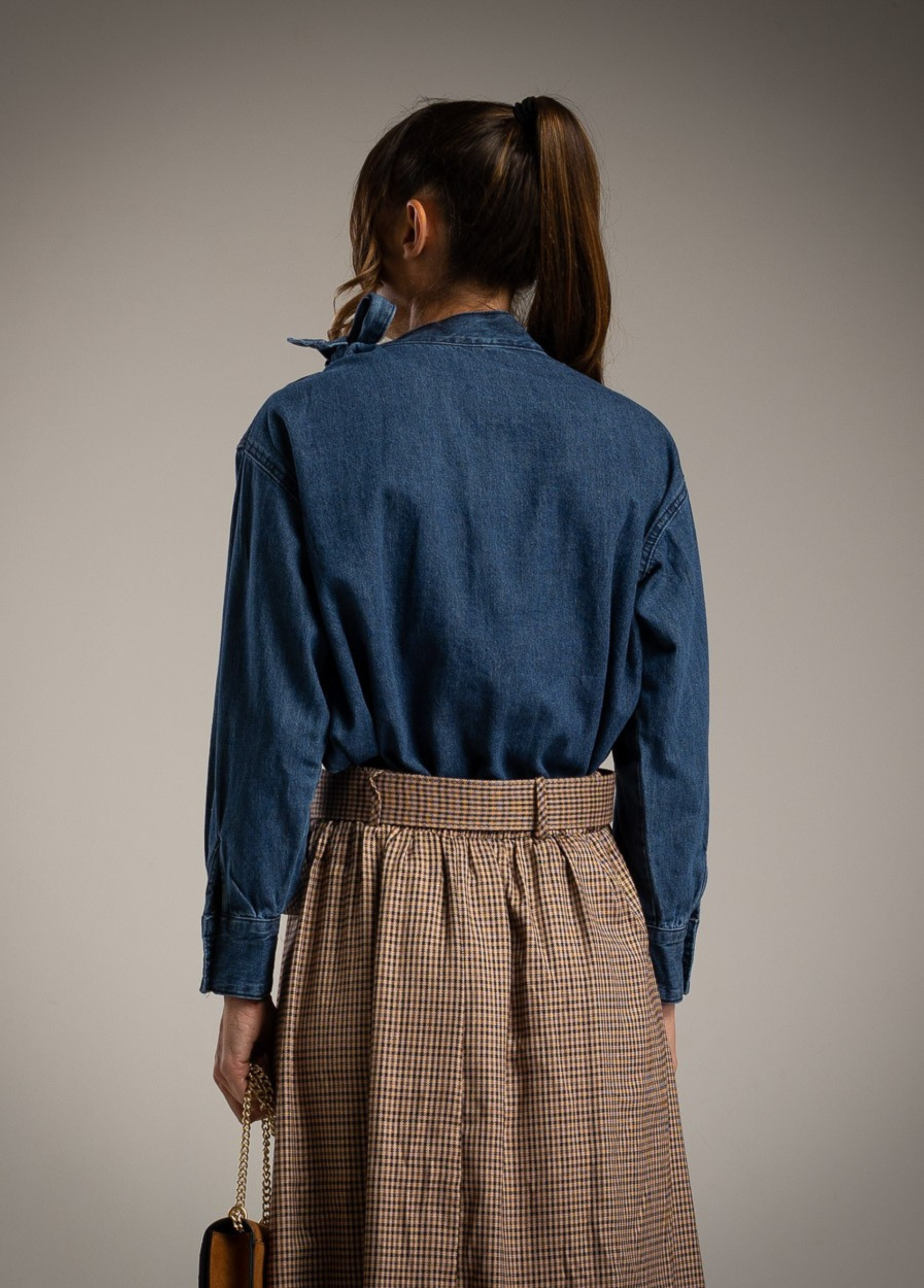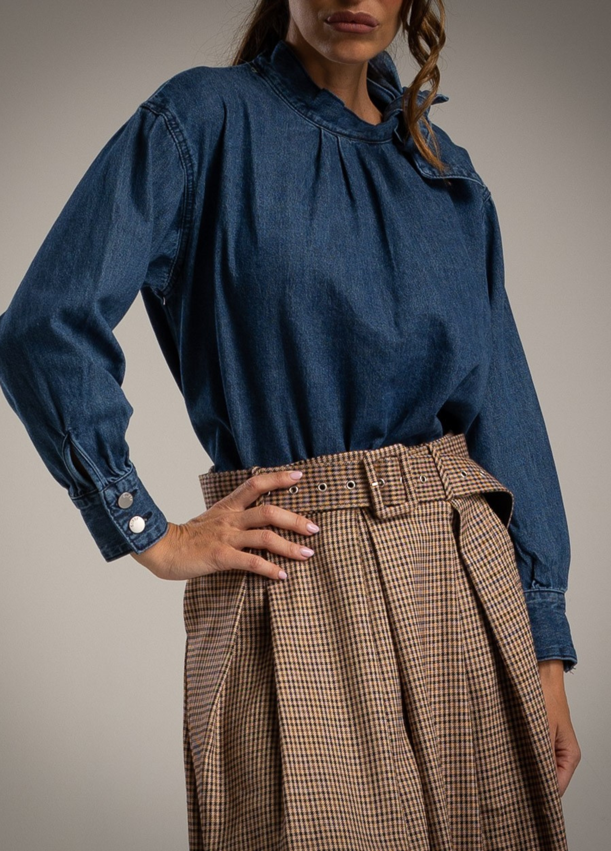 Camisa em ganga 100% algodão, fabricada na RPC. Apresenta gola subida com laçada lateral, detalhe franzido no decote e punhos com botões metálicos. O tecido natural em algodão oferece conforto e respirabilidade, enquanto o corte fluido garante um toque feminino e contemporâneo. Ideal para coordenar com saias ou calças de cintura alta, num estilo casual-chic.