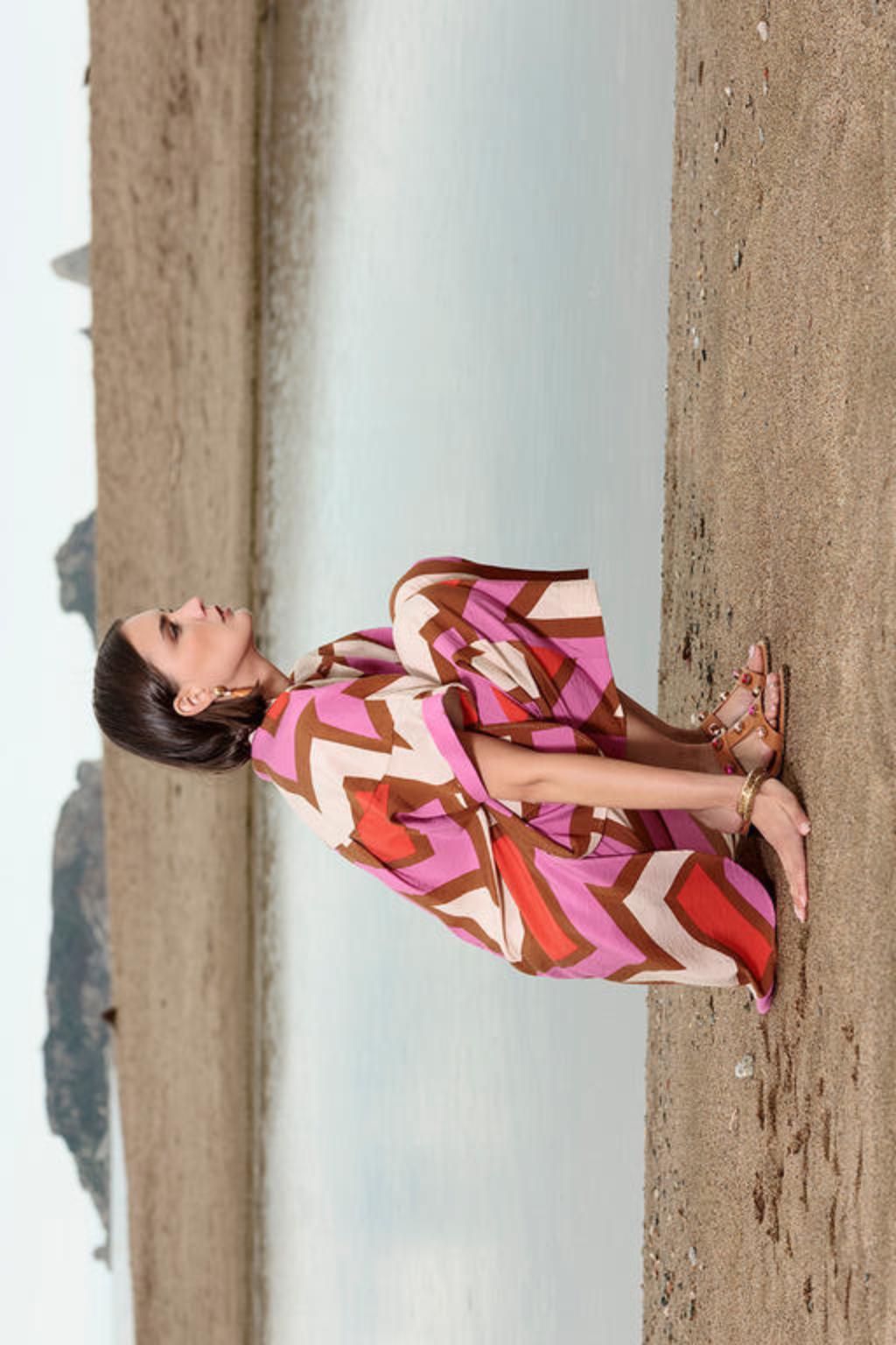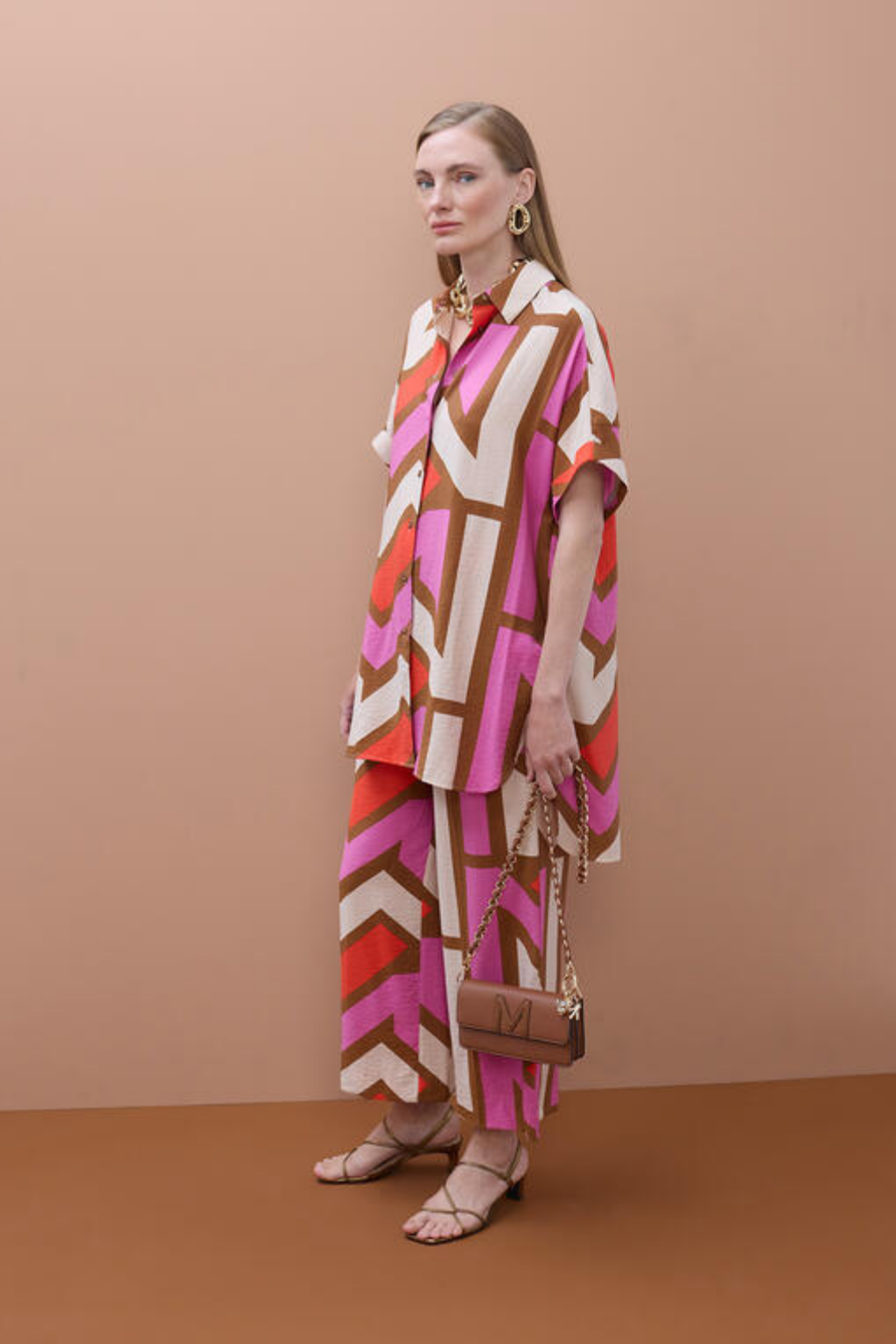 Camisa fluida com padrão geométrico multicolor, ideal para looks modernos e cheios de personalidade. Leve e confortável, pode ser usada coordenada com as calças ou combinada com peças neutras para um visual elegante e versátil.