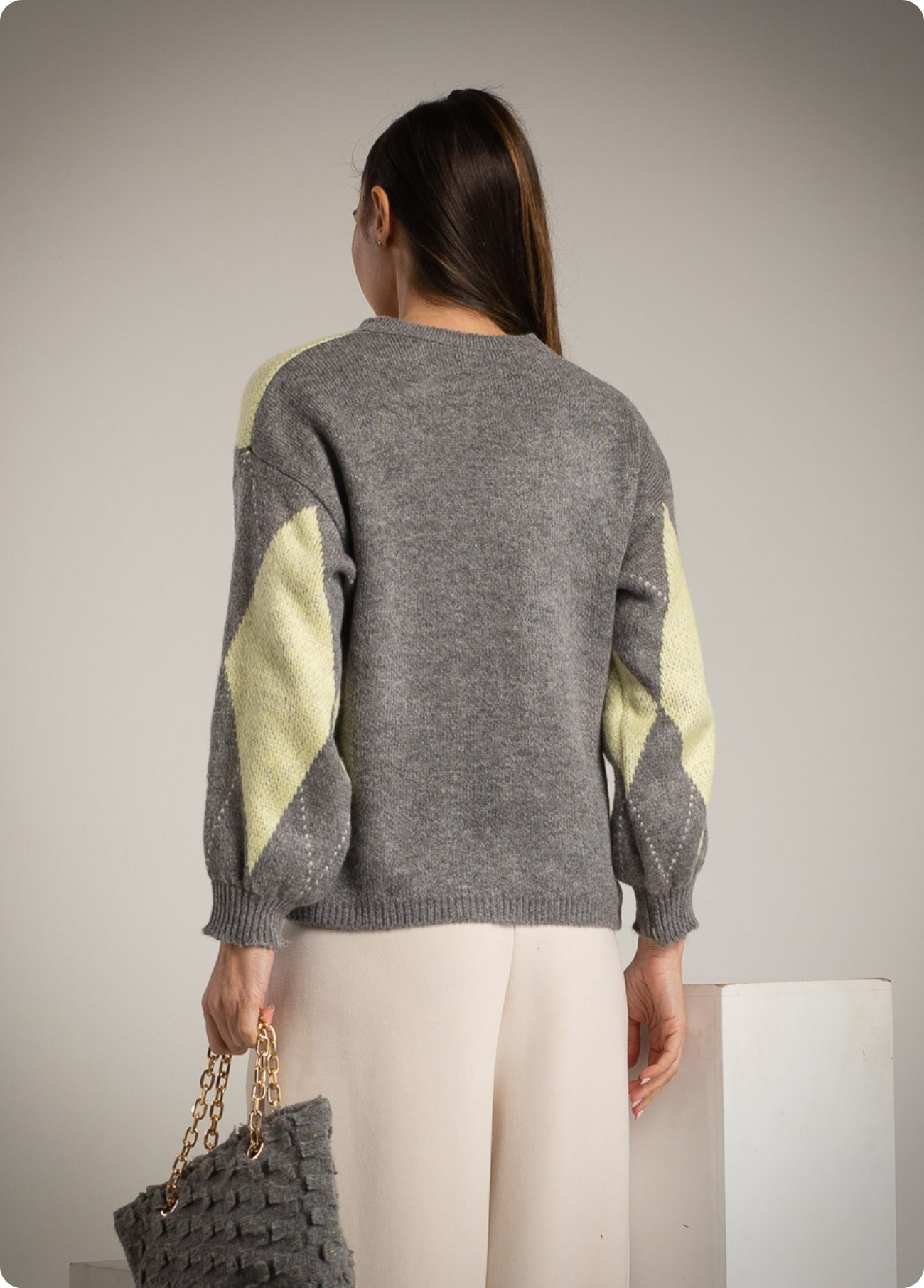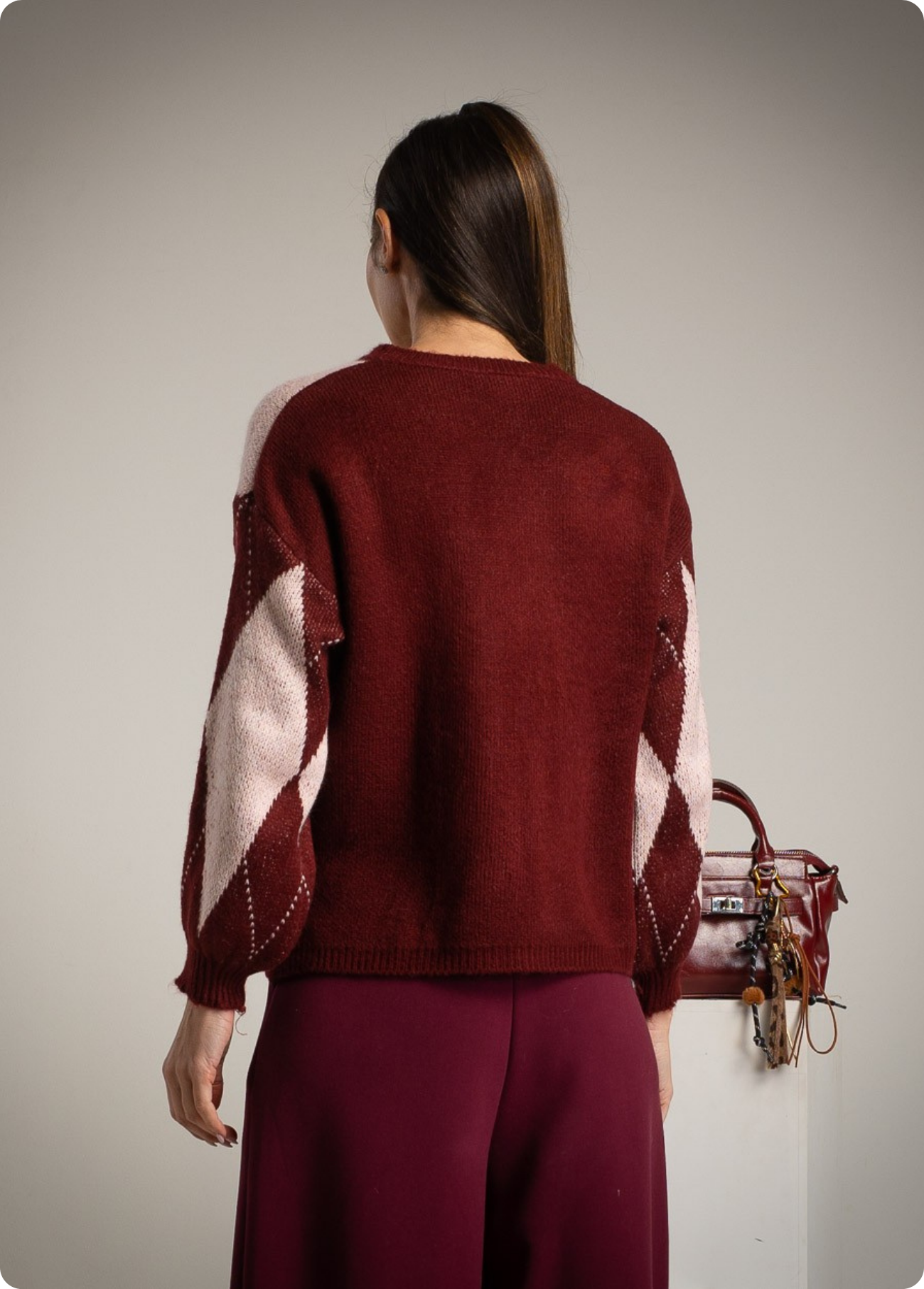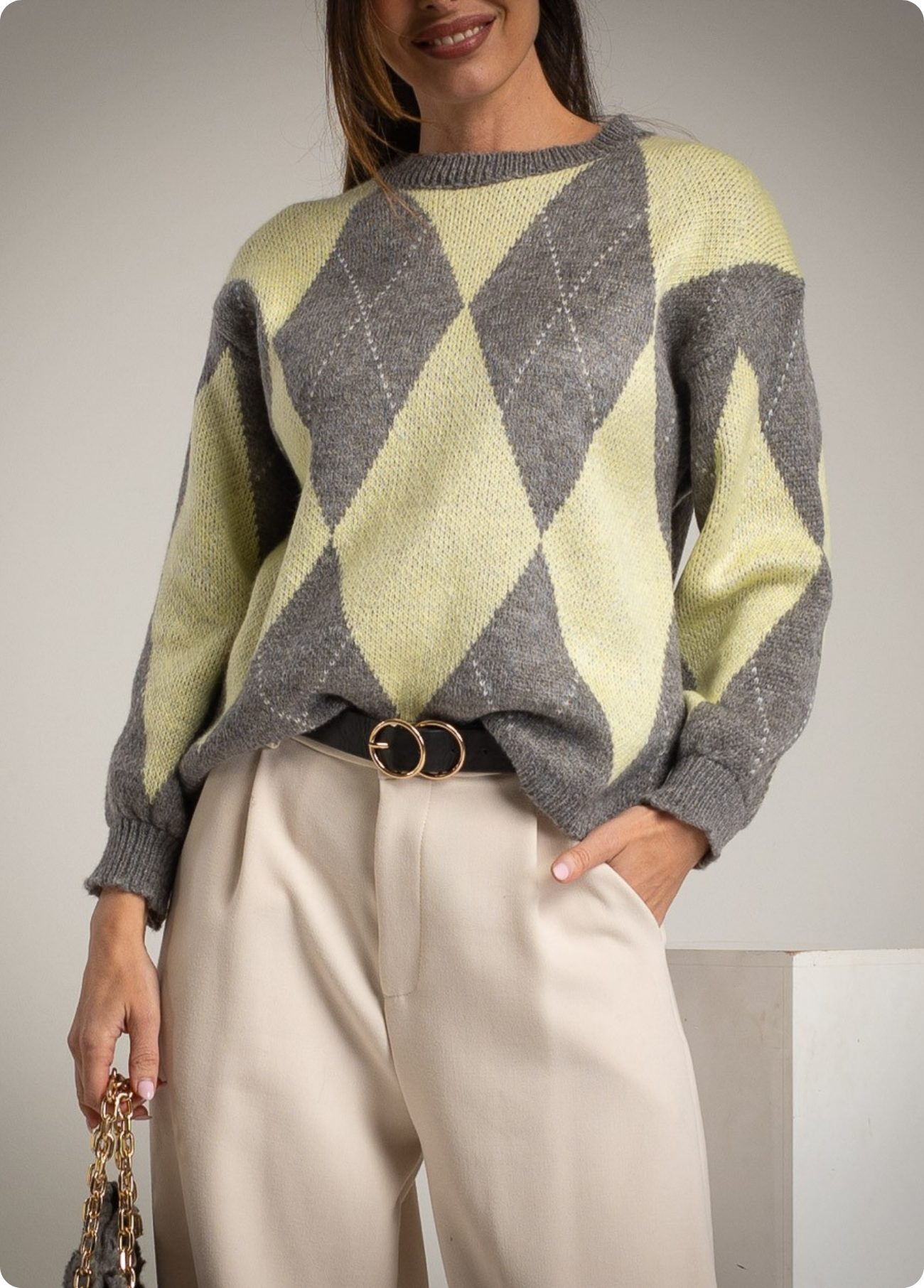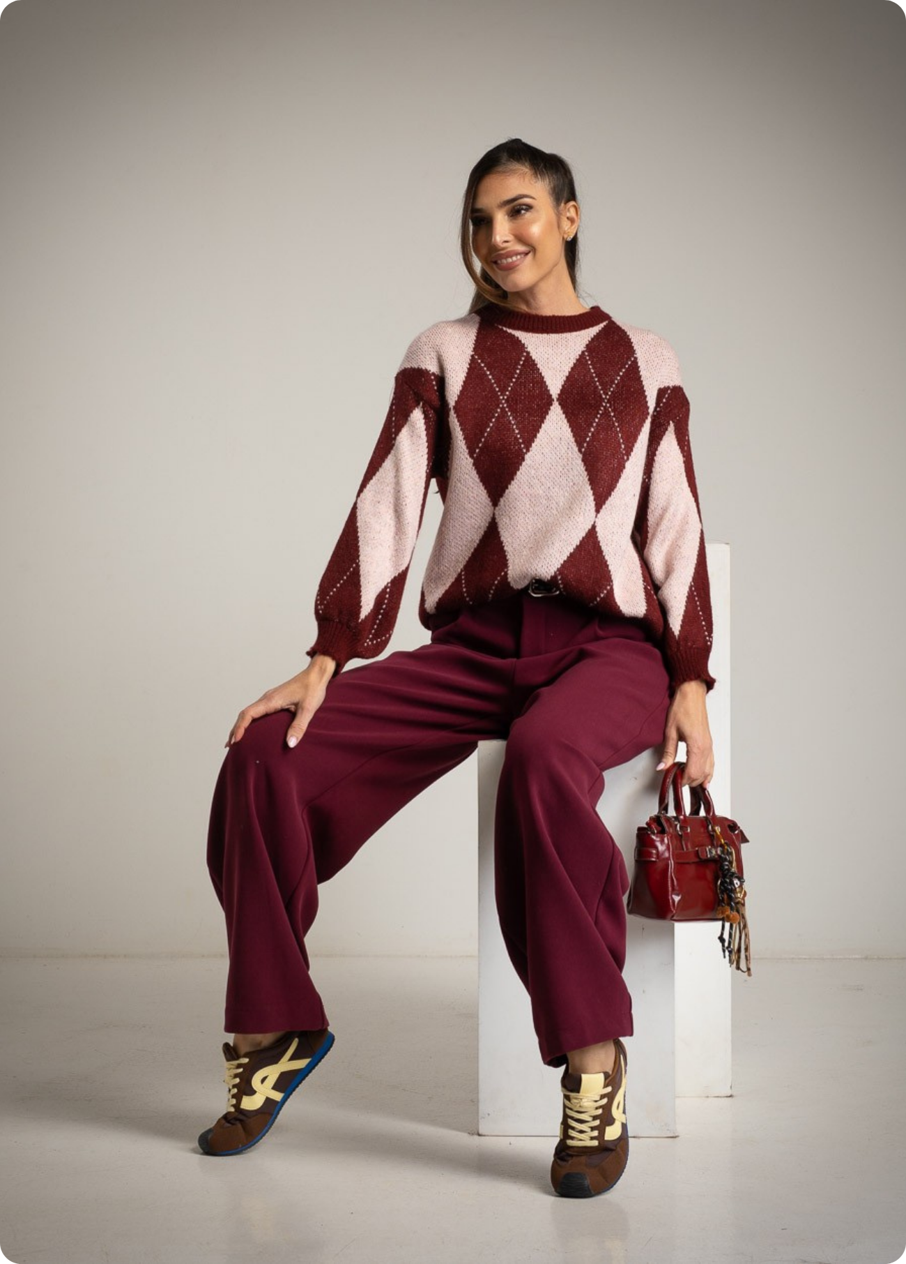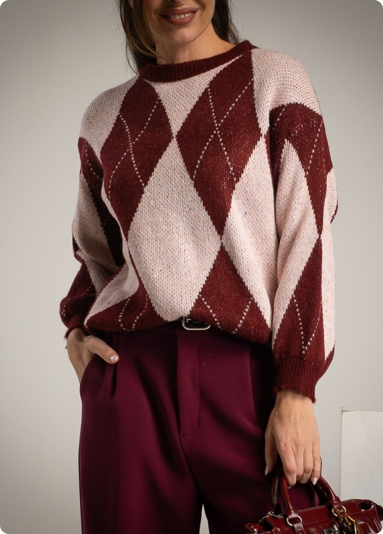 A camisola de losângulos com composição de lã traz um toque clássico e moderno ao mesmo tempo, perfeita para looks confortáveis com estilo. Versátil para coordenar com calças, saias ou jeans, cria facilmente looks casuais ou mais arranjados com acessórios. Disponível em duas combinações de cor – bordeaux com rosa ou cinza com lima suave, permitindo escolher entre um visual mais quente e intenso ou mais fresco e contemporâneo.