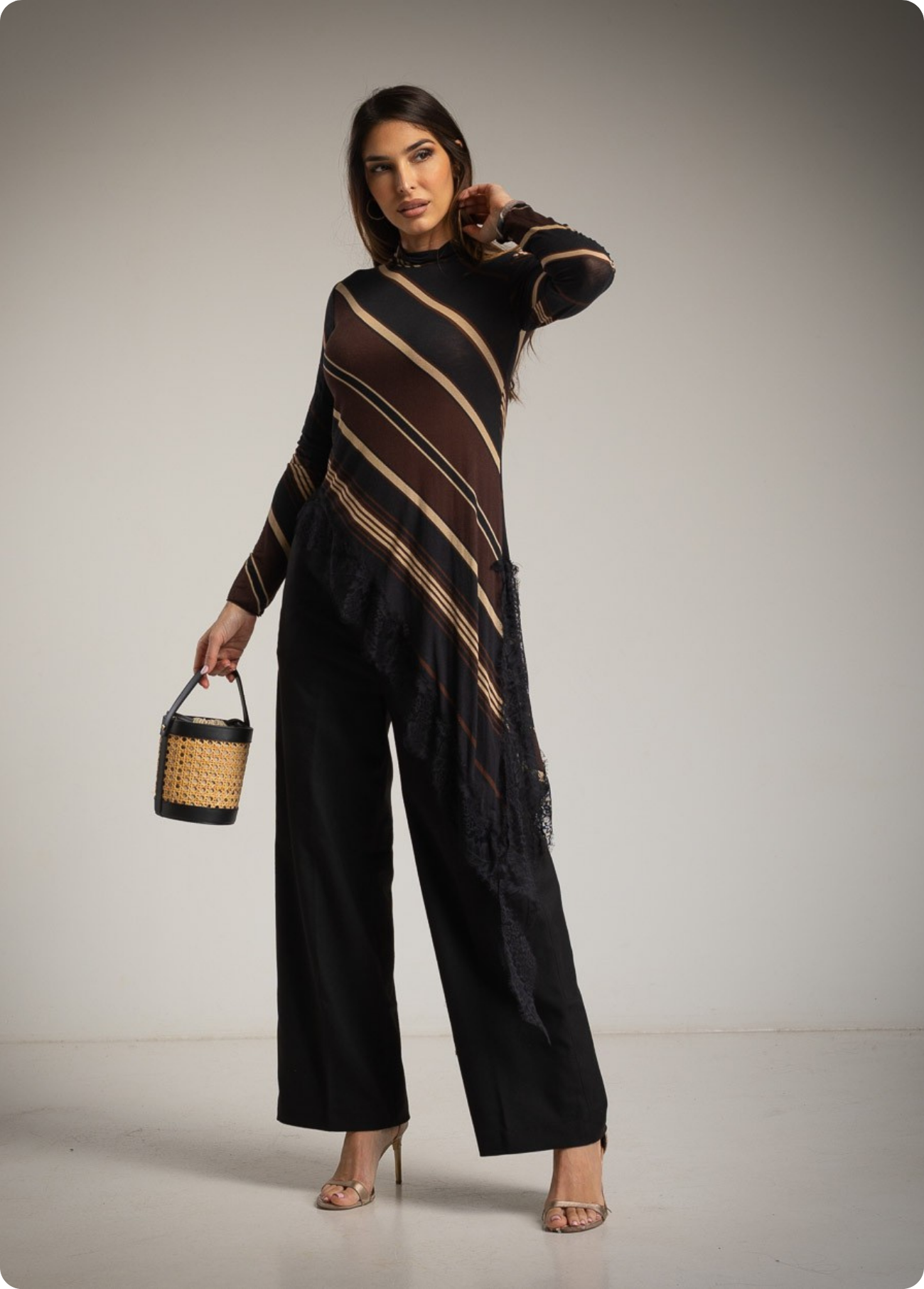 Elegante e feminina, destaca-se pelo jogo de transparências que acrescenta sofisticação ao look. Ideal para usar com calças clássicas ou jeans, tanto em ocasiões especiais como no dia a dia.