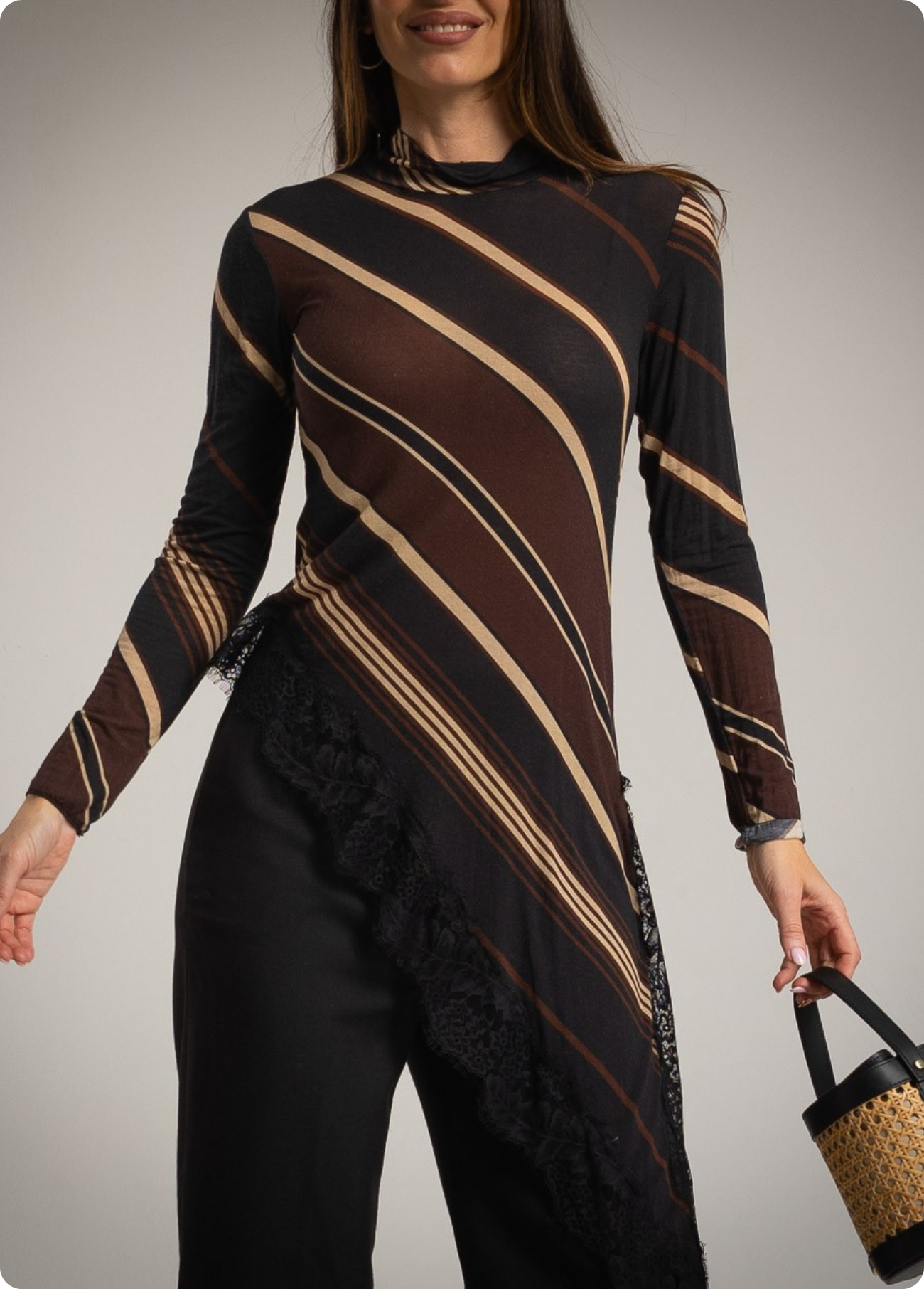 Camisola de manga comprida com padrão de riscas e detalhe em renda lateral.
