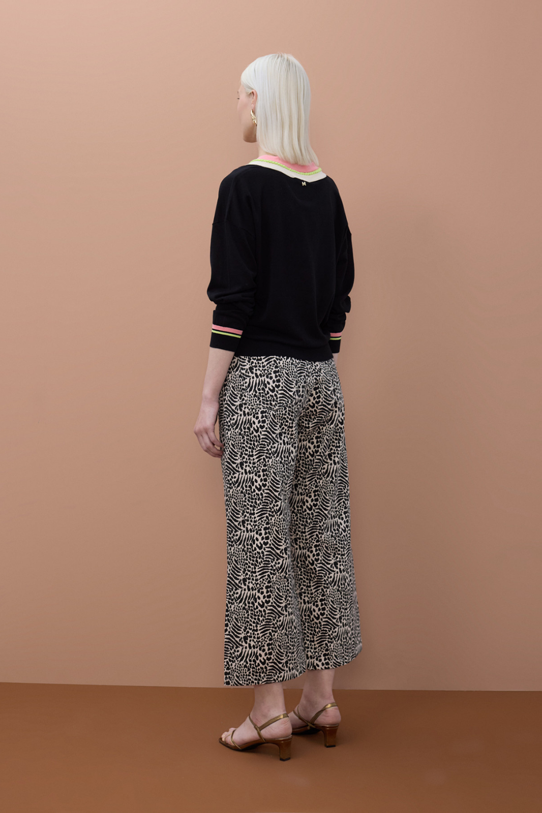 Suéter de malha suave com gola V em contraste e detalhe de trança. Manga longa e ajuste relaxado para um look casual chique. Perfeito para o dia a dia.