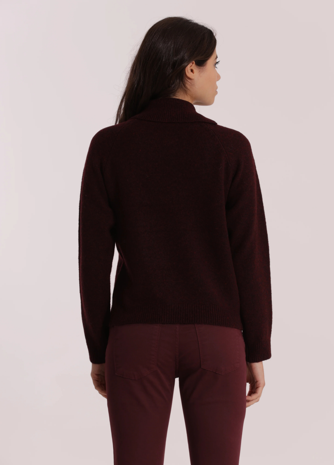 Esta camisola de malha distingue-se pelo seu design minimalista com gola estruturada e corte elegante. Disponível em duas cores versáteis — o tom suave de pérola e a intensidade do bordeaux — adapta-se tanto a coordenados casuais como a looks mais sofisticados. O toque macio e confortável aliado ao detalhe da gola confere-lhe um charme contemporâneo, tornando-a uma peça essencial para os dias frescos com elegância.