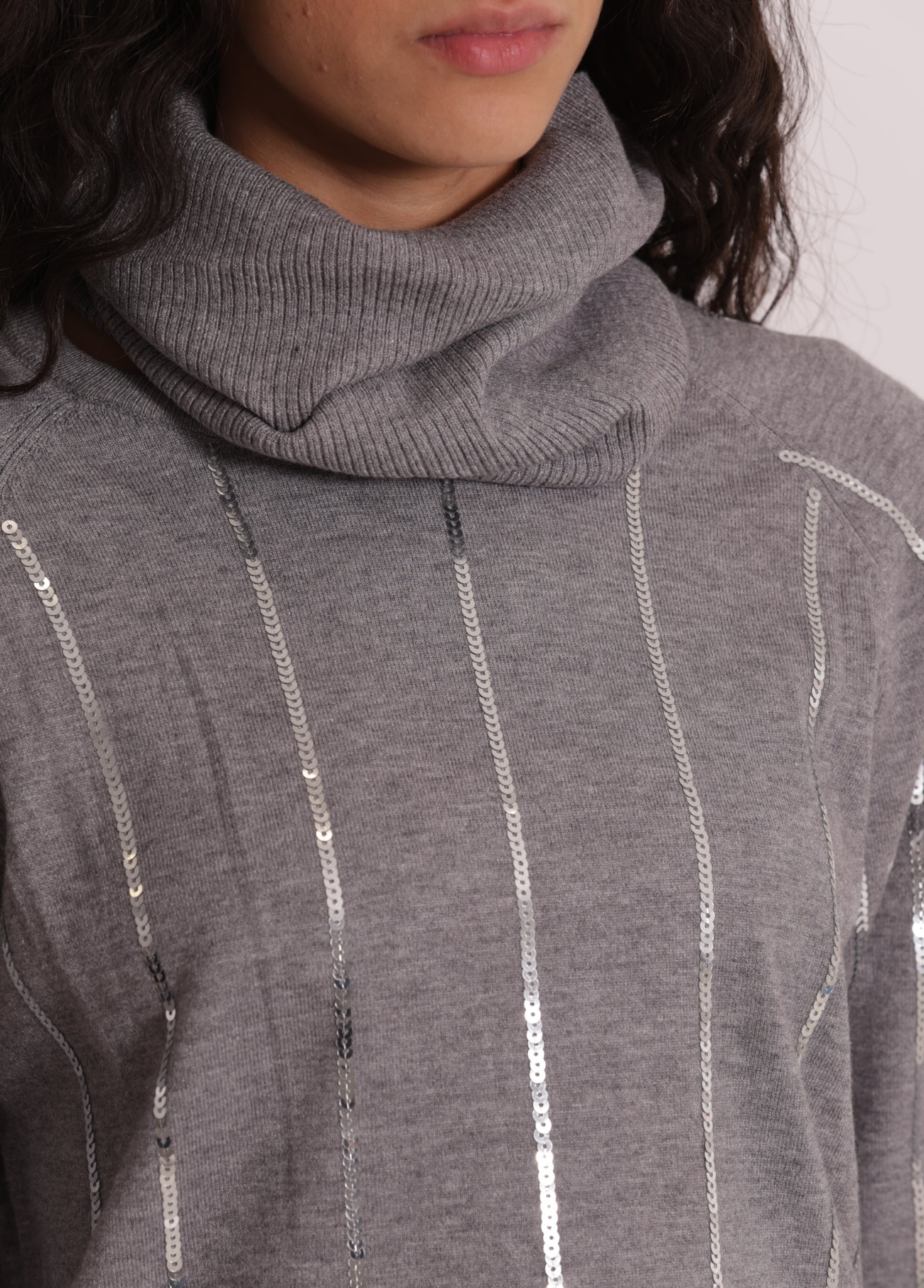 Camisola italiana Mimi Mua em malha macia, disponível em azul-marinho e cinza. Apresenta gola alta removível, que permite usar a peça de duas formas, e aplicações subtis de lantejoulas em padrão vertical que alongam a silhueta. Um modelo versátil, elegante e confortável para o dia a dia ou para um look mais sofisticado.