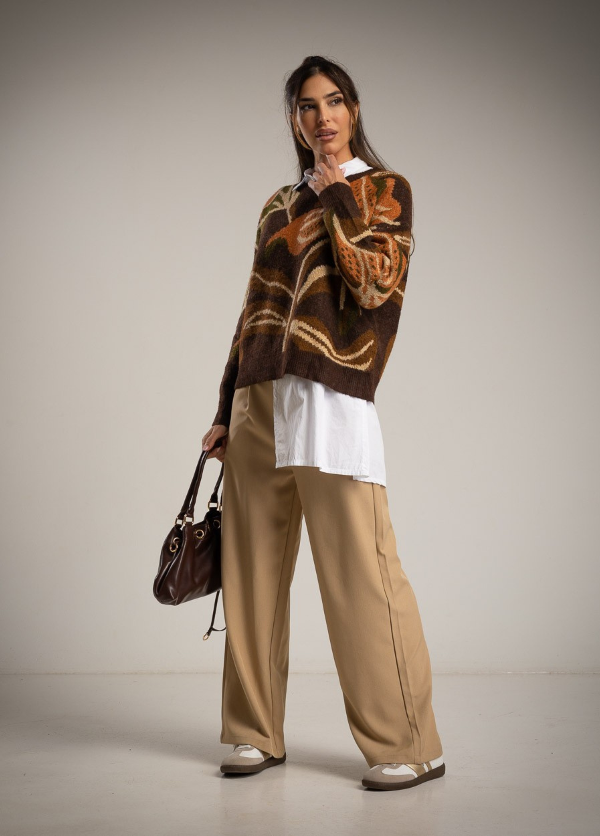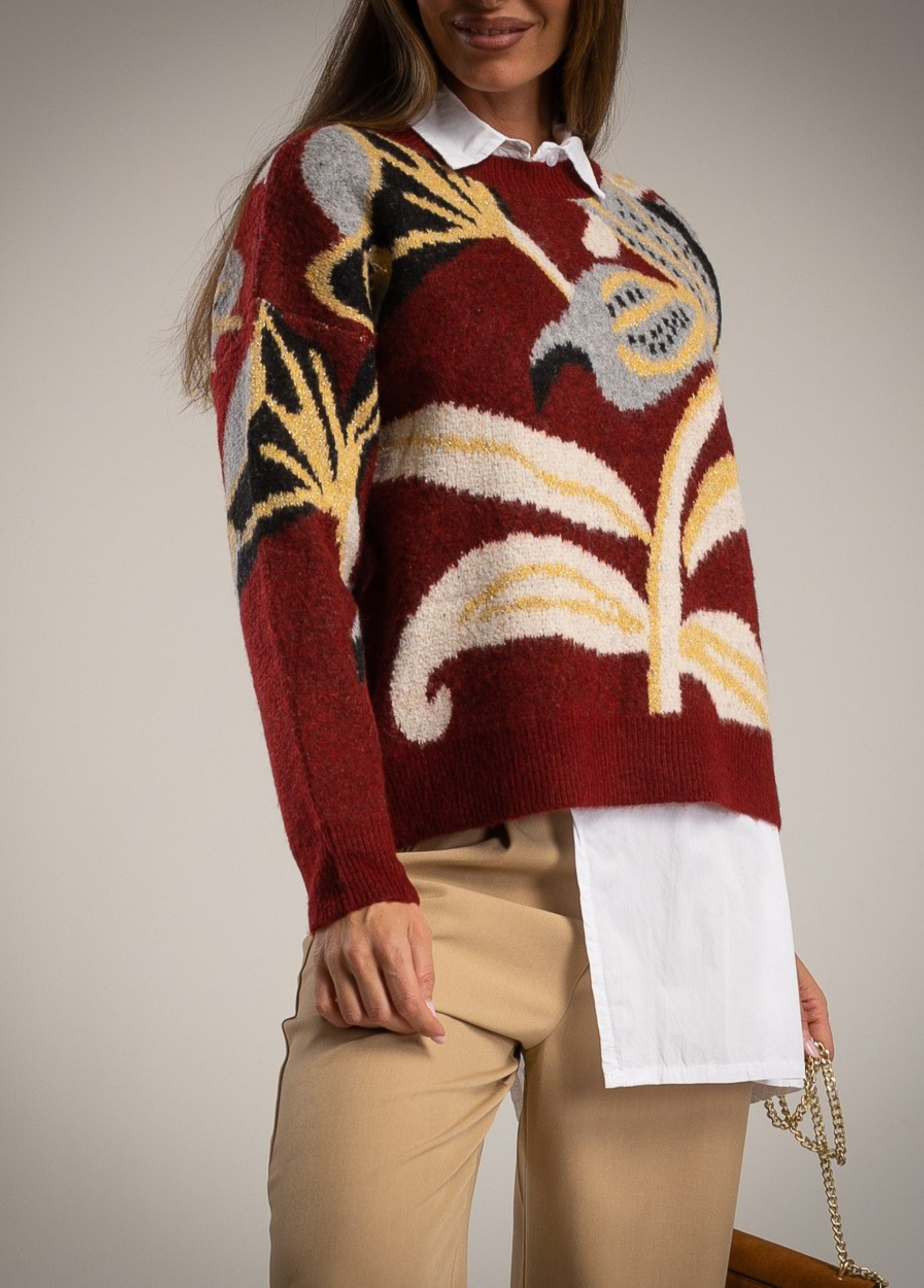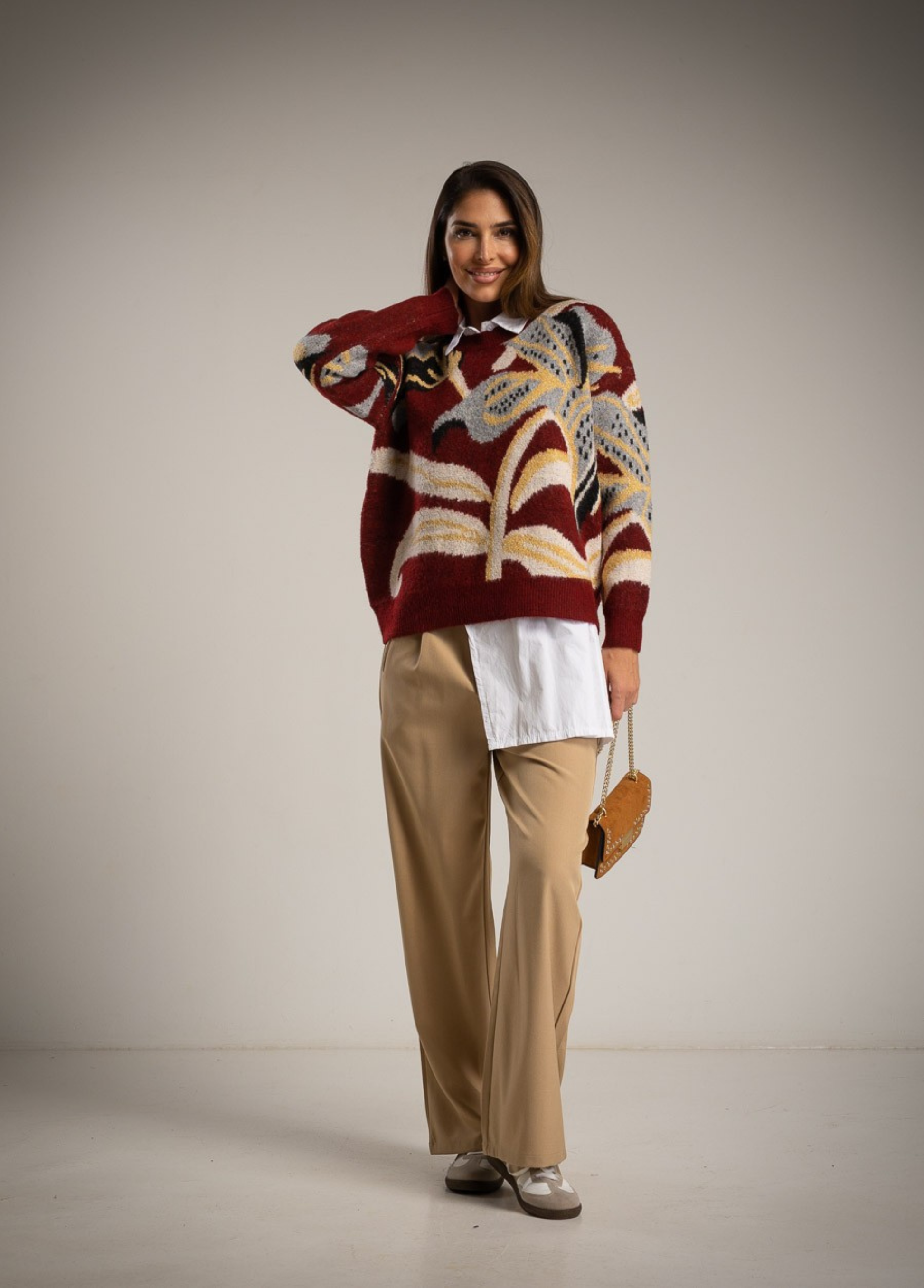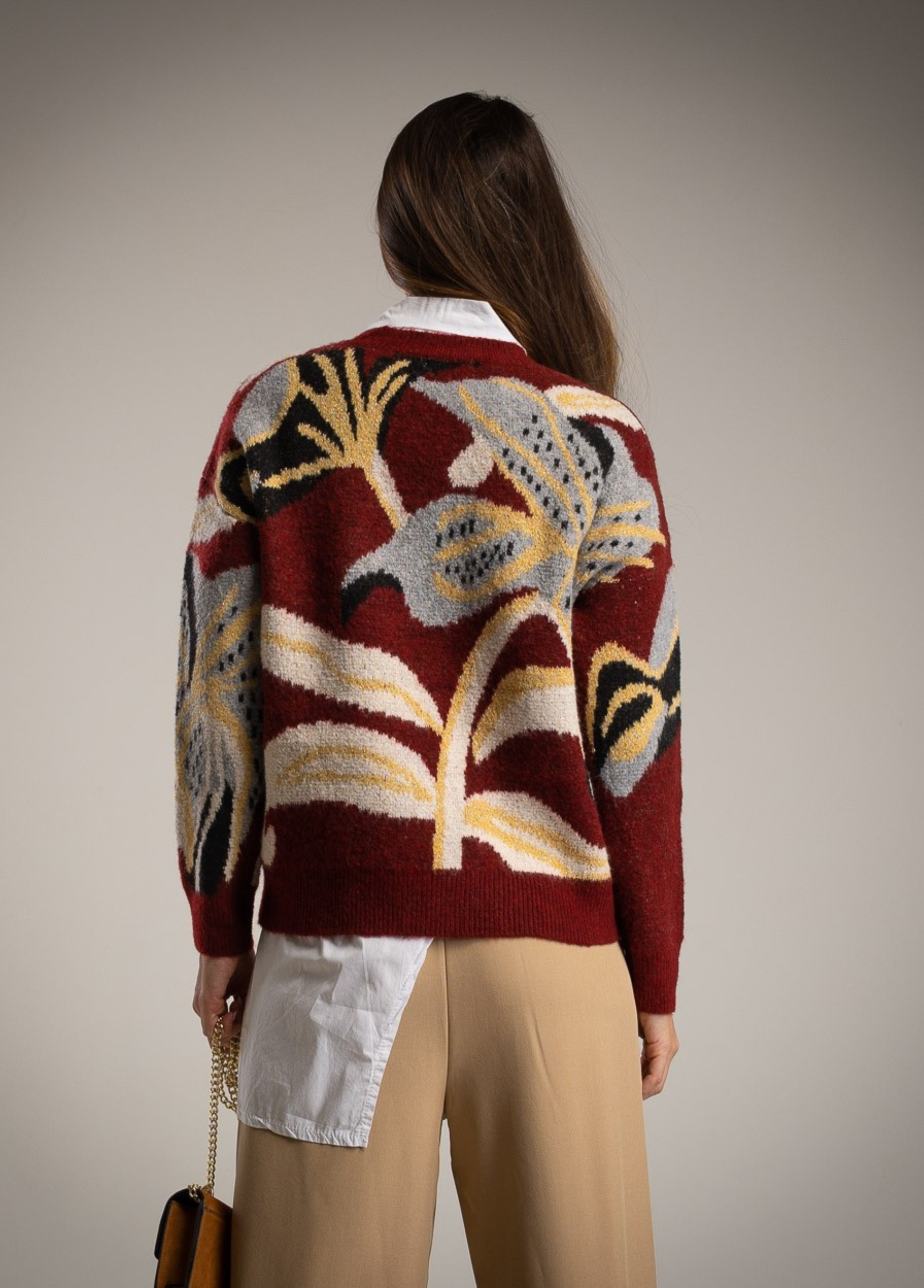 Camisola tricot oversize com padrão botânico inspirado em tapeçarias vintage. Apresenta fundo rico em tons de vinho ou chocolate, com desenhos florais multicoloridos e ligeiro toque de brilho dourado. Modelagem reta e confortável, ideal para coordenar com camisas por baixo, calças fluídas ou jeans para um look sofisticado sem esforço.