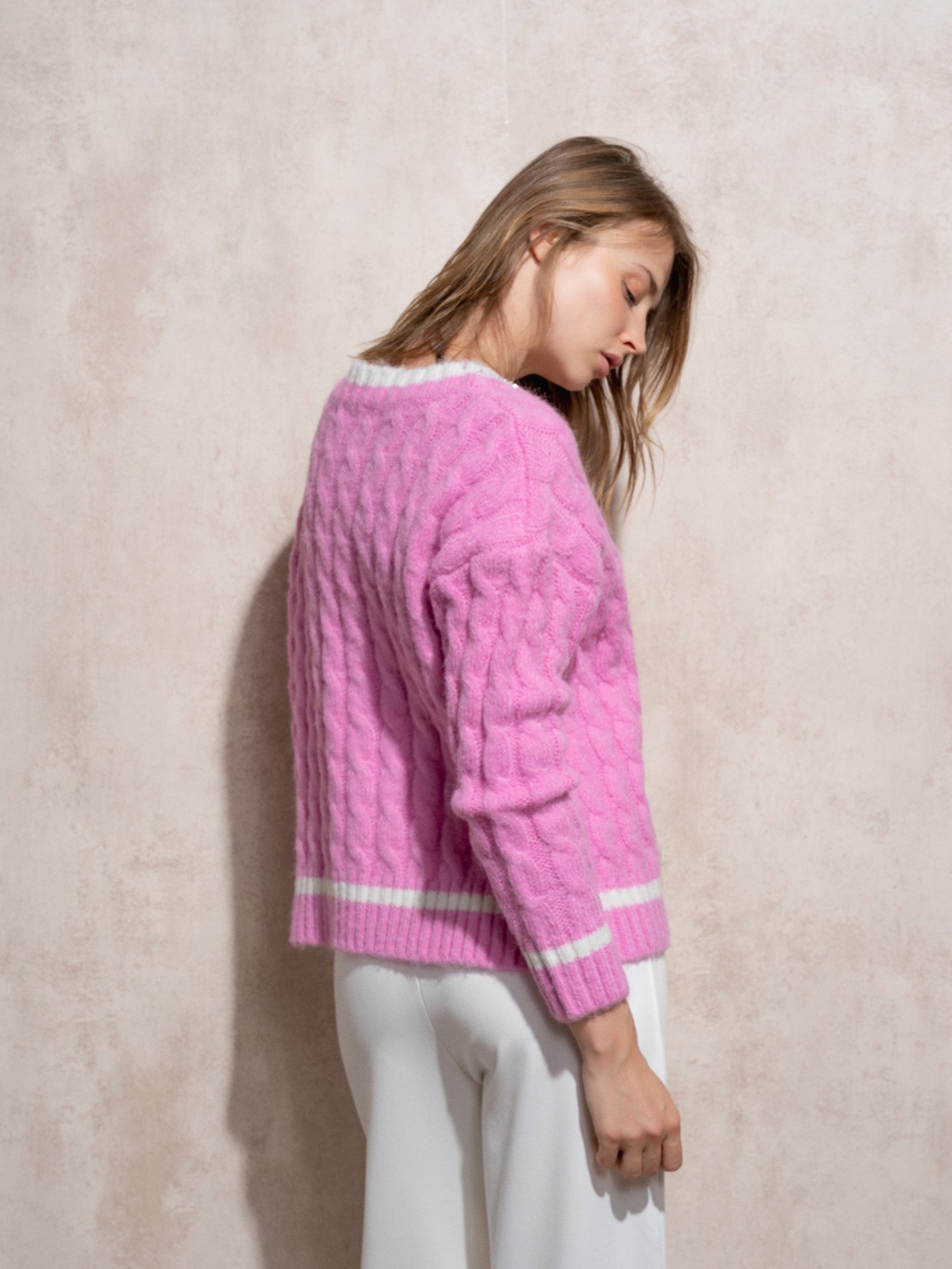 Camisola oversized de alha grossa com decote em V e strass branco.