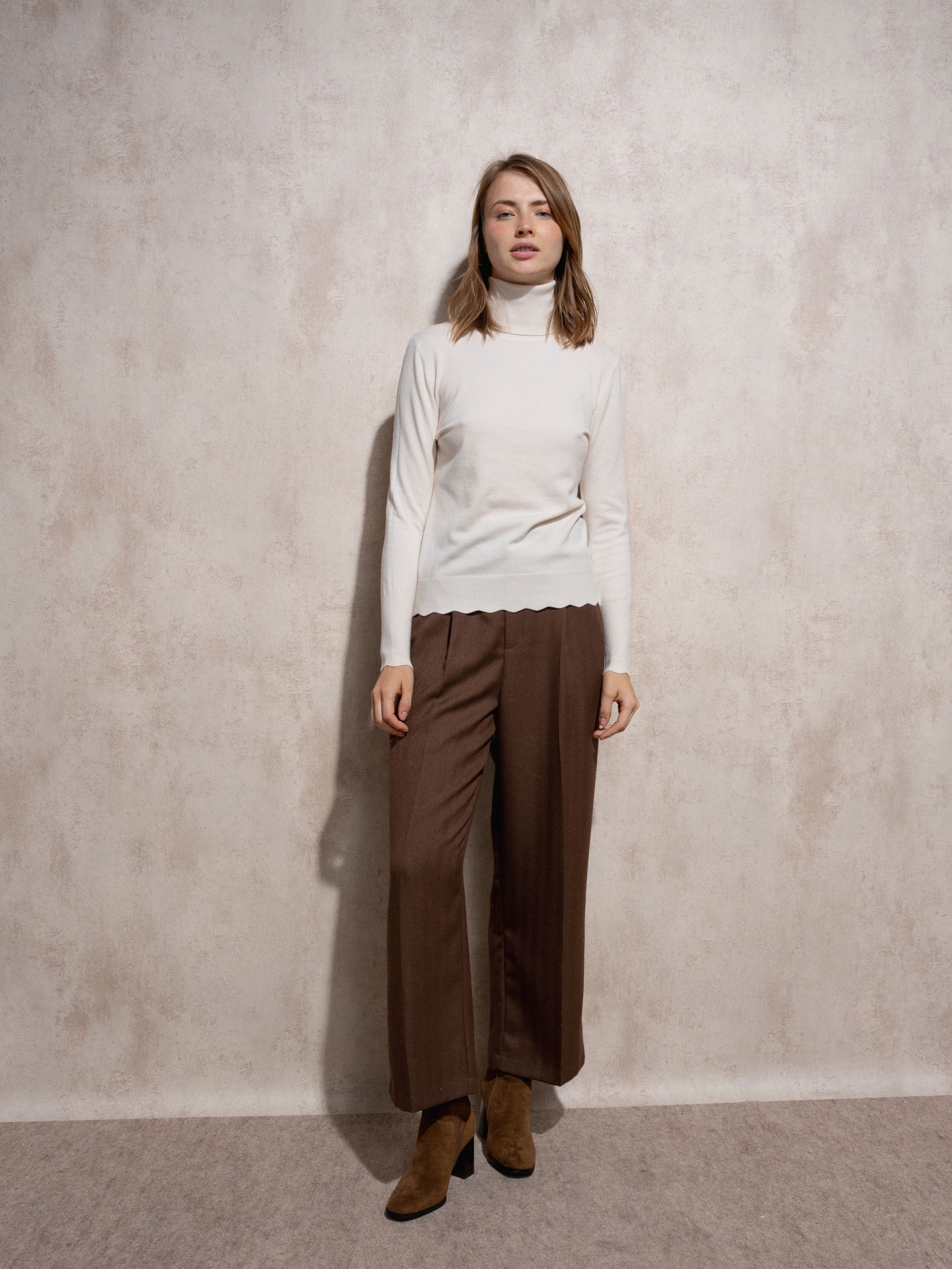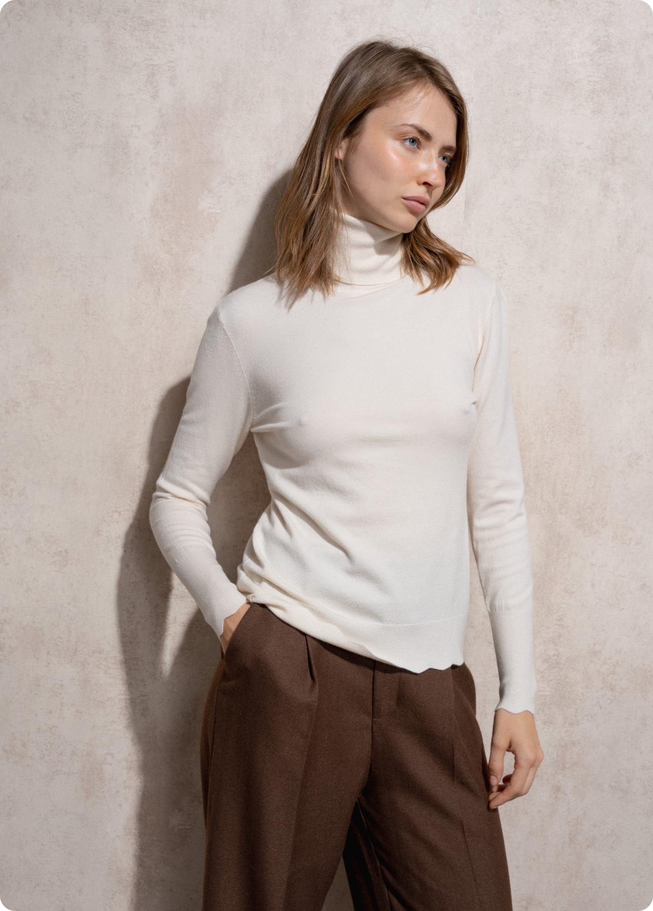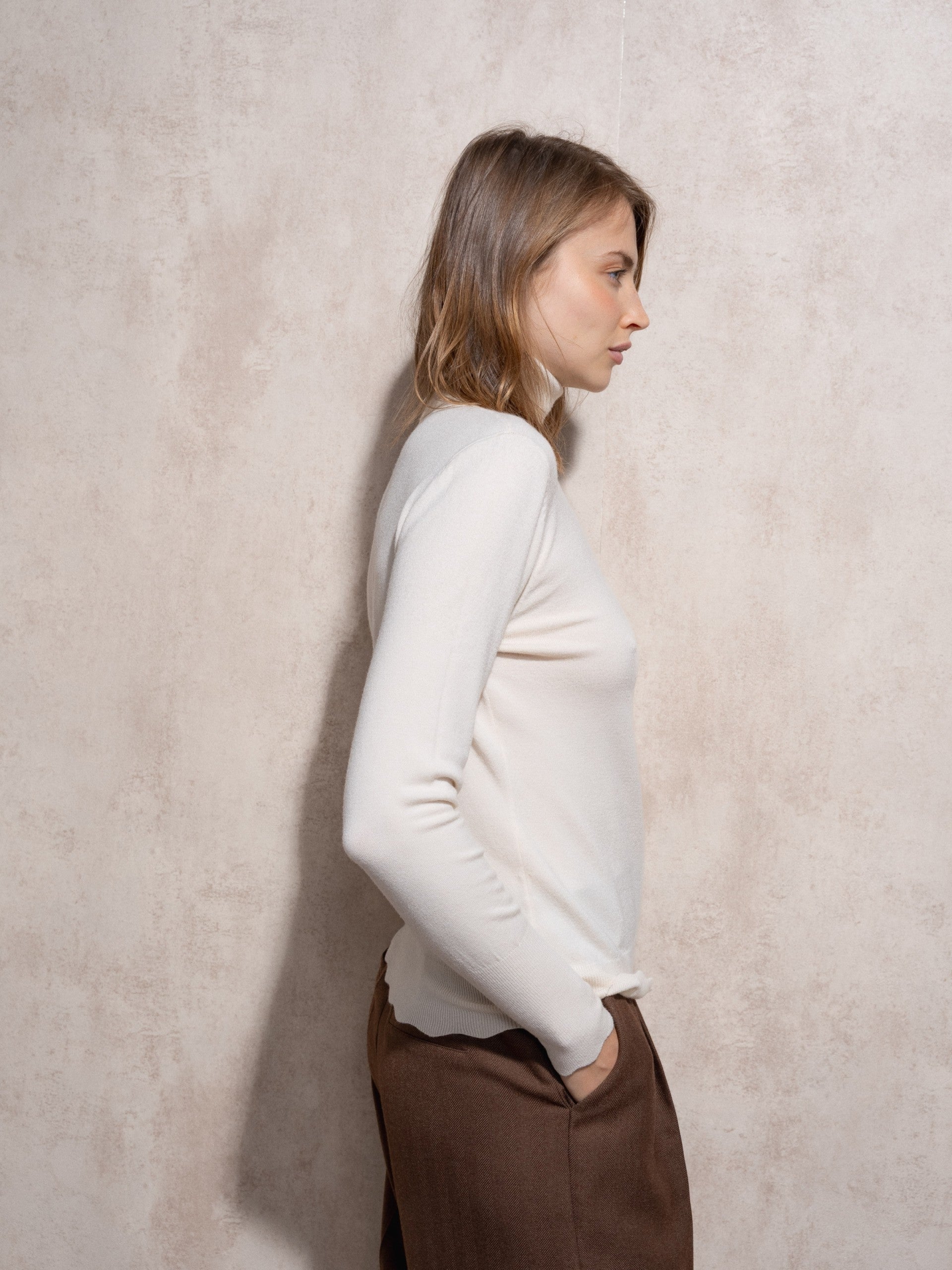 Camisola de gola alta em malha fina, suave e confortável, com um corte elegante que se adapta ao corpo sem marcar. Uma peça essencial e intemporal para looks sofisticados em qualquer estação.